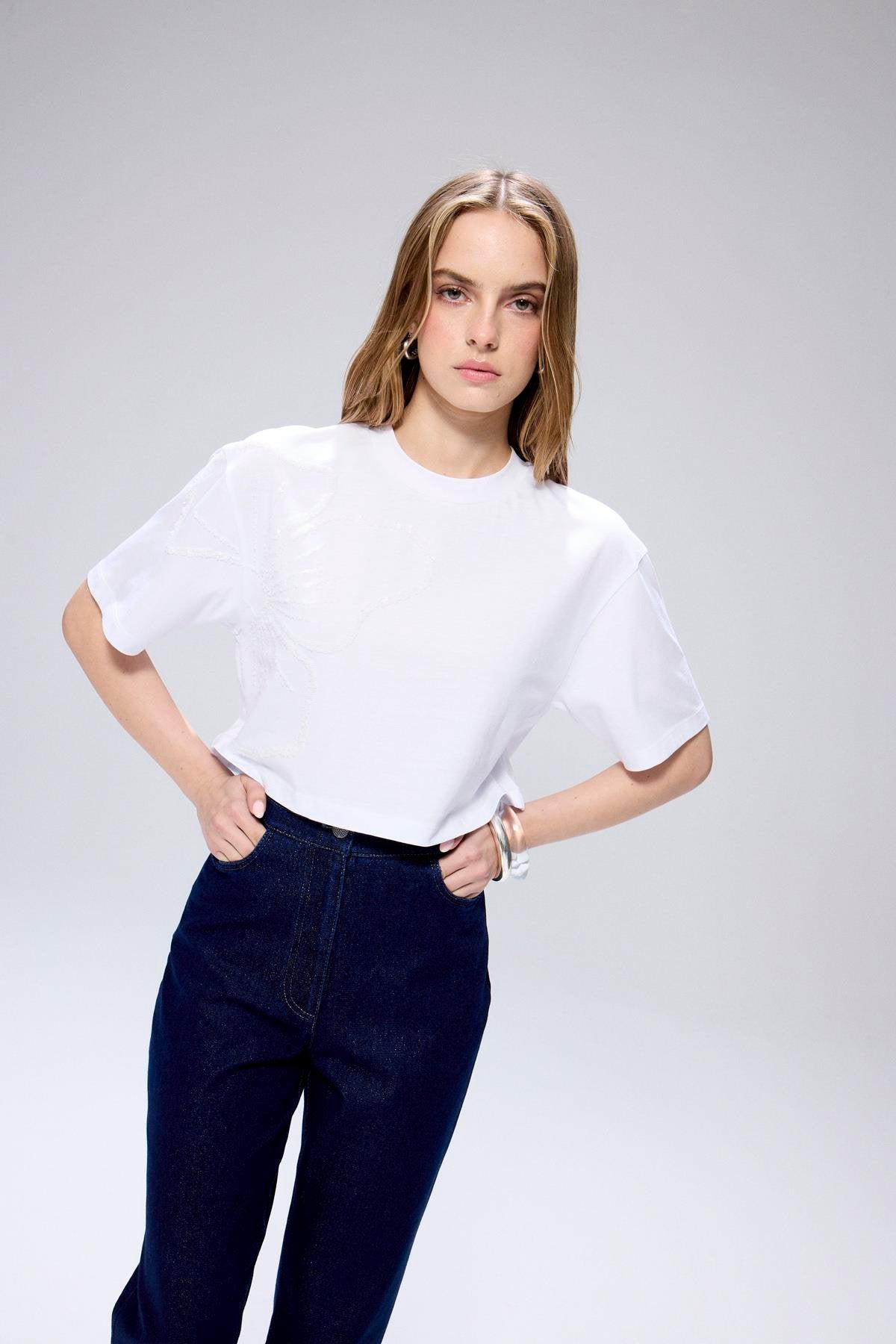 Çiçek Nakış Detaylı Crop Beyaz Tişört
