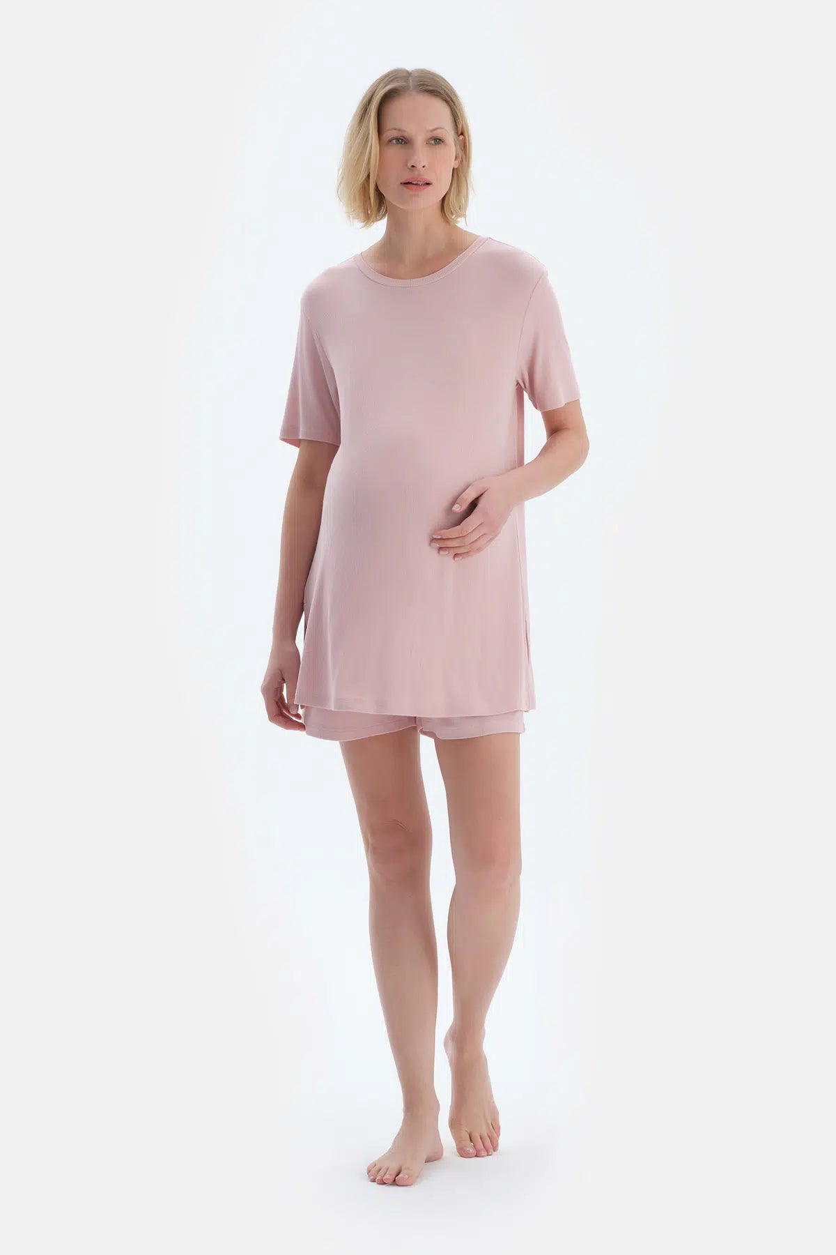 Açık Pembe Kaşkorse Hamile Tişört Şort Pijama Takımı