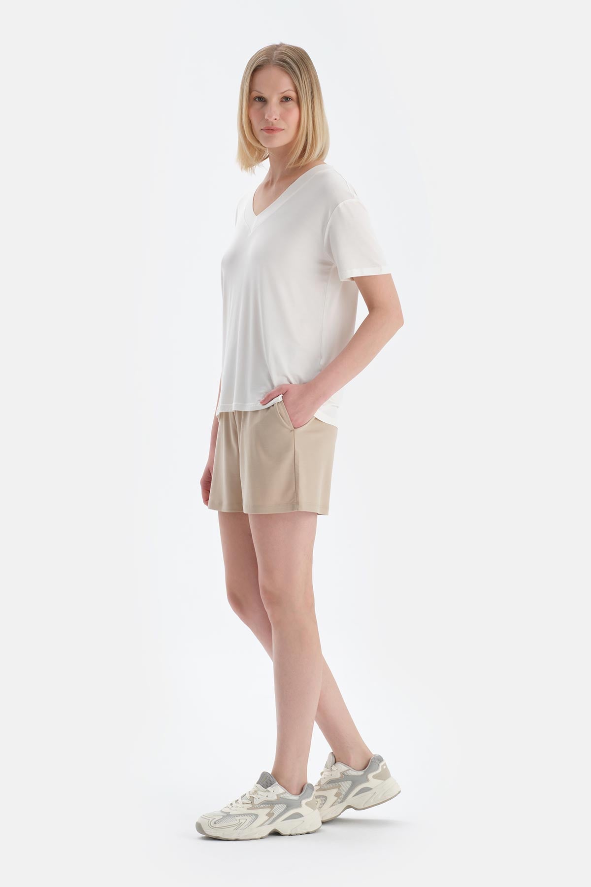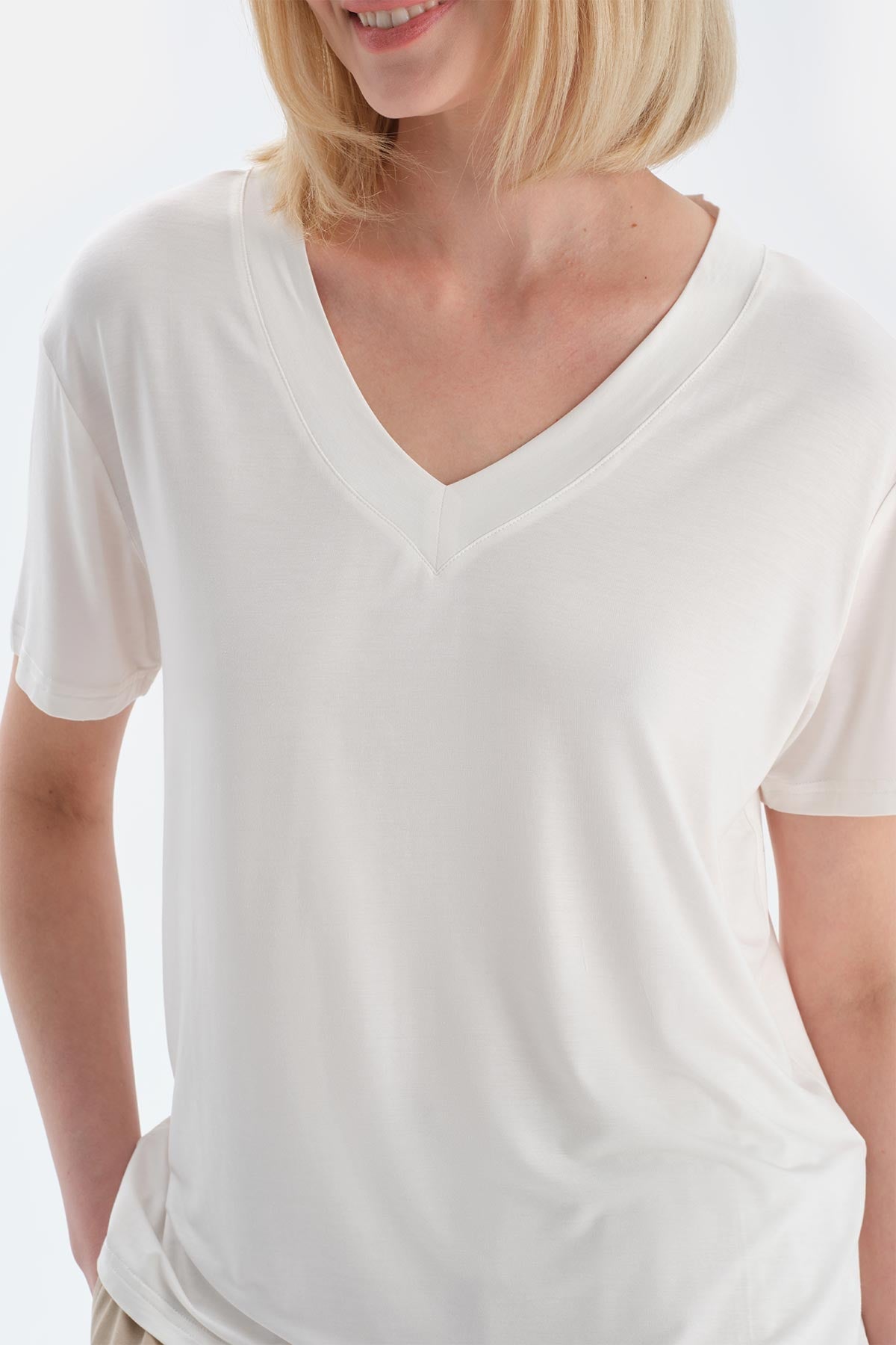Ekru V Yaka Kısa Kollu Modal Tişört