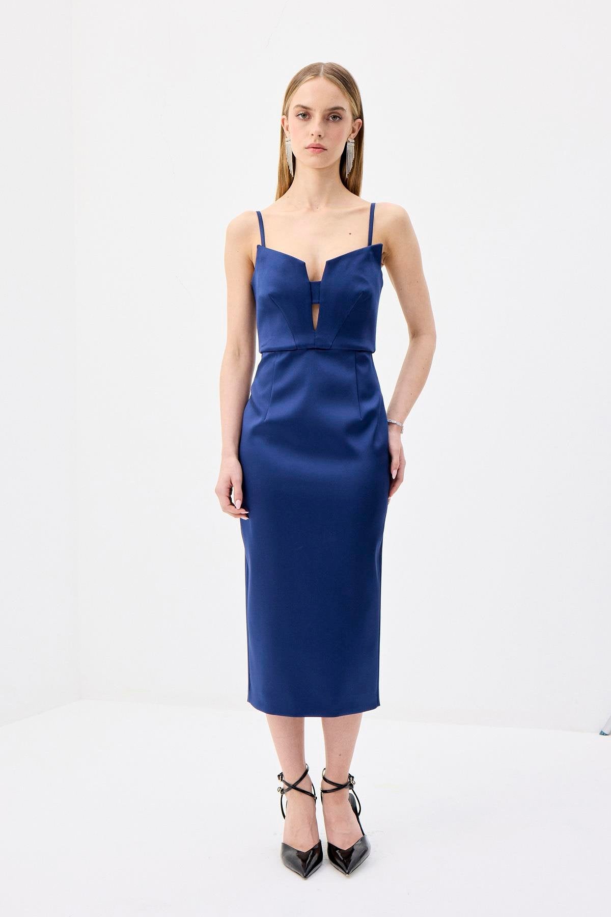 Degaje Detaylı Yırtmaçlı Lacivert Midi Elbise
