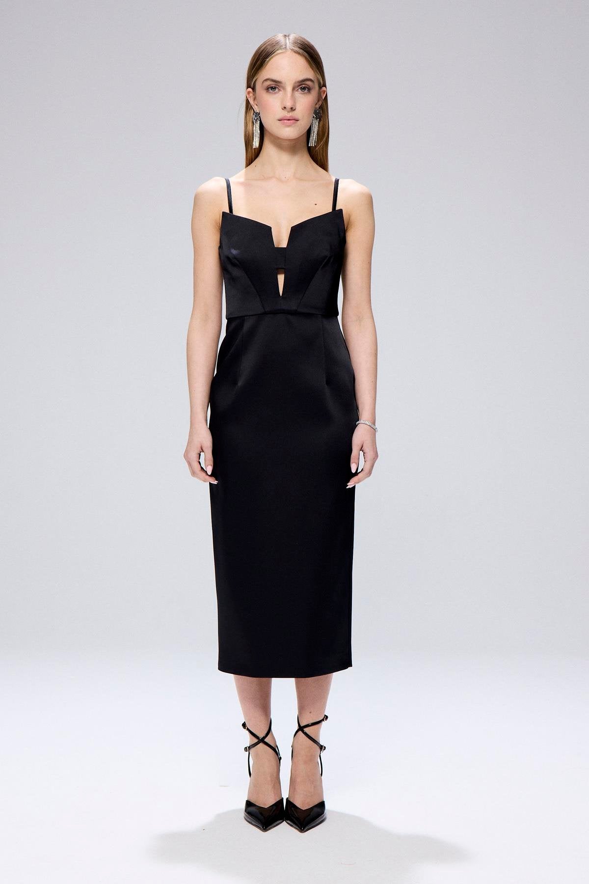 Degaje Detaylı Yırtmaçlı Siyah Midi Elbise