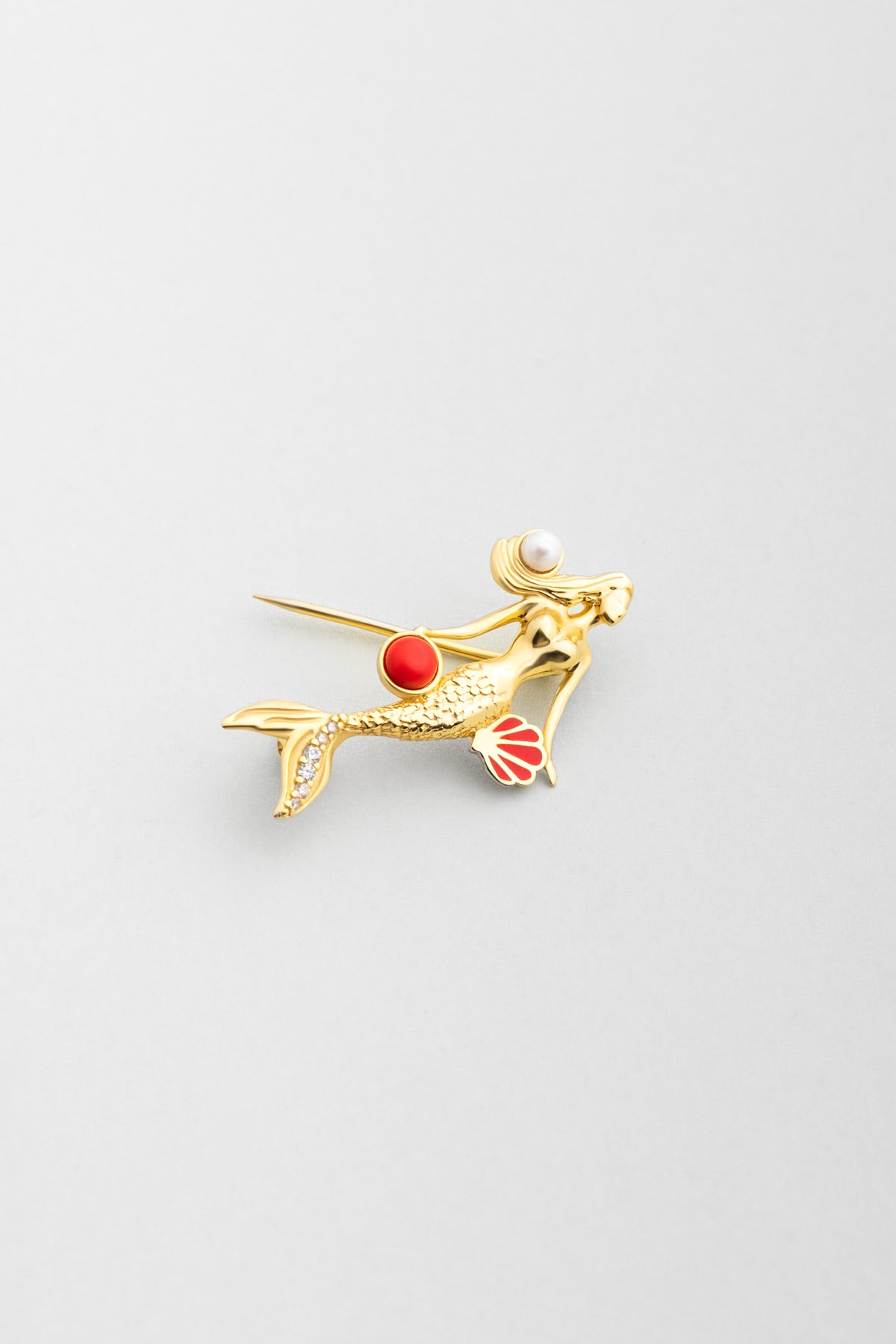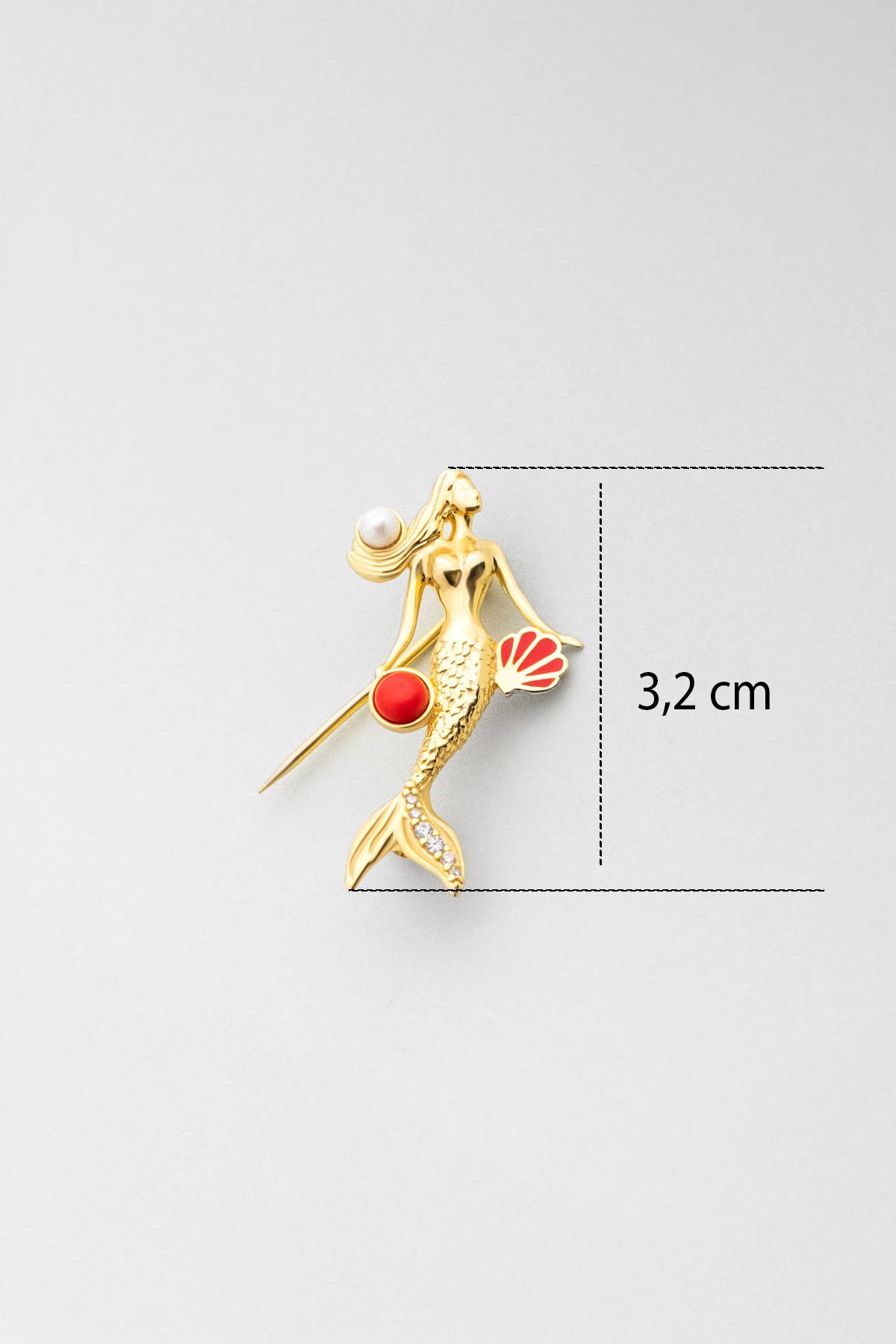 Deniz Kızı 18 Ayar Sarı Altın Kaplama Gümüş Mercan Broş 07311100844