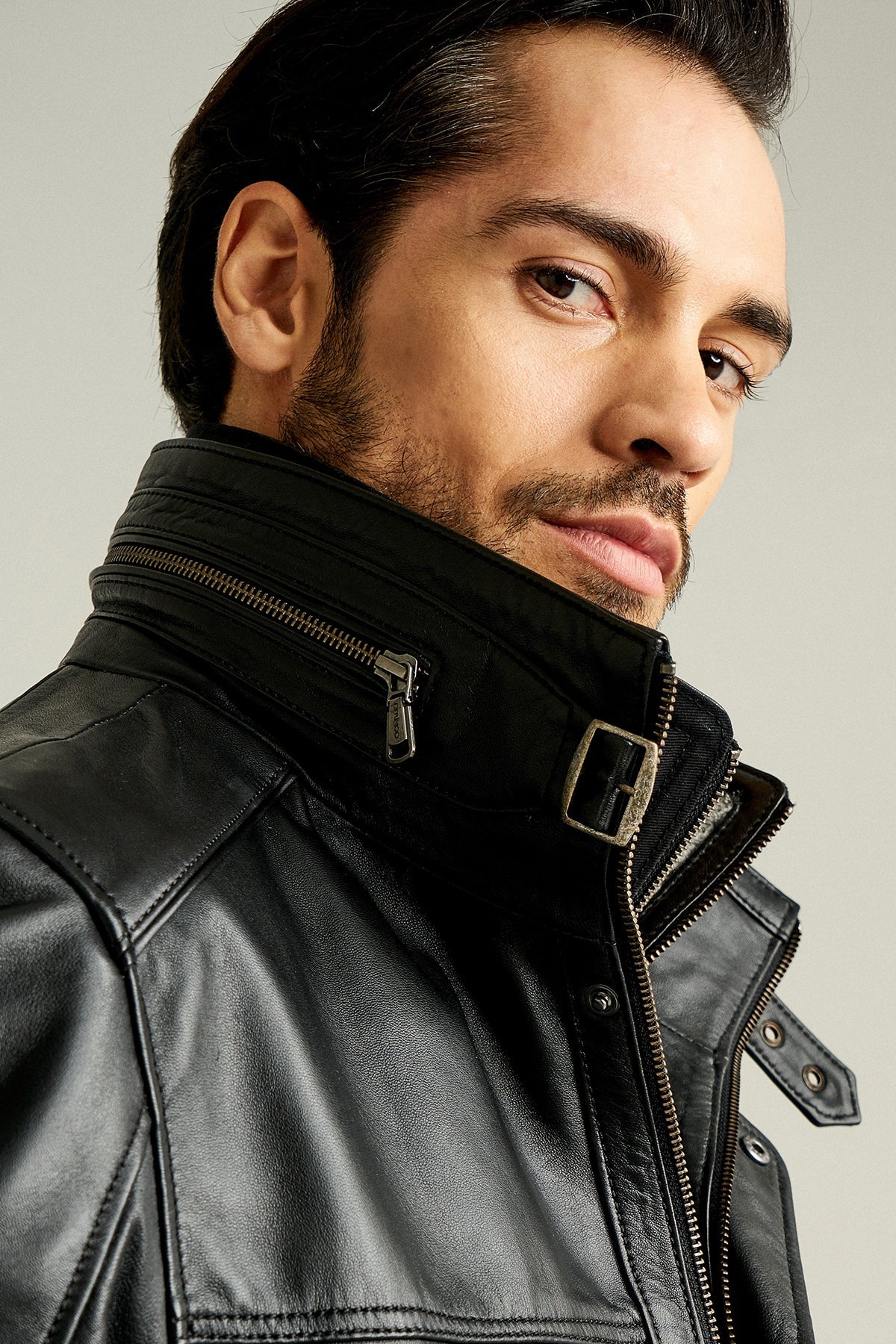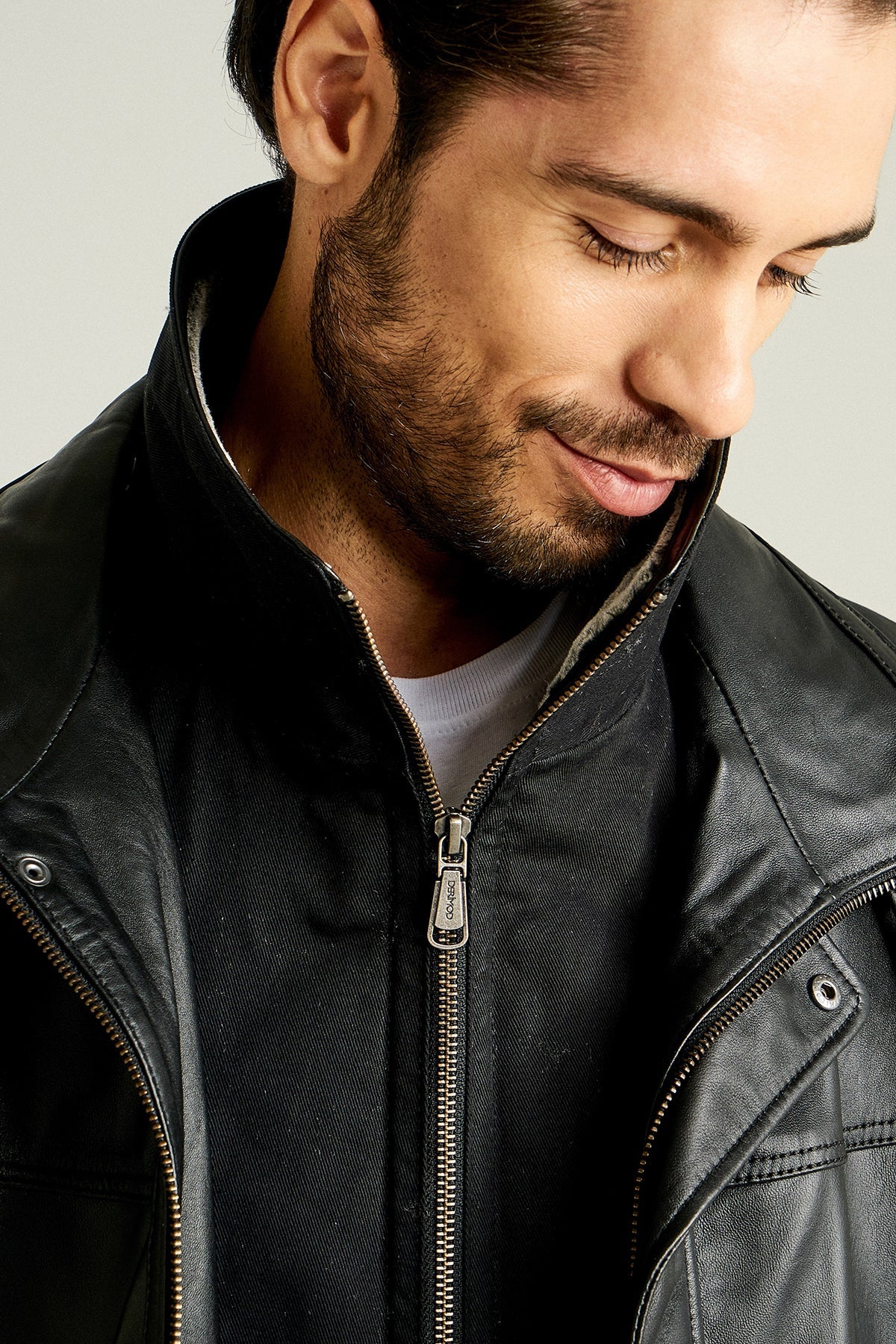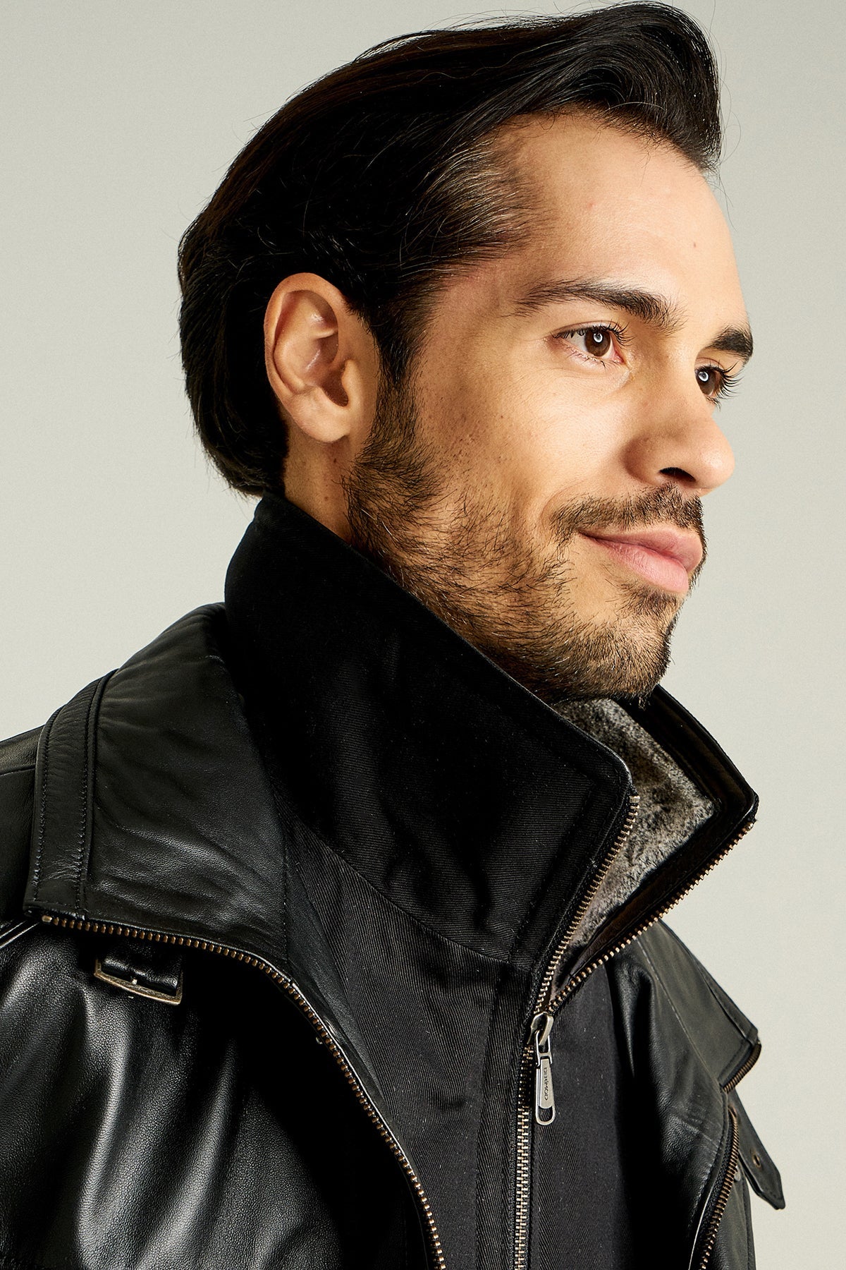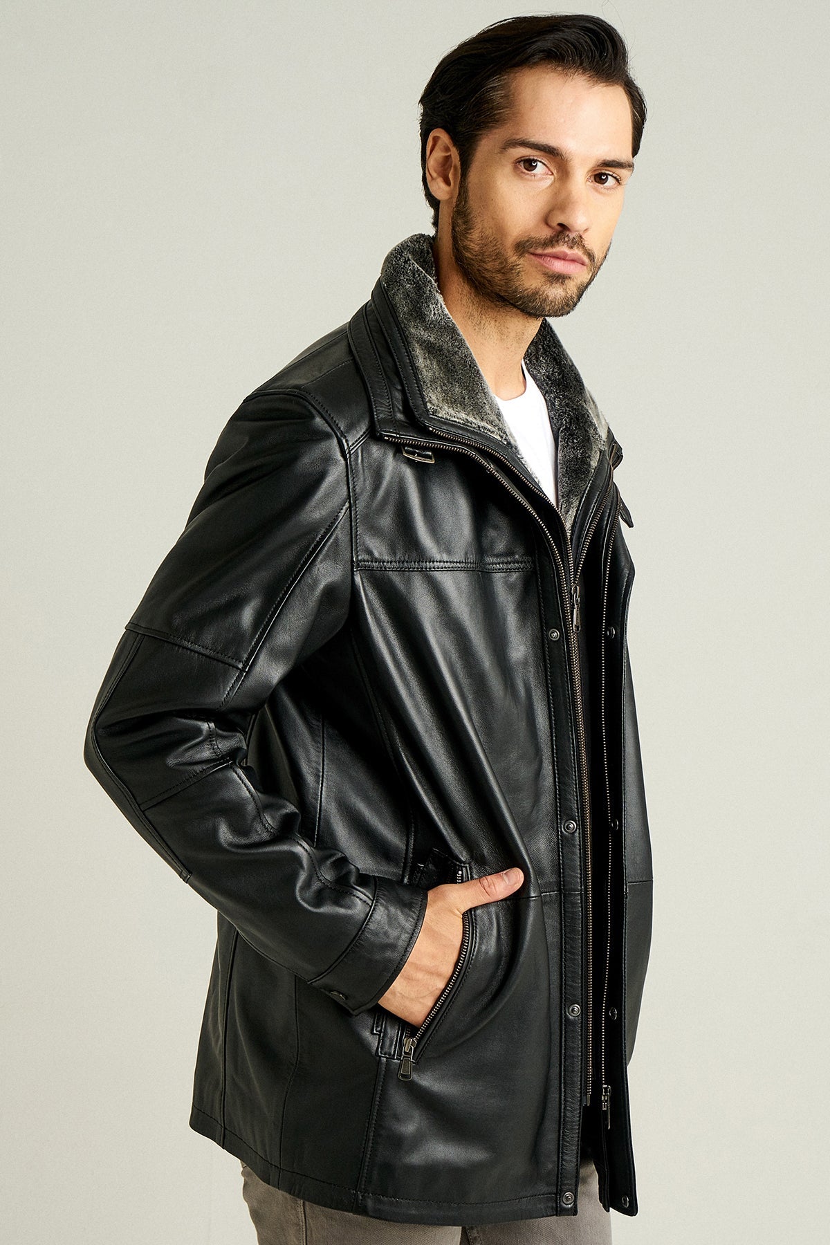 Eduardo Erkek Siyah Çift Yakalı Kürklü Deri Kaban