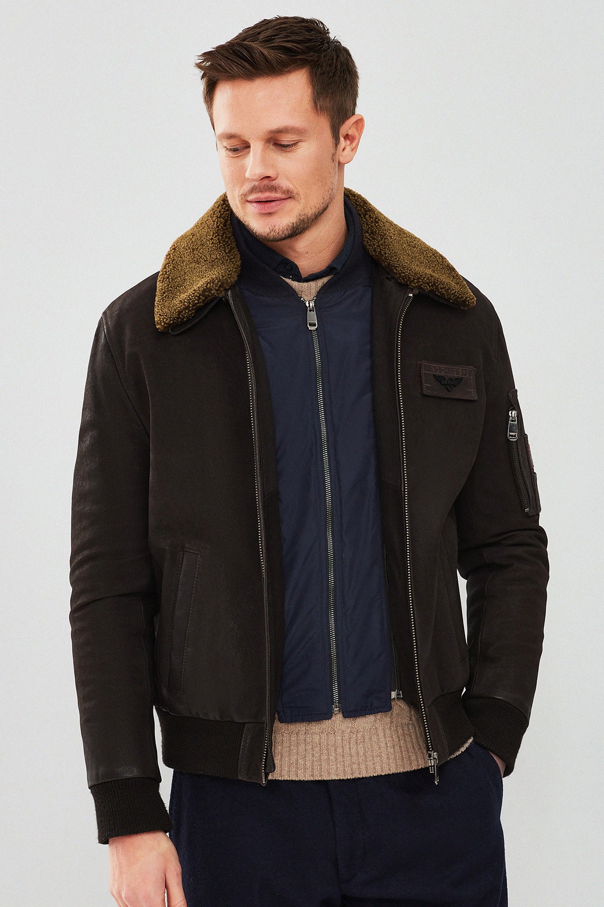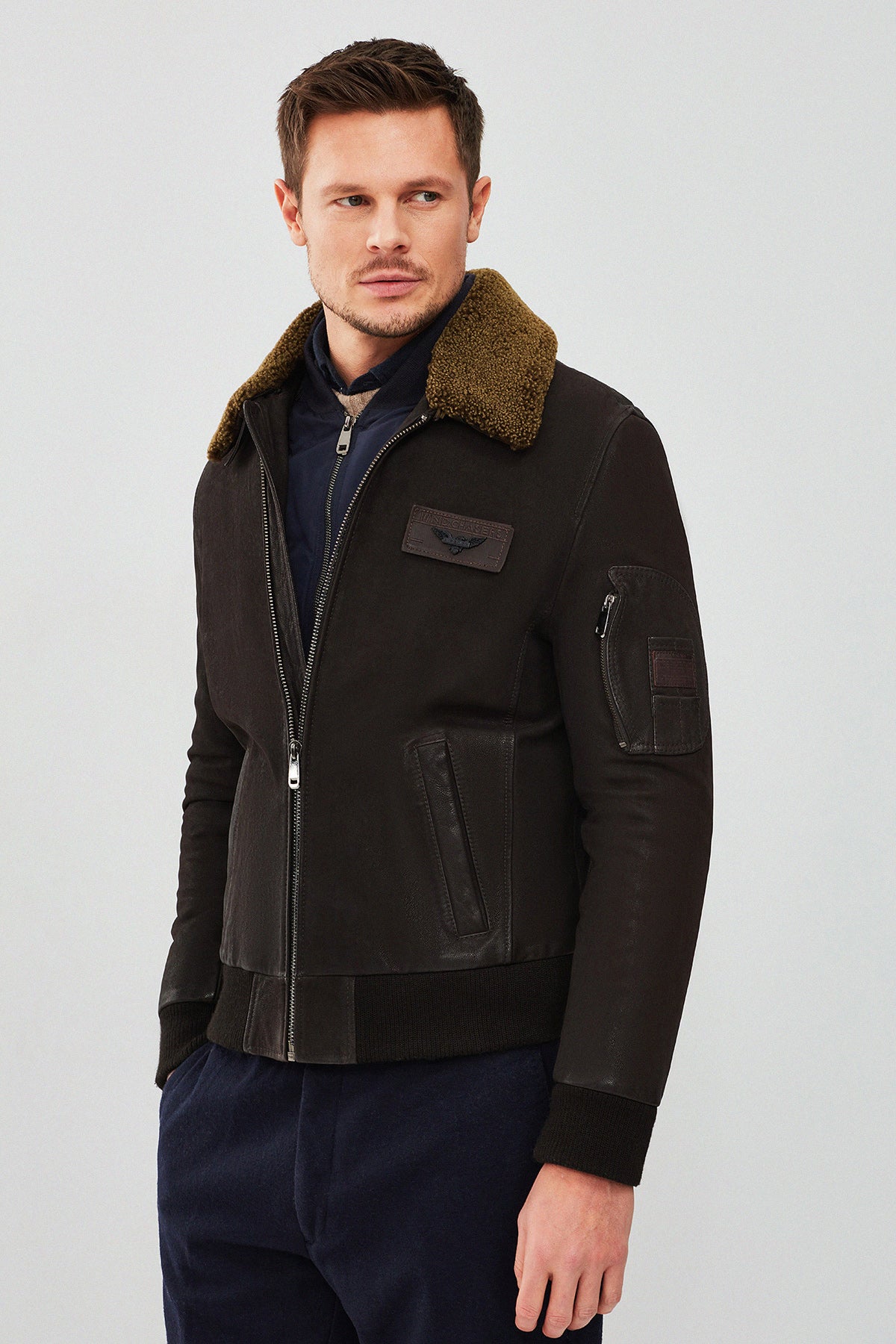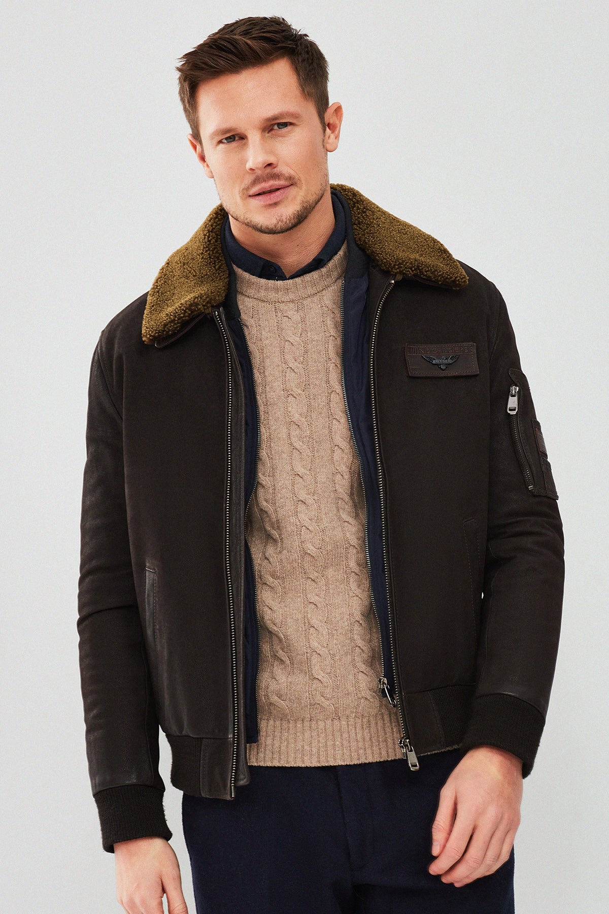 Falcon Erkek Kahverengi Armalı Yaka Kürklü Deri Pilot Ceket