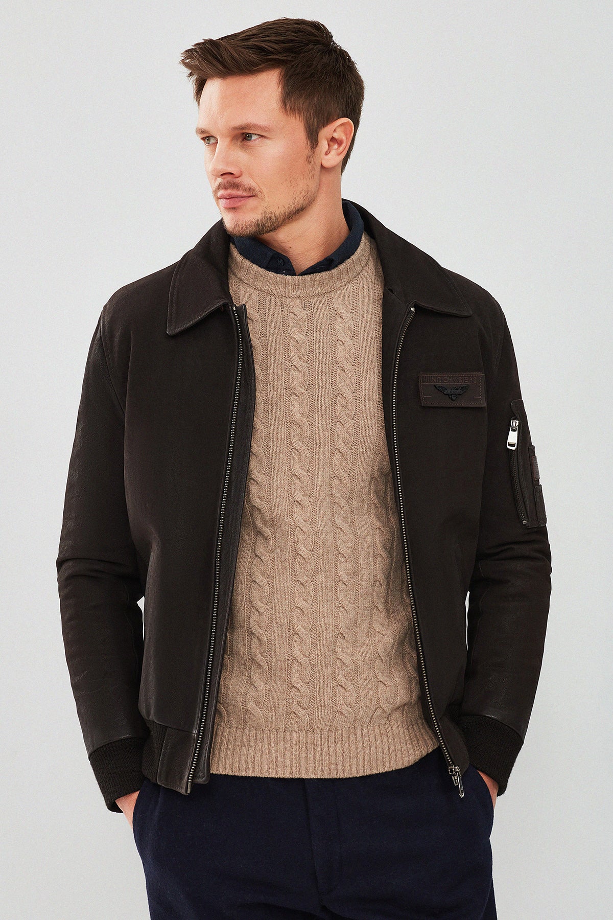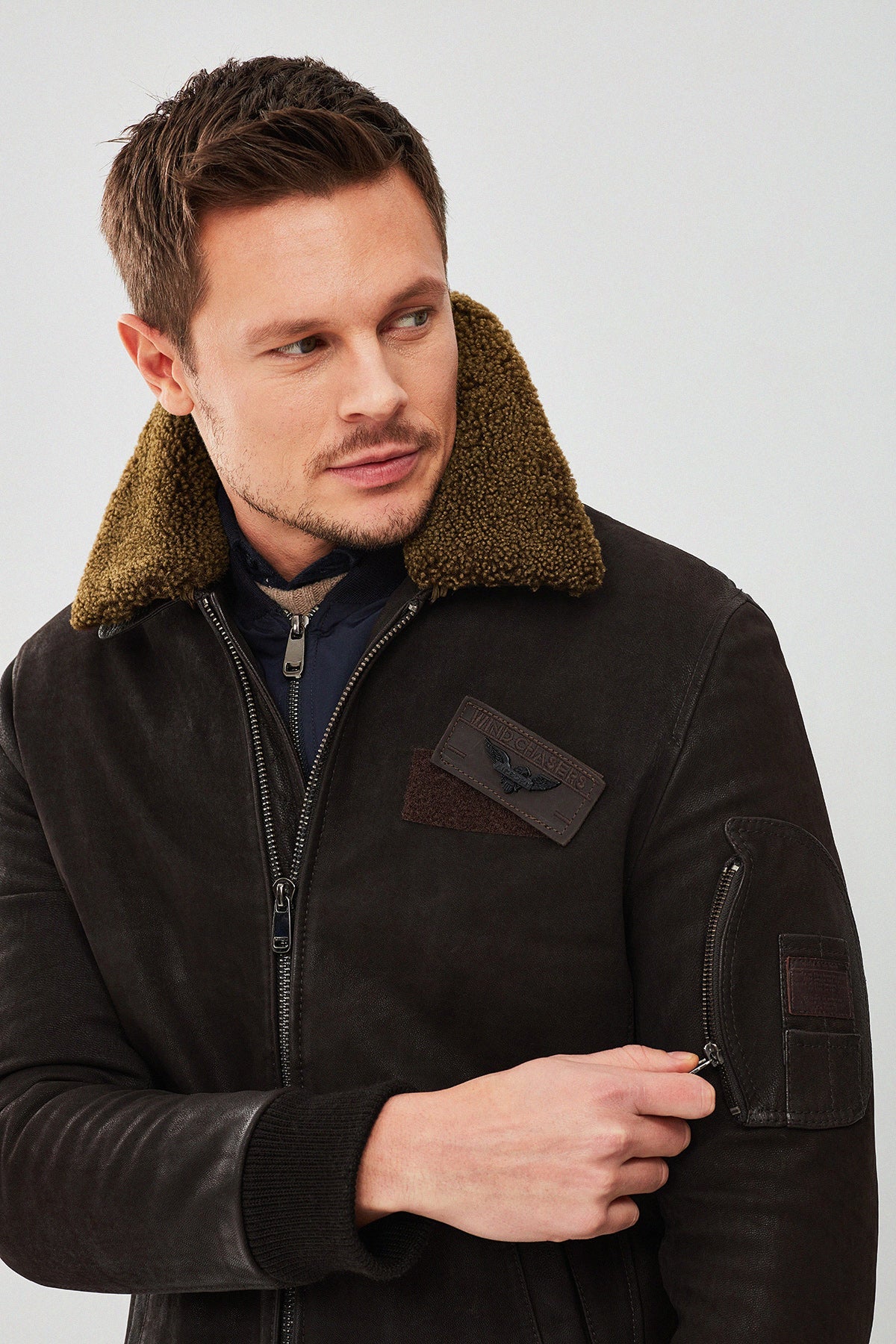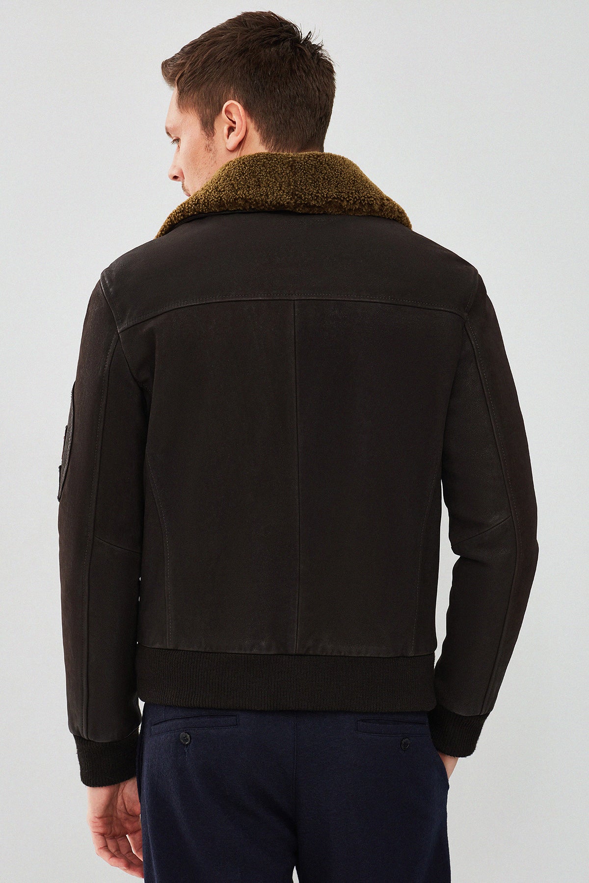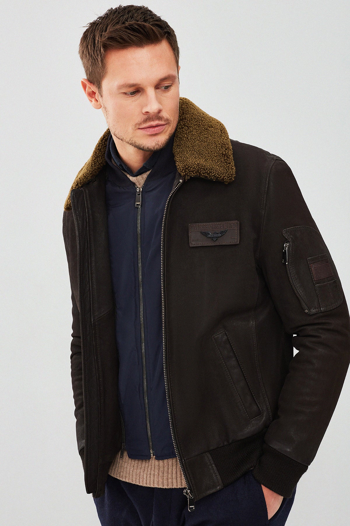 Falcon Erkek Kahverengi Armalı Yaka Kürklü Deri Pilot Ceket