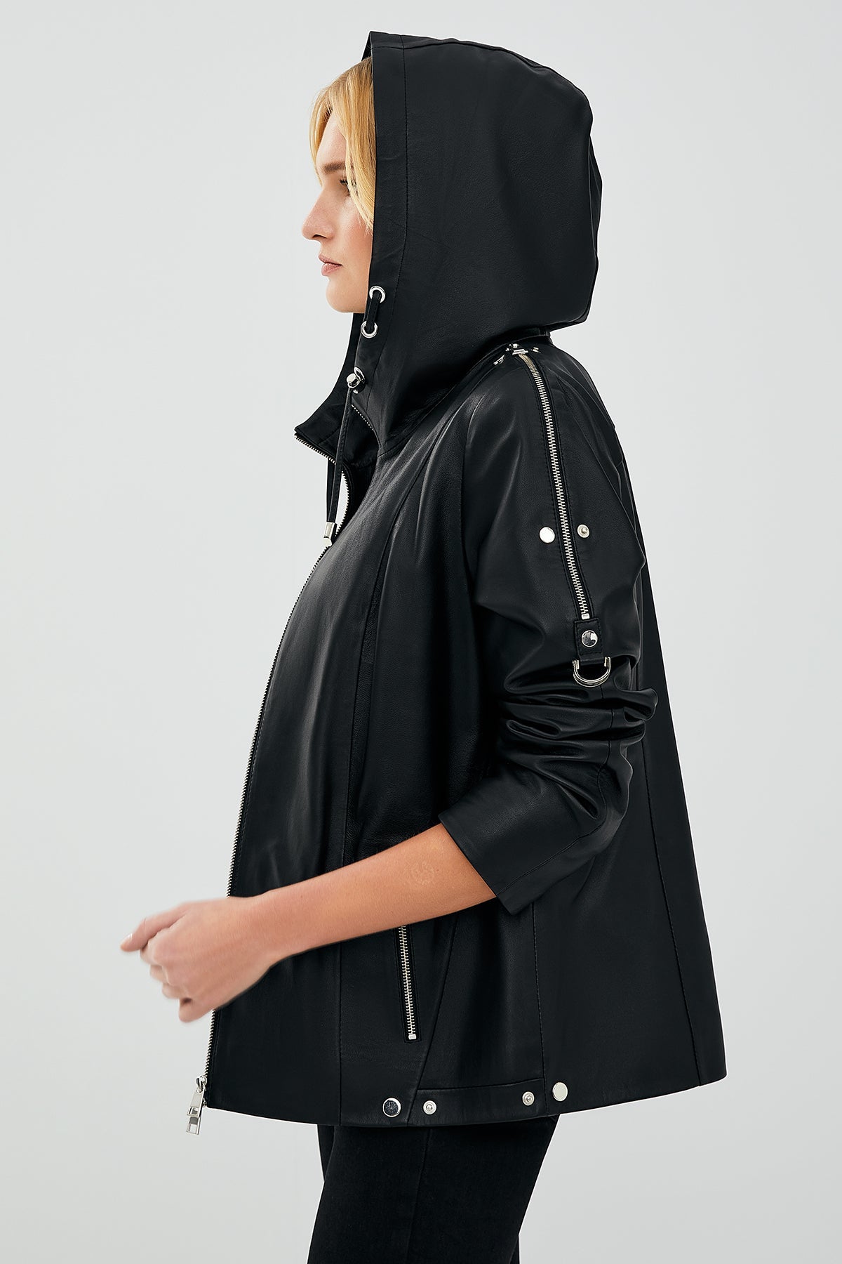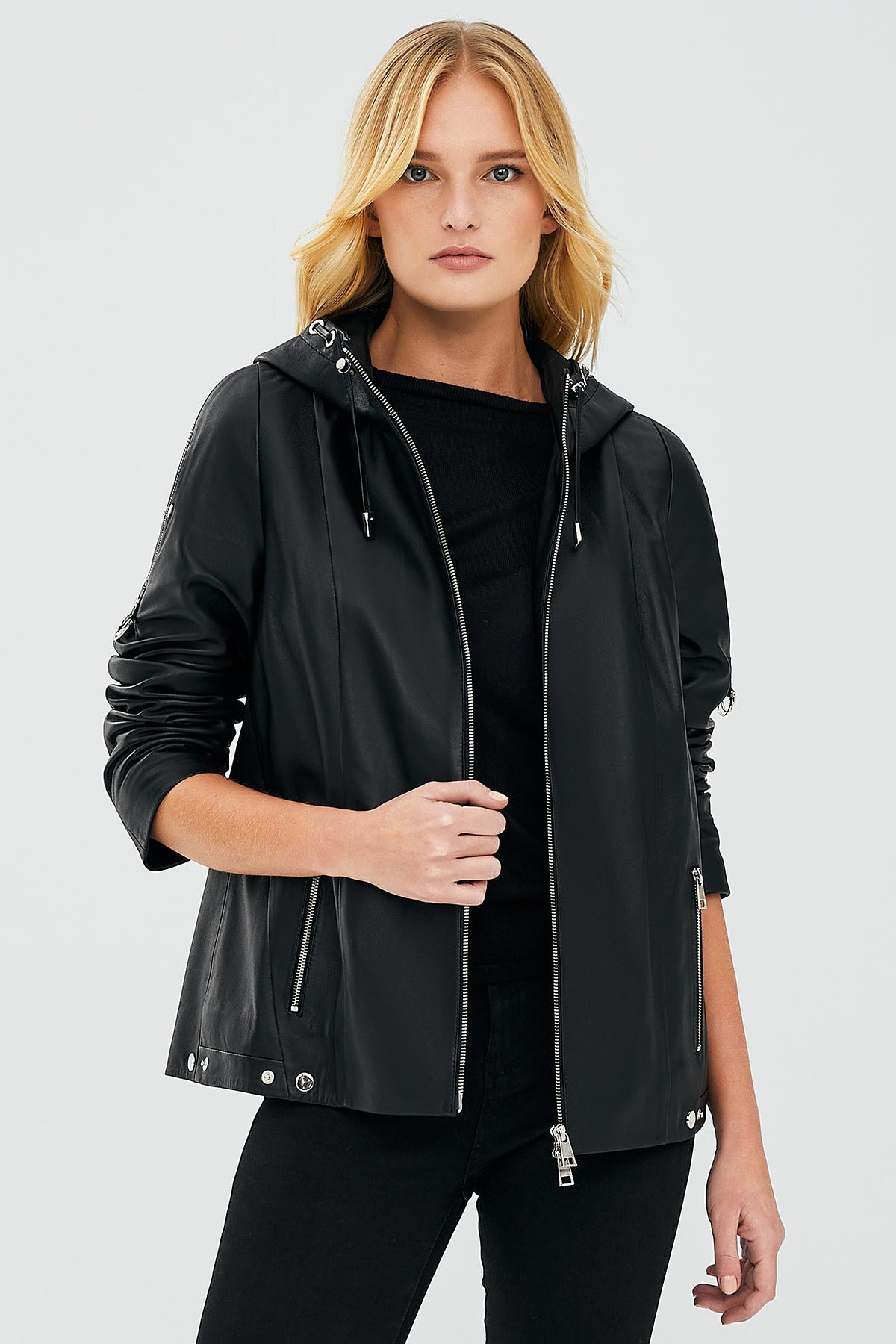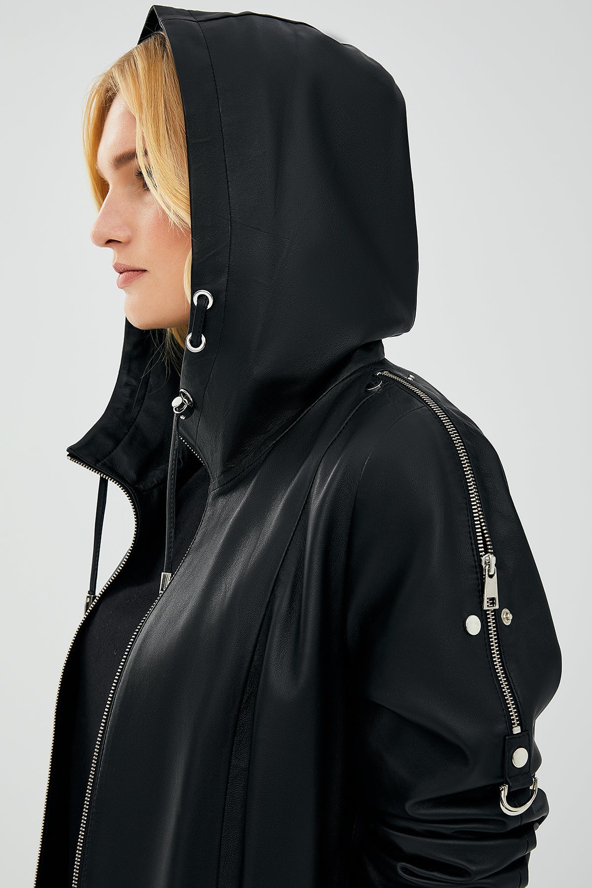 Judith Kadın Siyah Kapüşonlu Deri Mont