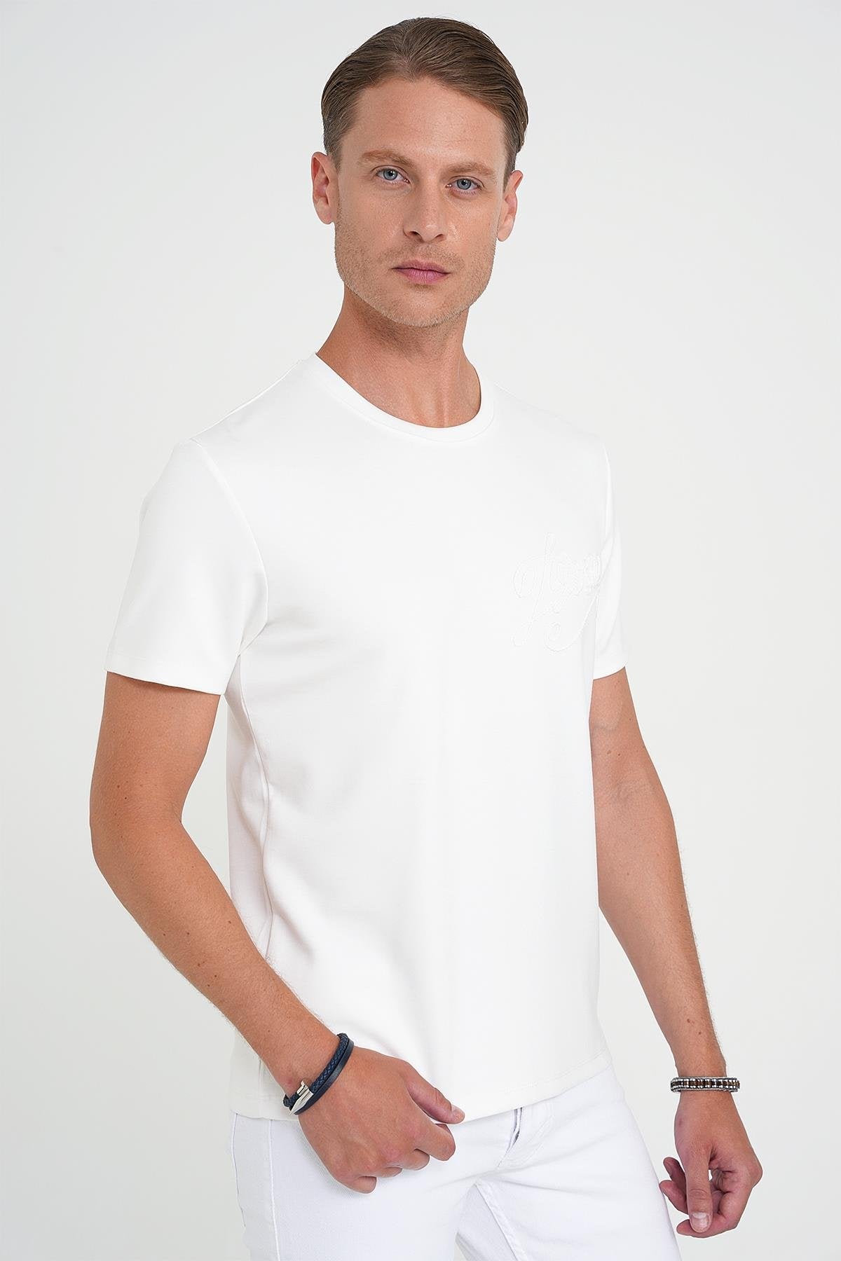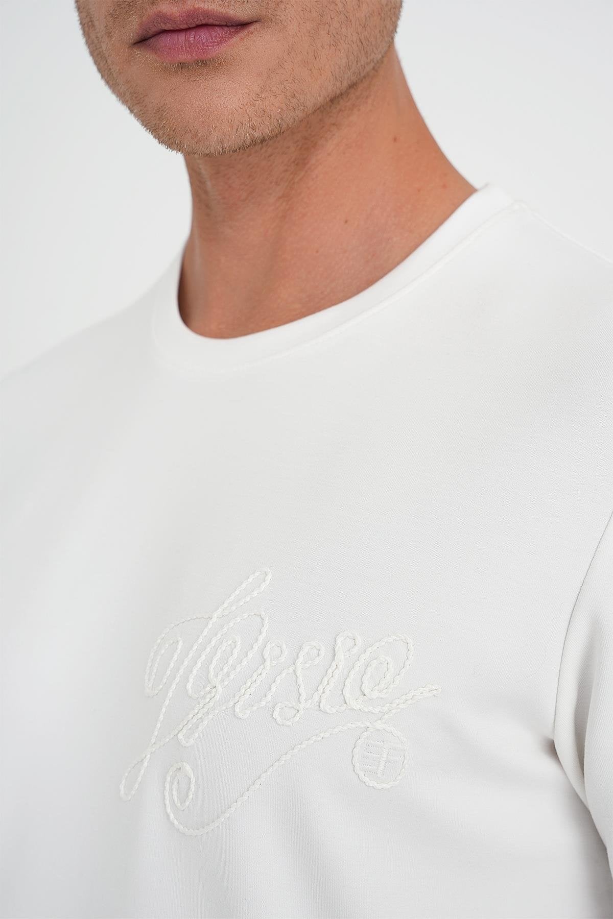 Comfort Fit Bisiklet Yaka Nakışlı Kısa Kol Ekru Pamuk Tişört Ts 910