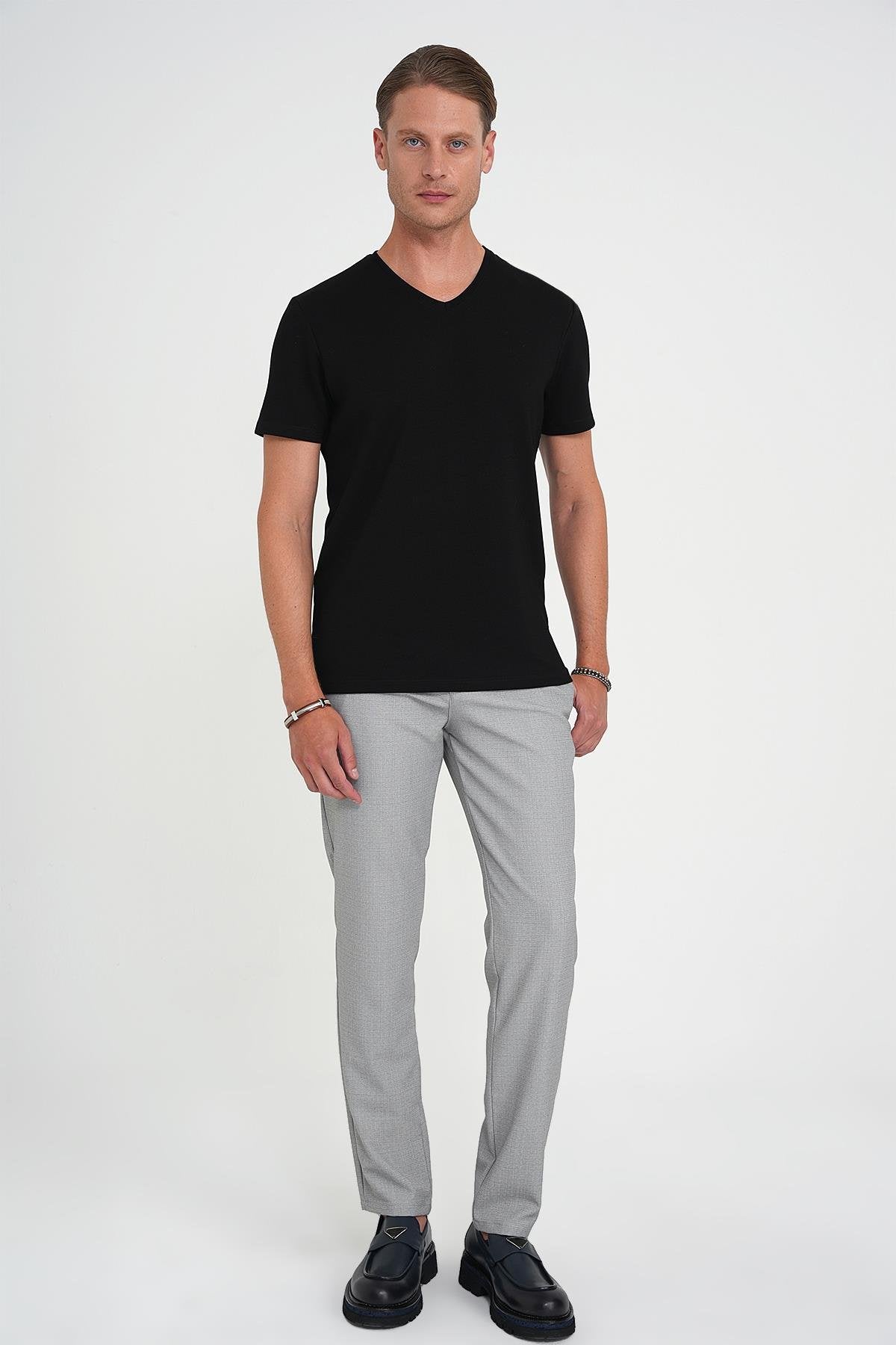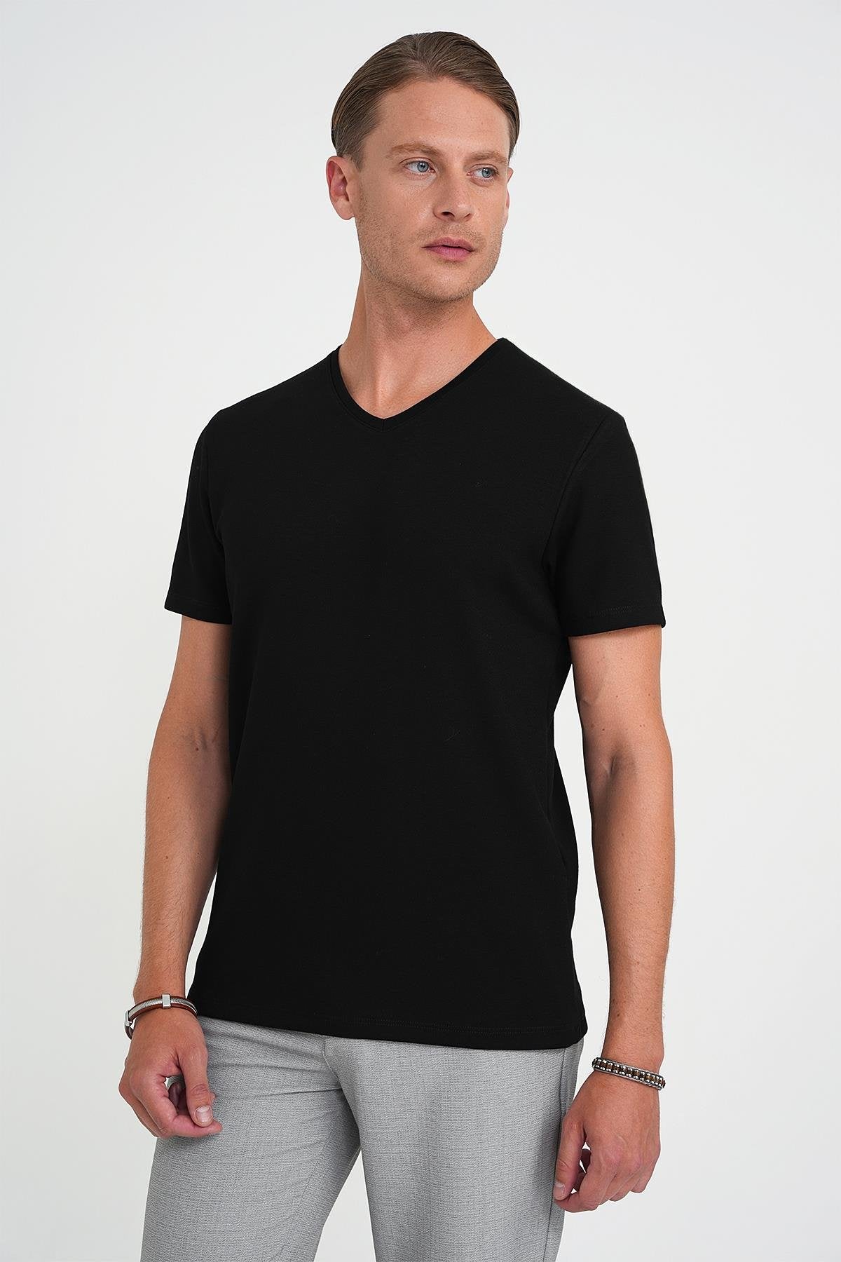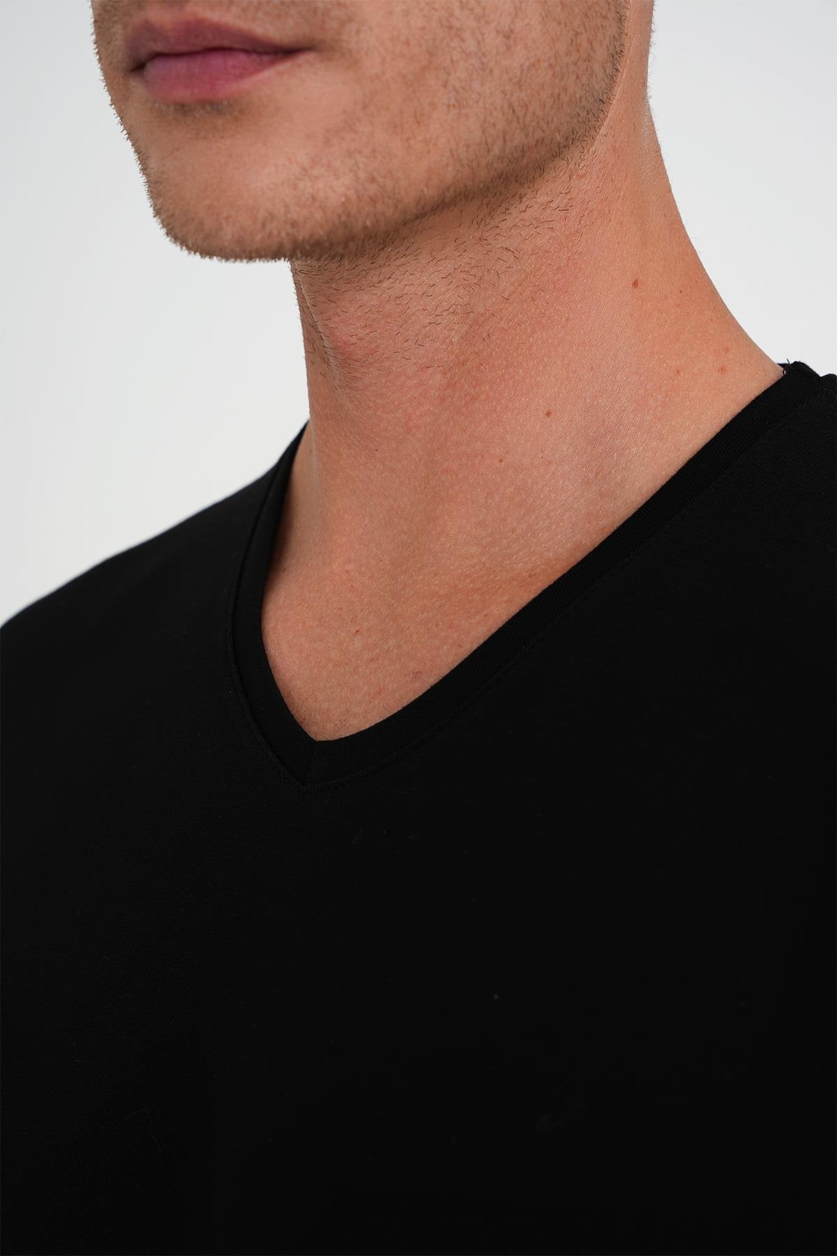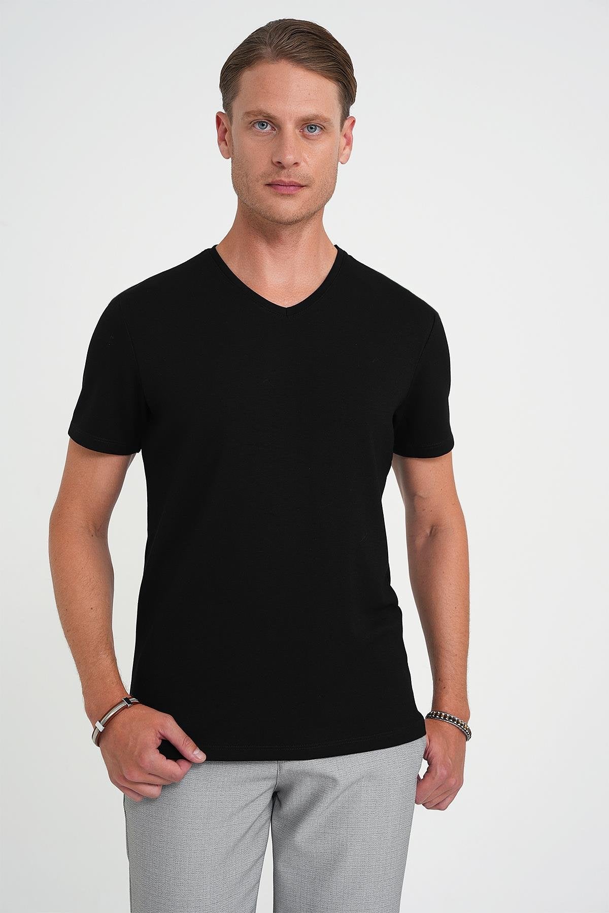Comfort Fit V Yaka Esnek Pamuk Düz Kısa Kol Siyah Tişört Ts 907