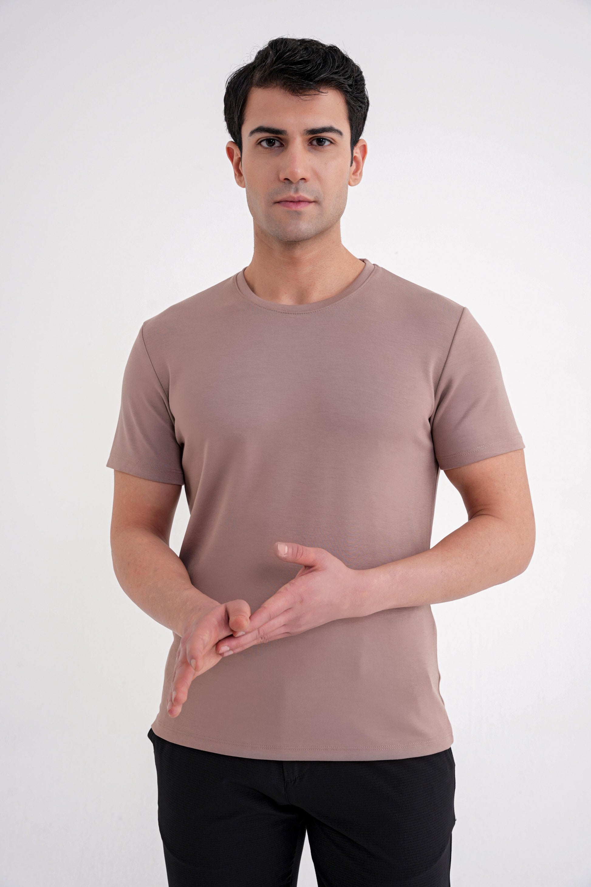 TS885Y0324_61Sezon: 25-26 KIŞKoleksiyon: Kalıp: ComfortDesen: DüzYaka: Bisiklet YakaKol Boyu: Kısa Kolİlikleme: DüğmesizCep: CepsizRenk: VİZONKarışım: %97 Pamuk % 3 ElastanHayvansal Menşeli: Manken Ölçüleri: Boy:190 cm Omuz:53 Gögüs:100 cm Bel:92 cm Basen:100Numune Beden: 48/M/32