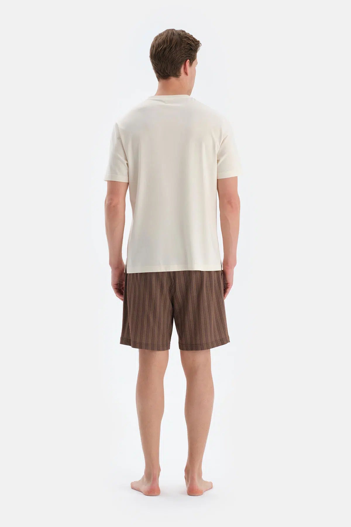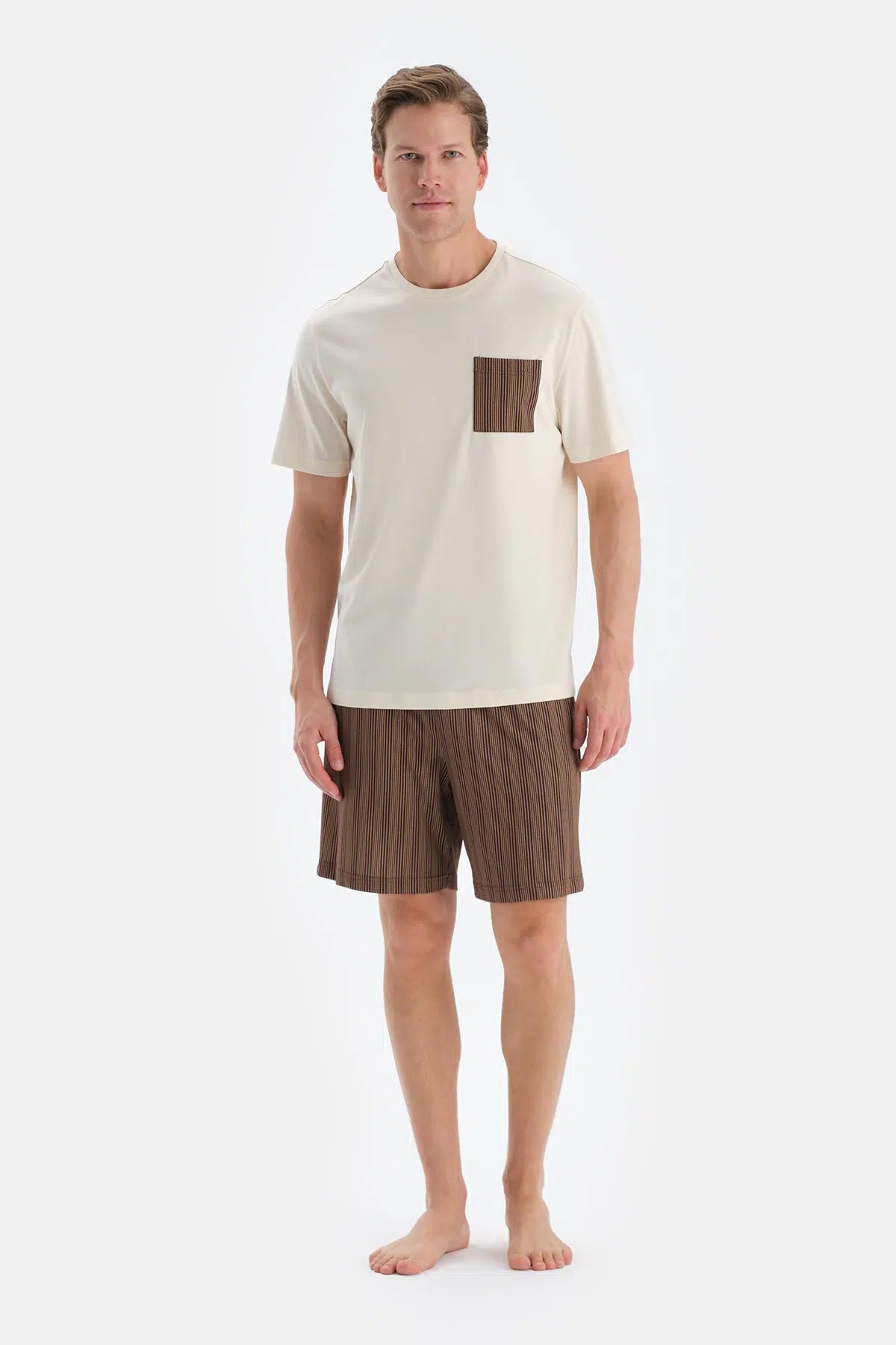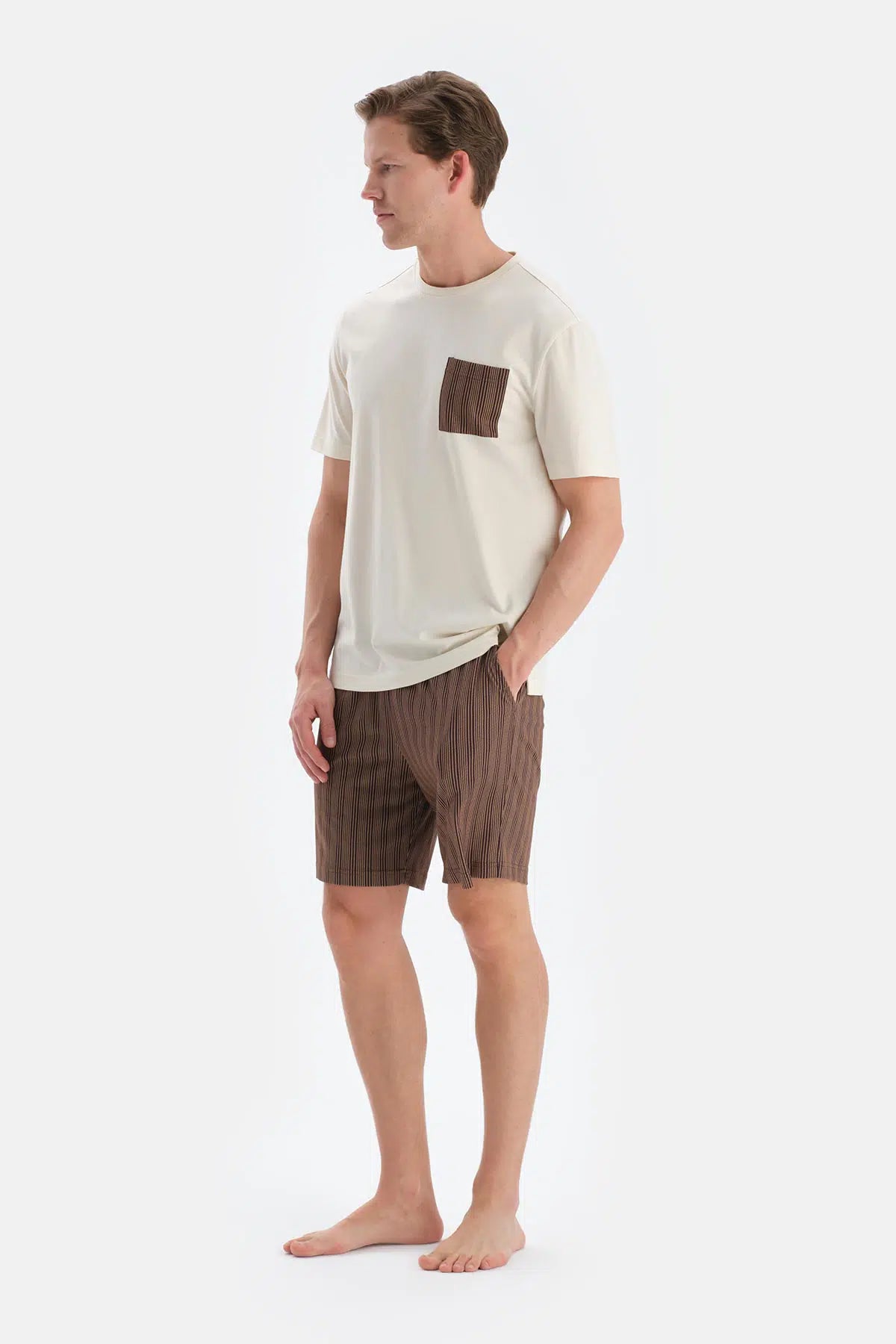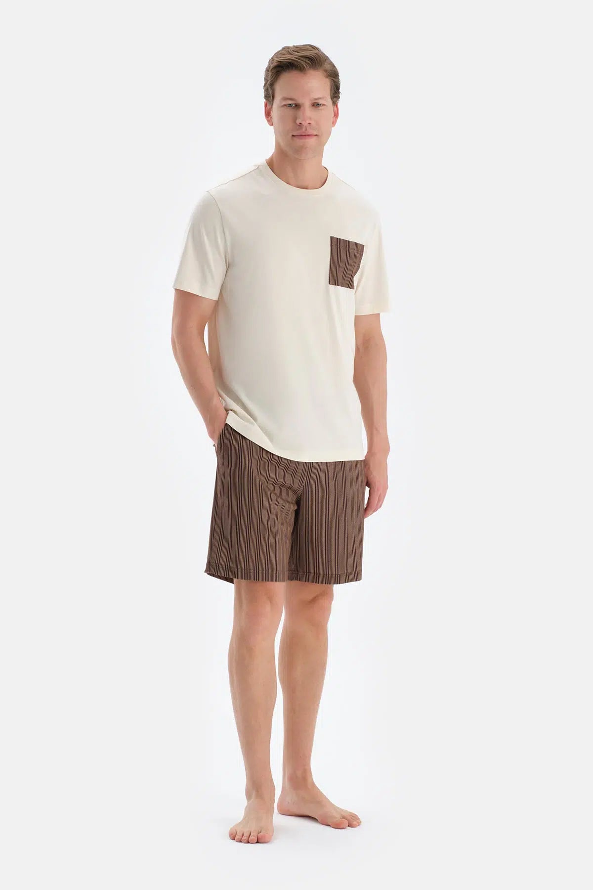 Ekru Cep Detaylı Kısa Kollu Tişört Şort Pijama Takımı