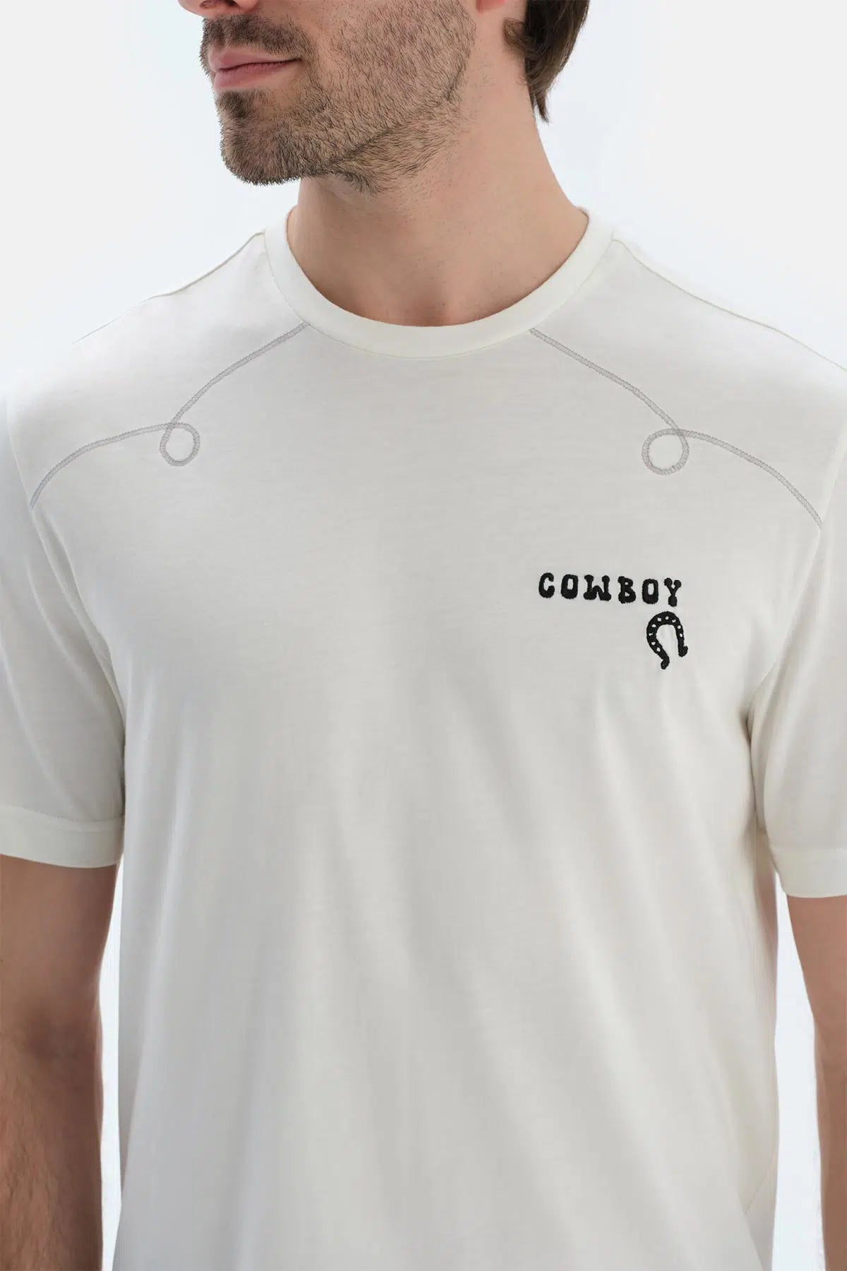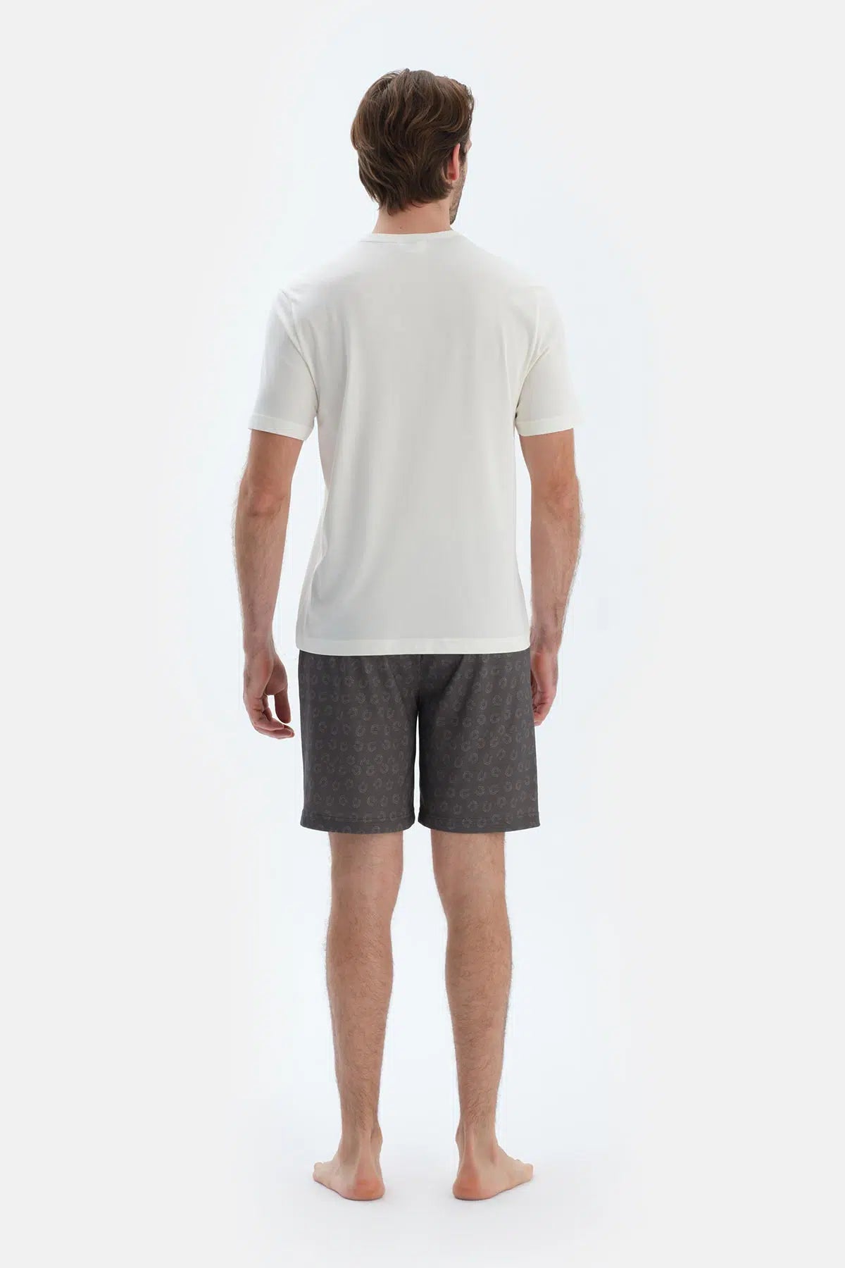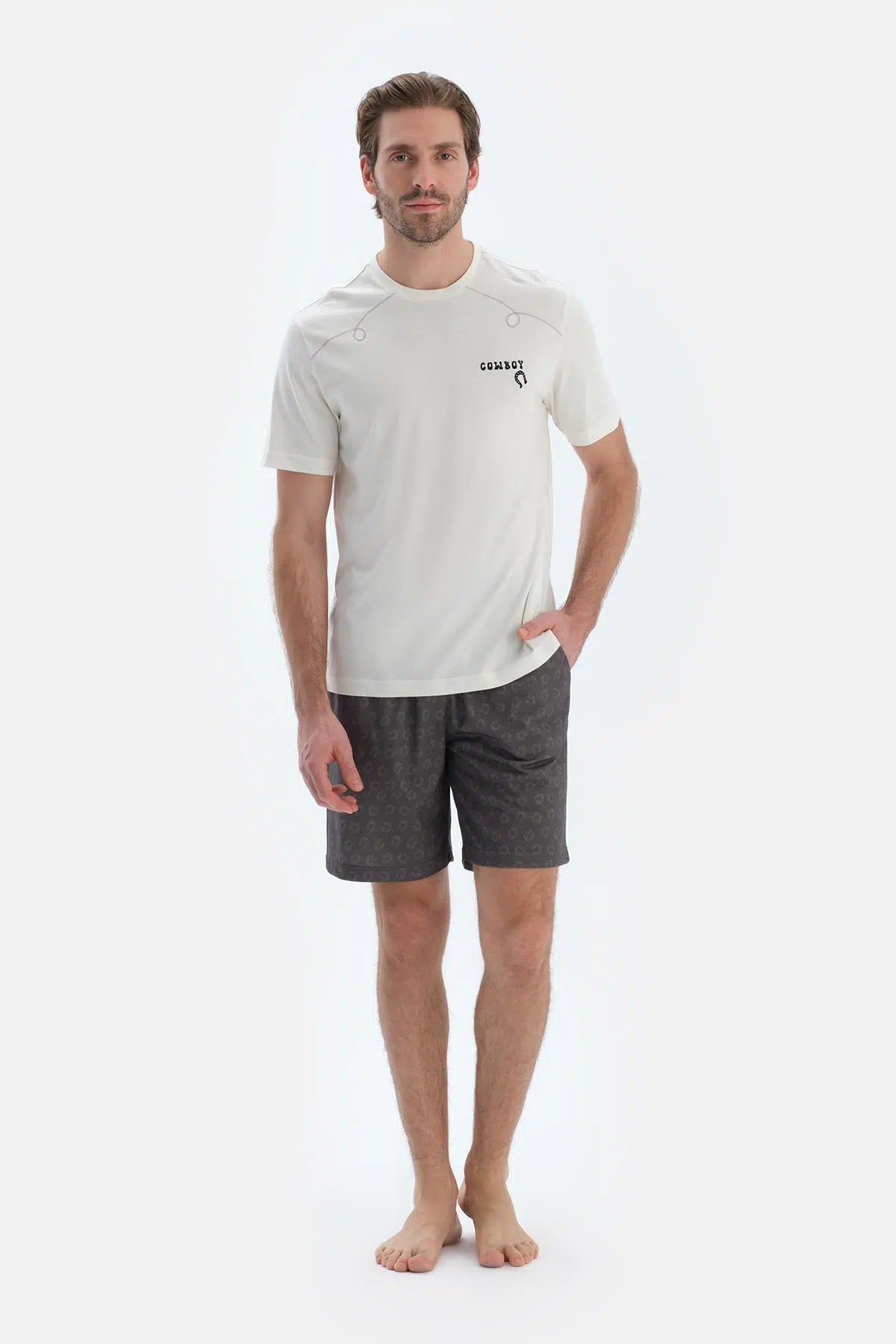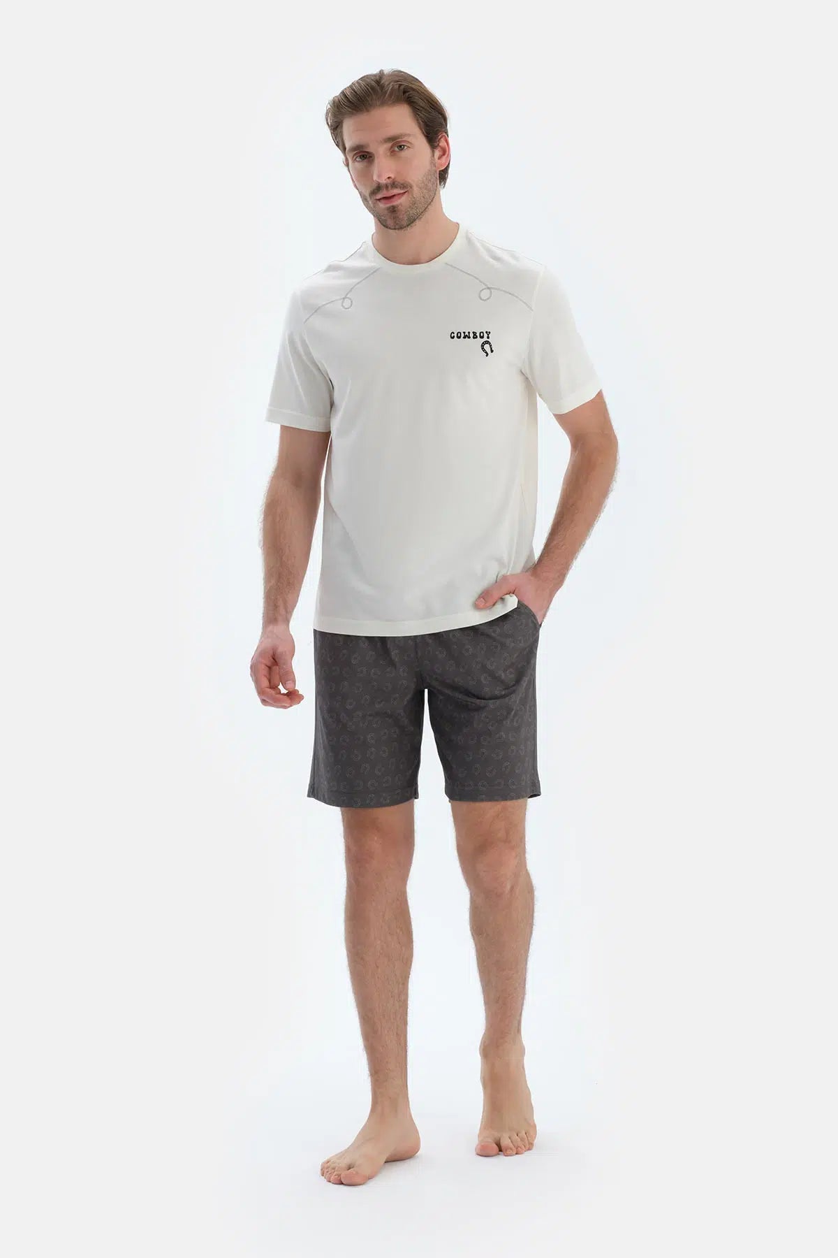 Ekru Kısa Kollu Dikiş Ve Baskı Detaylı Tişört Pantolon Pijama Takımı