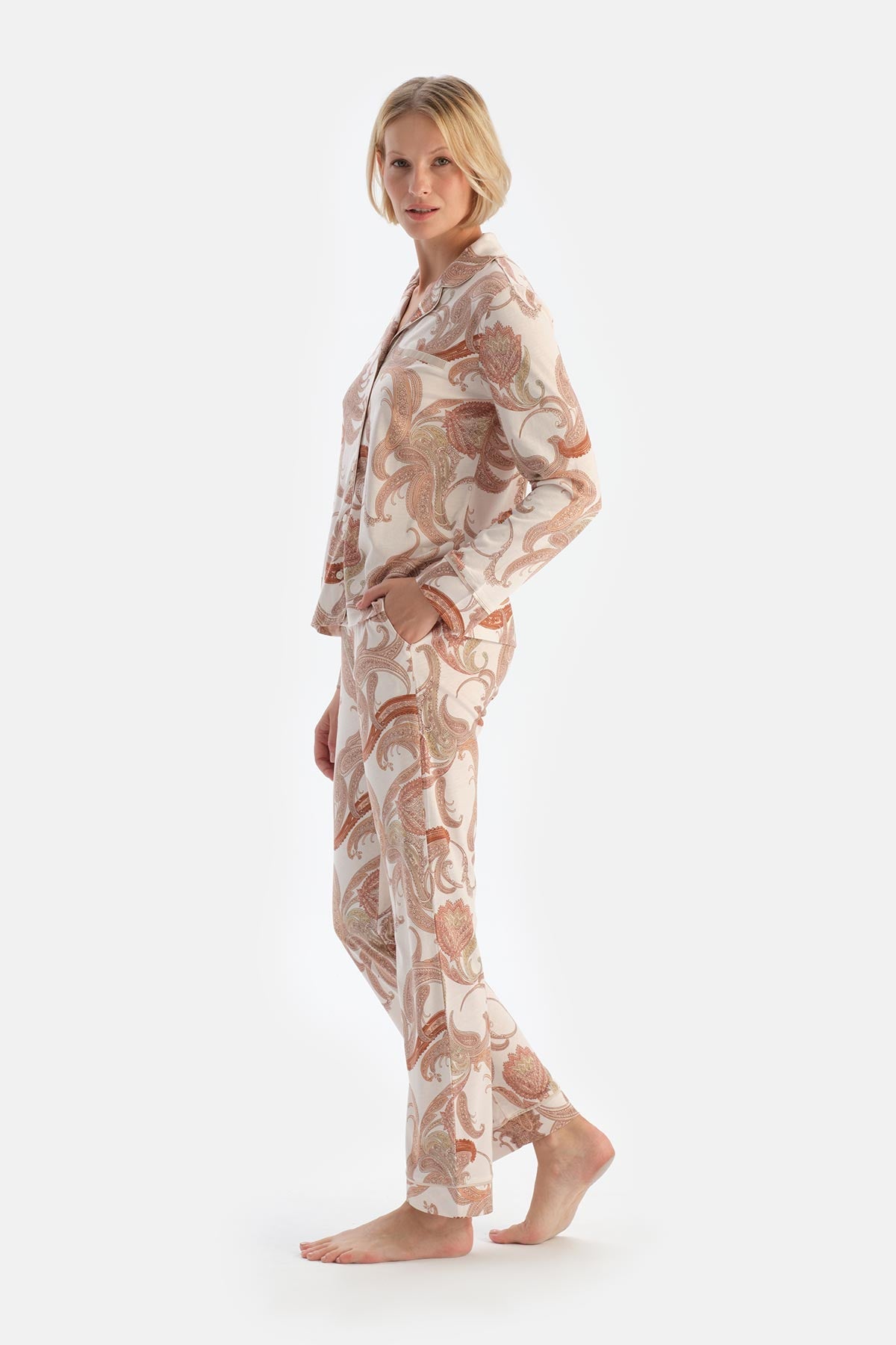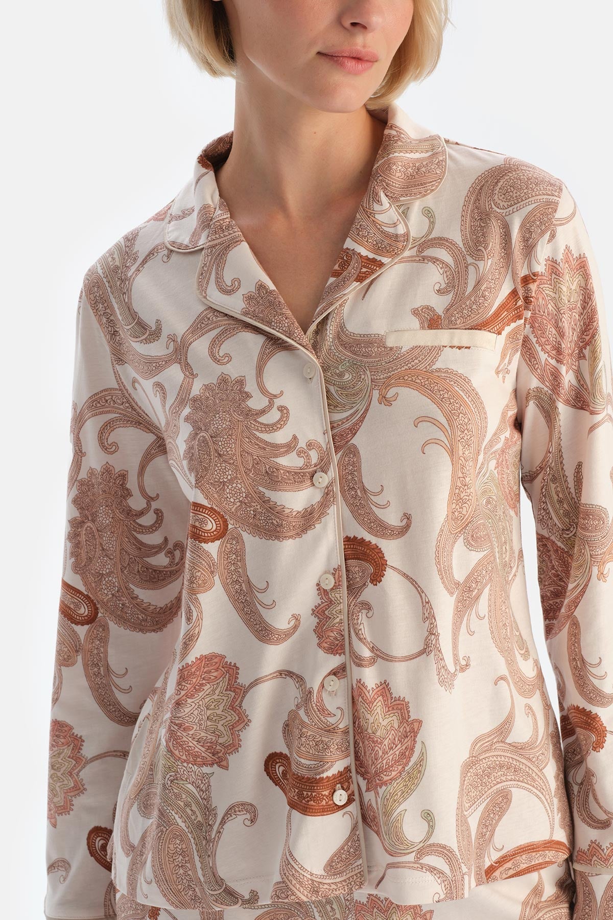 Ekru Şal Desenli Gömlek Pantolon Pijama Takımı