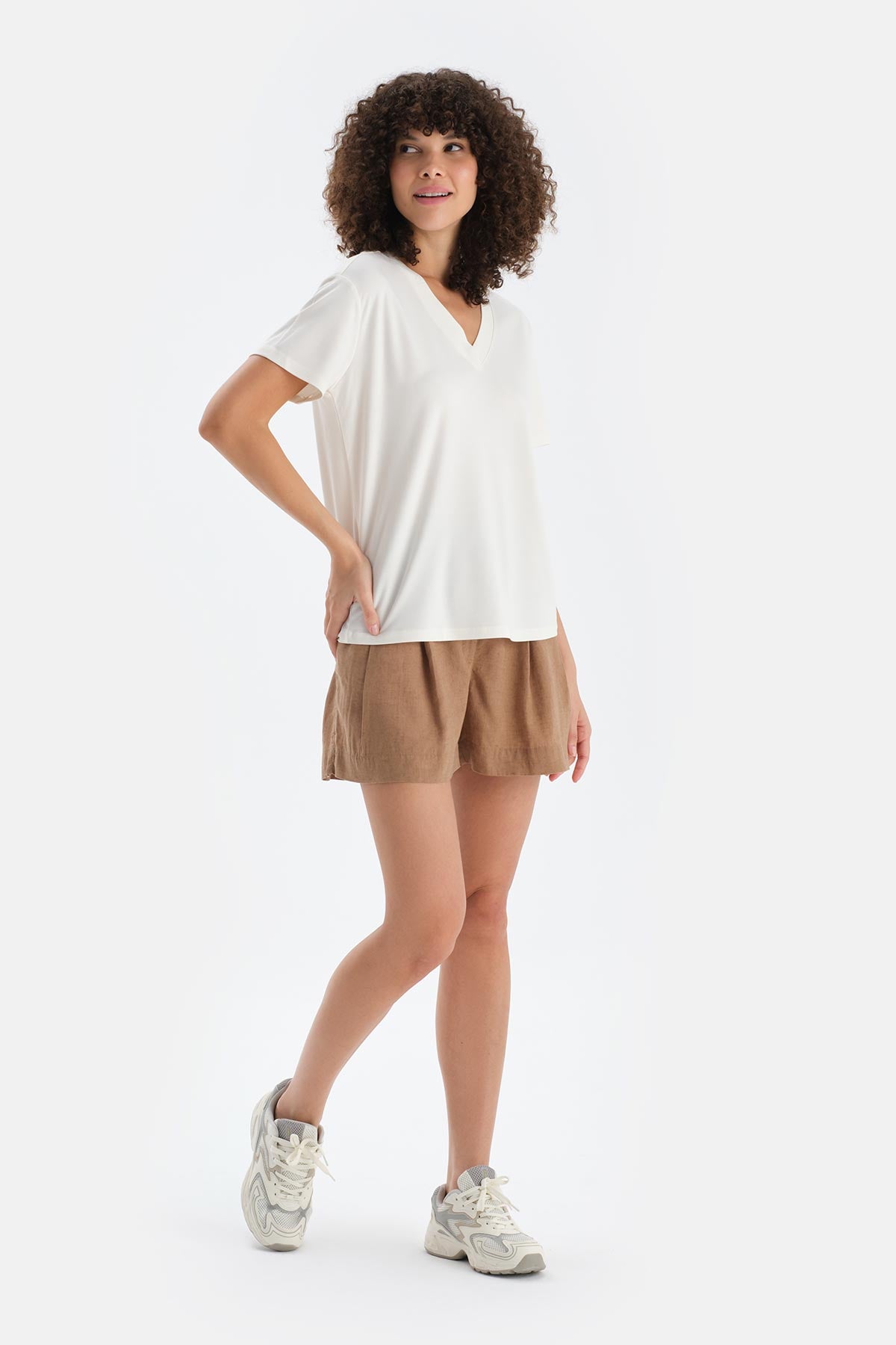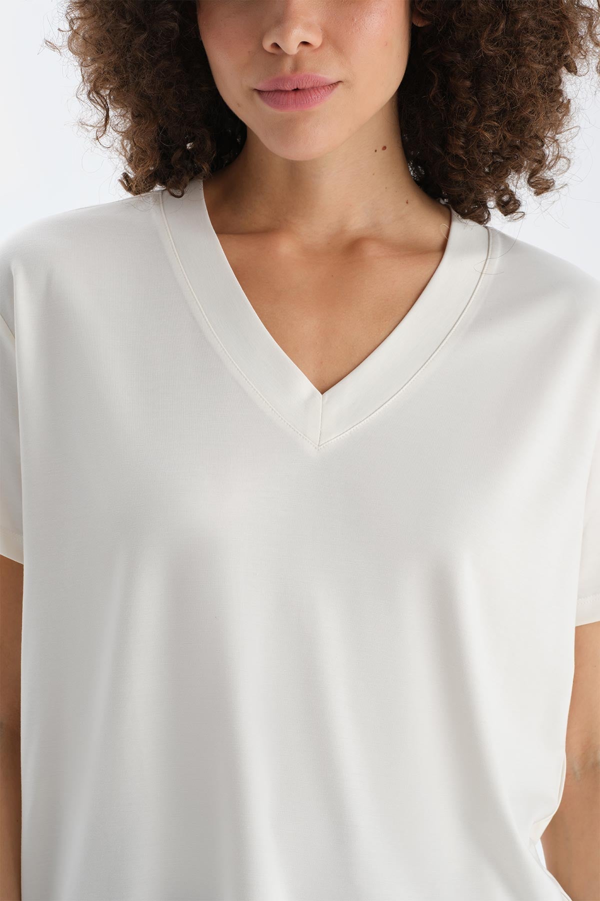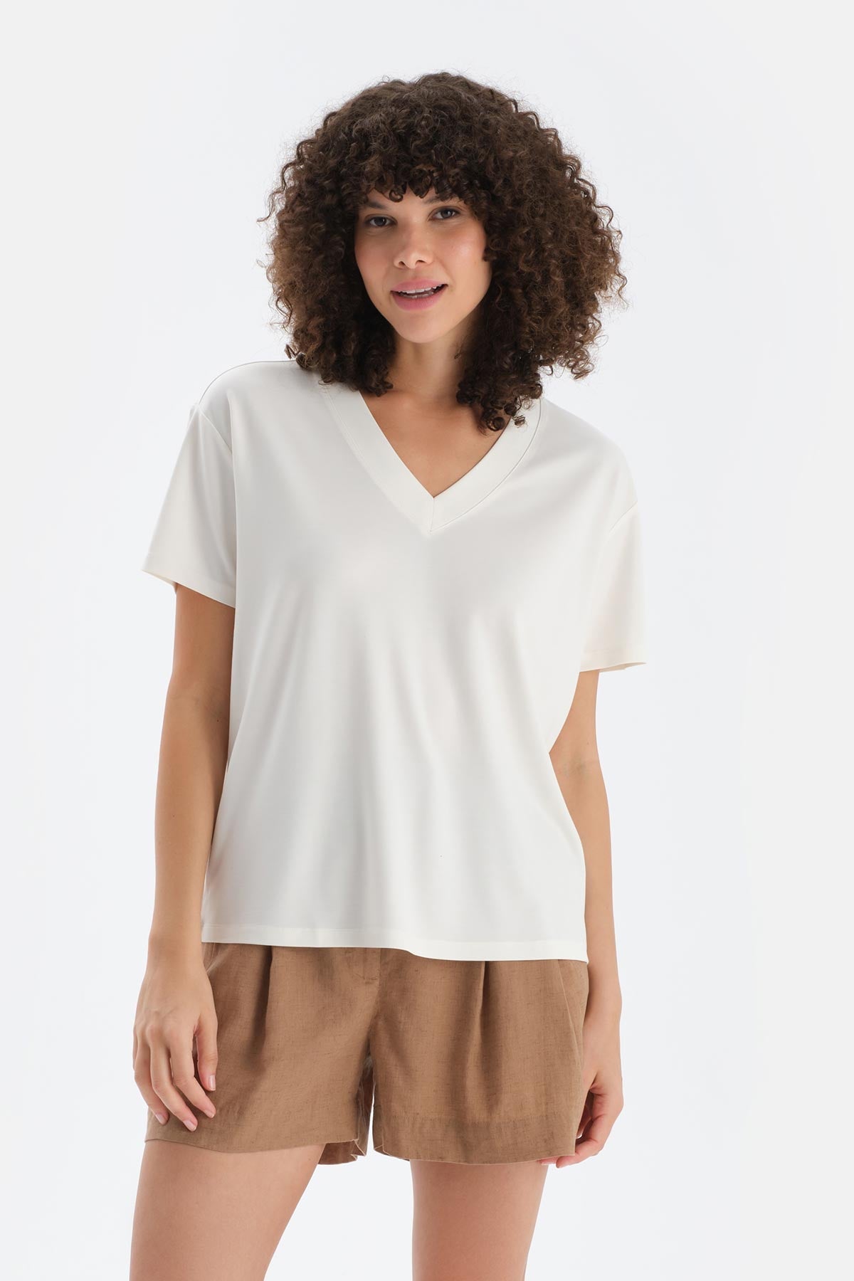 Ekru V Yaka Kısa Kollu Tişört 25SW11415BB_316 şimdi Dagi'de. Kaliteli, konforlu ve özel fiyatlarla sizleri bekliyor.
