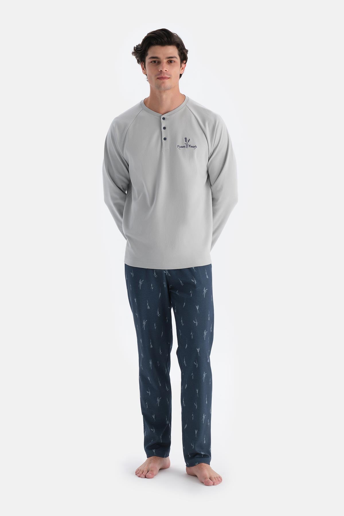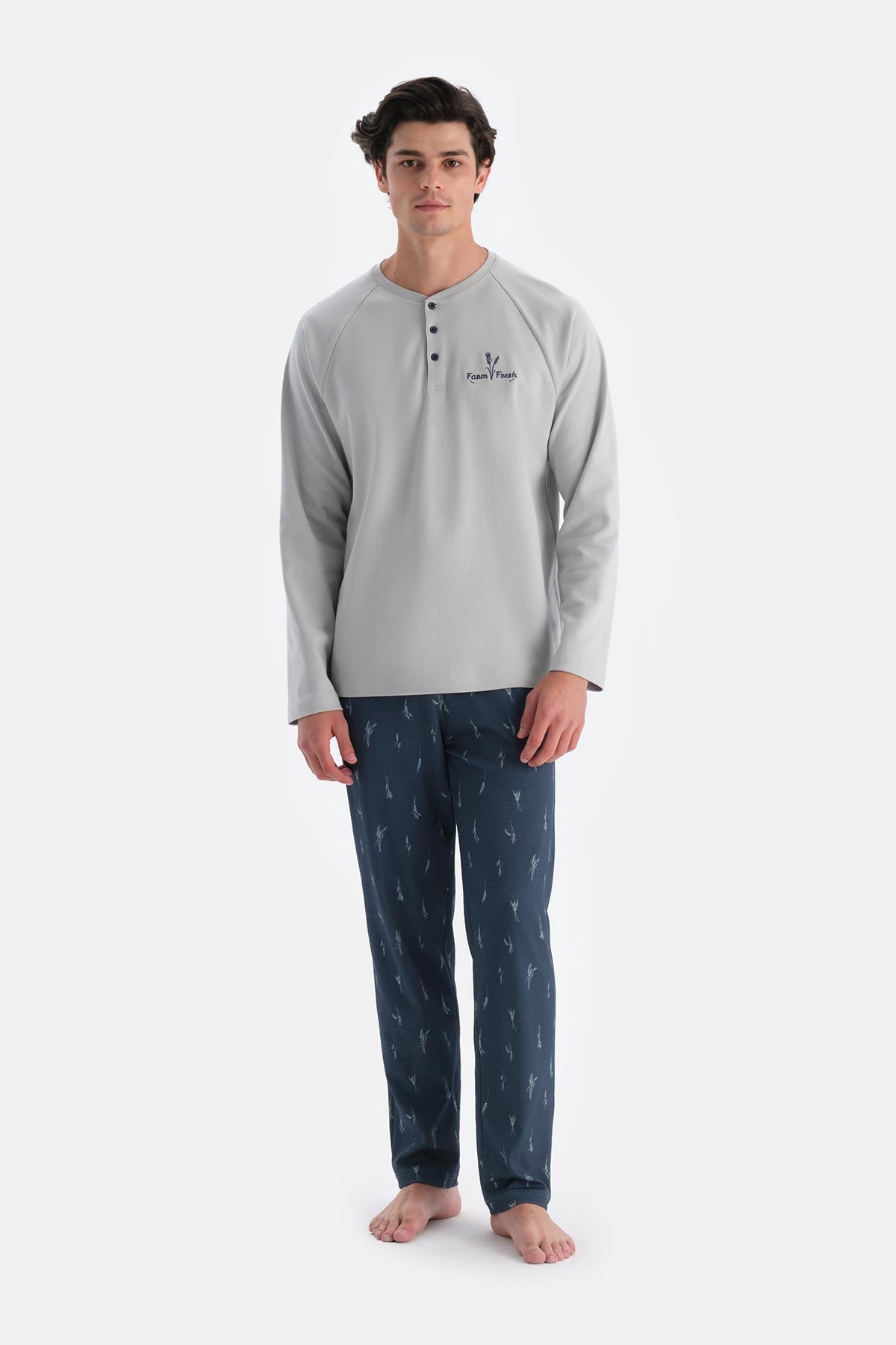 Gri Yarım Patlı Uzun Kollu Altı Baskılı Pijama Takımı