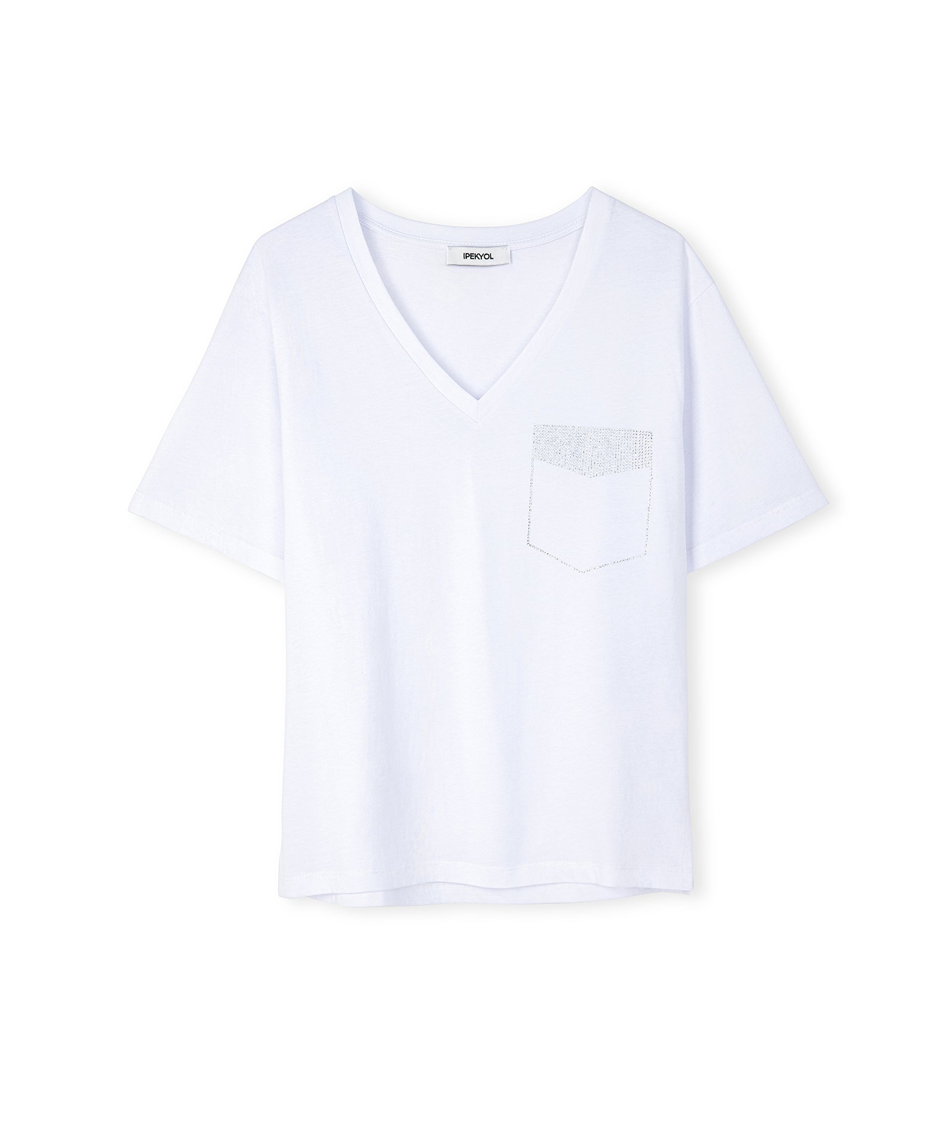 Beyaz Hotfix baskılı V yaka tişört IS1250070250002 ile tarzınızı tamamlayacaksınız. IPEKYOL tarzına sahip olmak için hemen tıklayın!