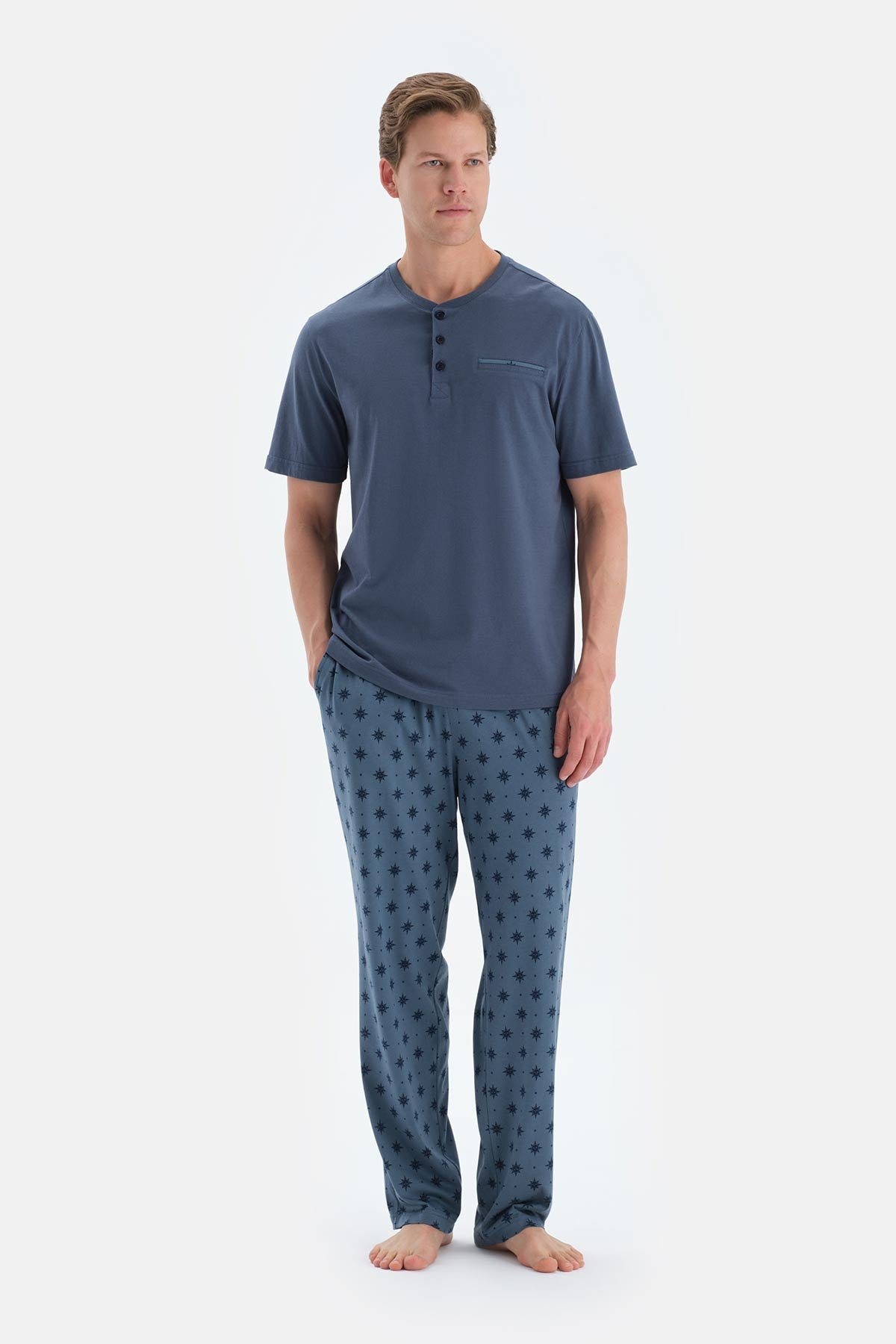 Indigo Pat Ve Fleto Cep Detaylı Tişört Pantolon Pijama Takımı