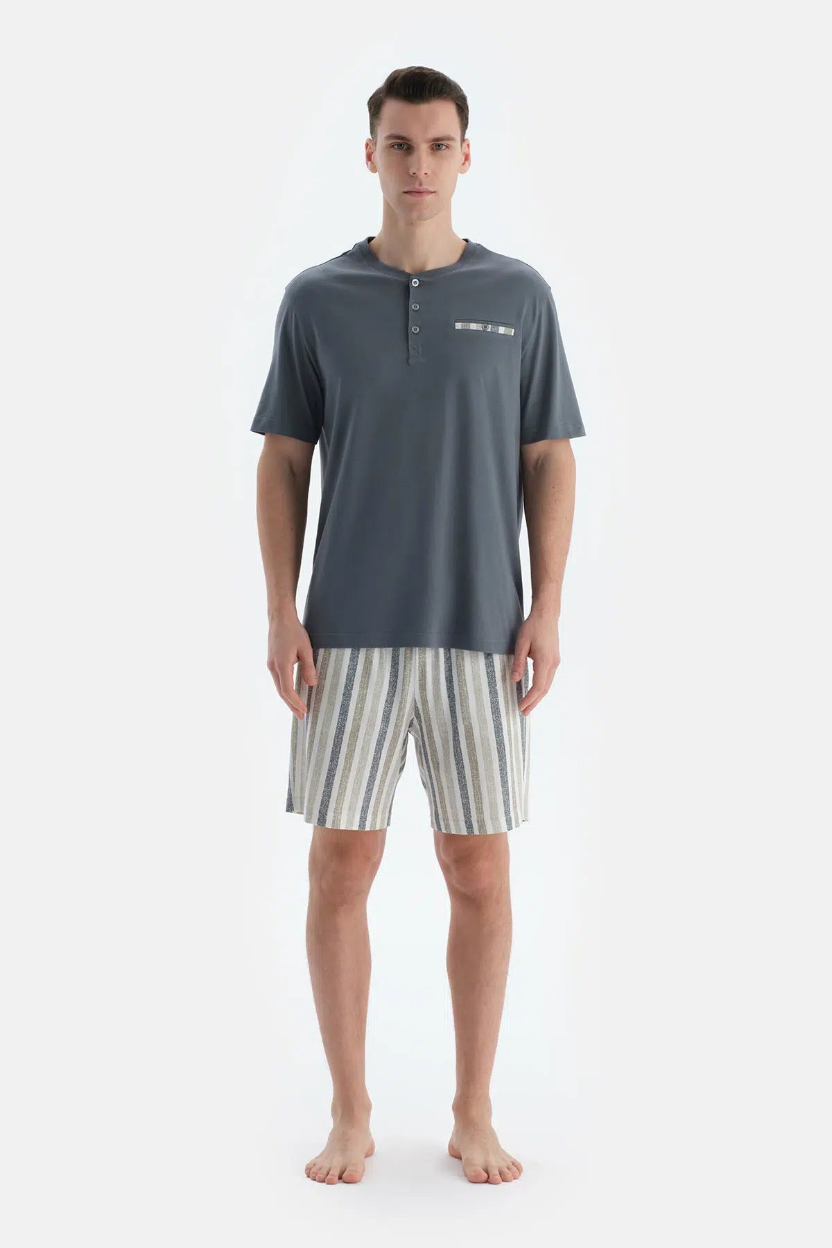 Indigo Pat Ve Fleto Cep Detaylı Tişört Şort Pijama Takımı