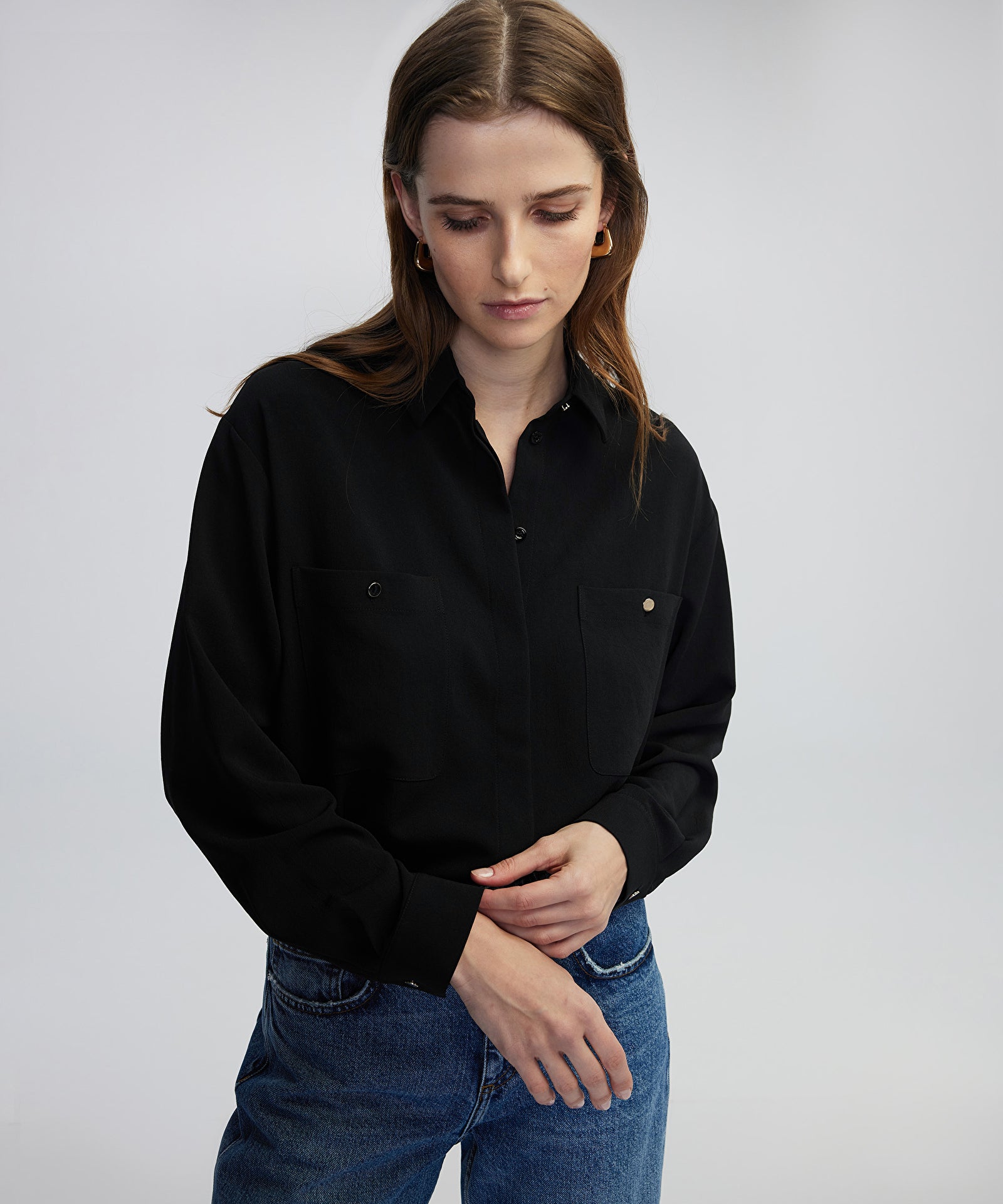 Siyah Metal düğmeli cepli gömlek IW6240025345001 ile tarzınızı tamamlayacaksınız. IPEKYOL tarzına sahip olmak için hemen tıklayın!