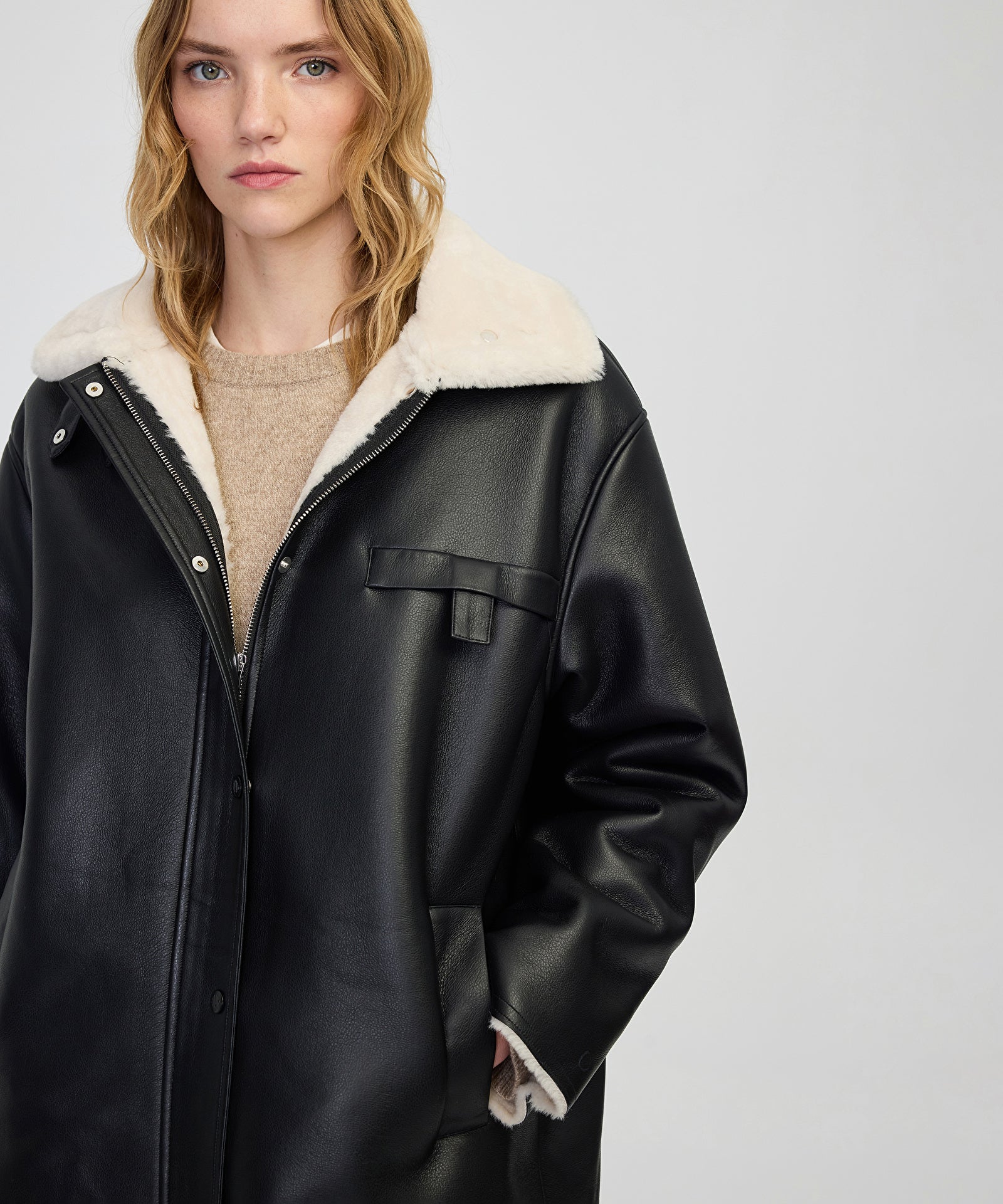 Siyah Suni kürk mix deri görünümlü mont IW6250012092001 ile tarzınızı tamamlayacaksınız. IPEKYOL tarzına sahip olmak için hemen tıklayın!