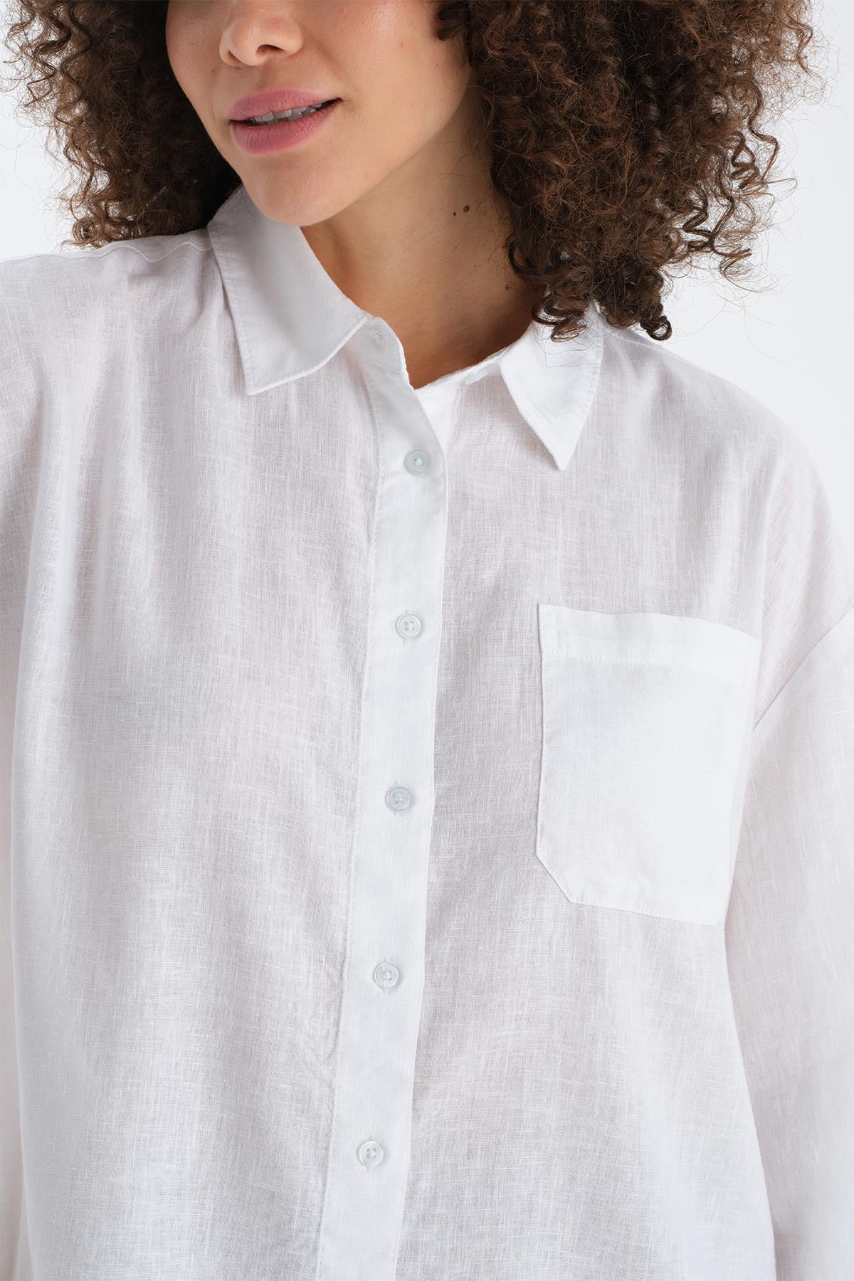 Kırık Beyaz Uzun Kollu Keten Dokuma Gömlek