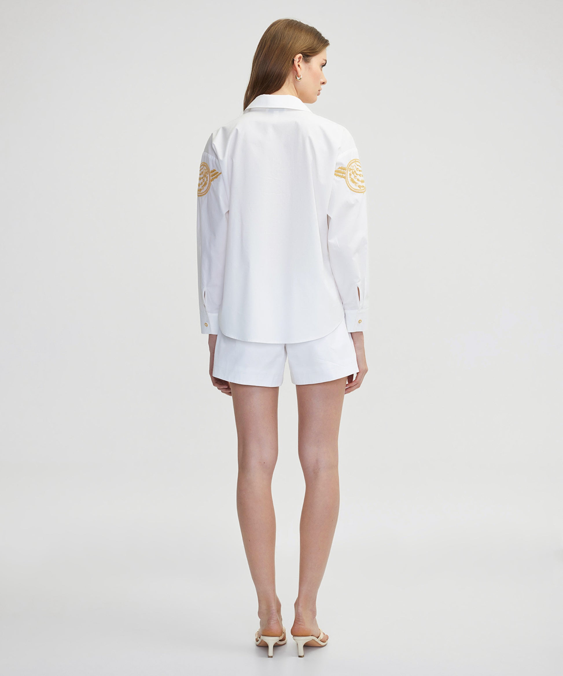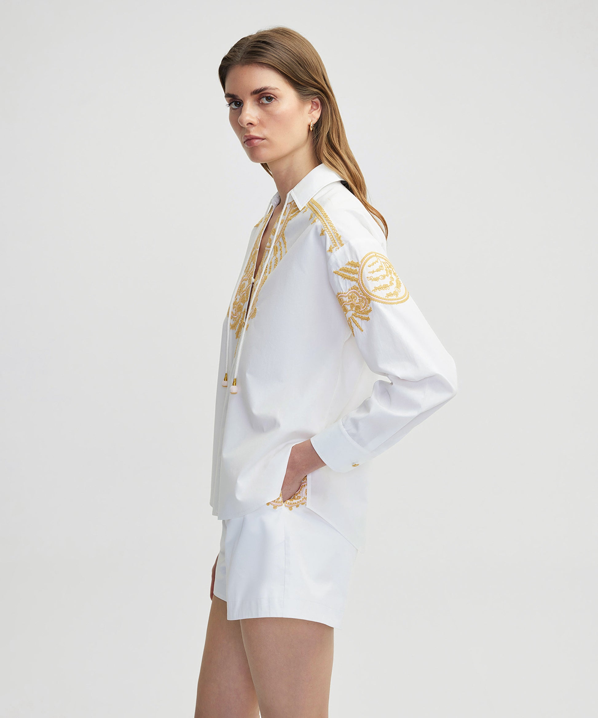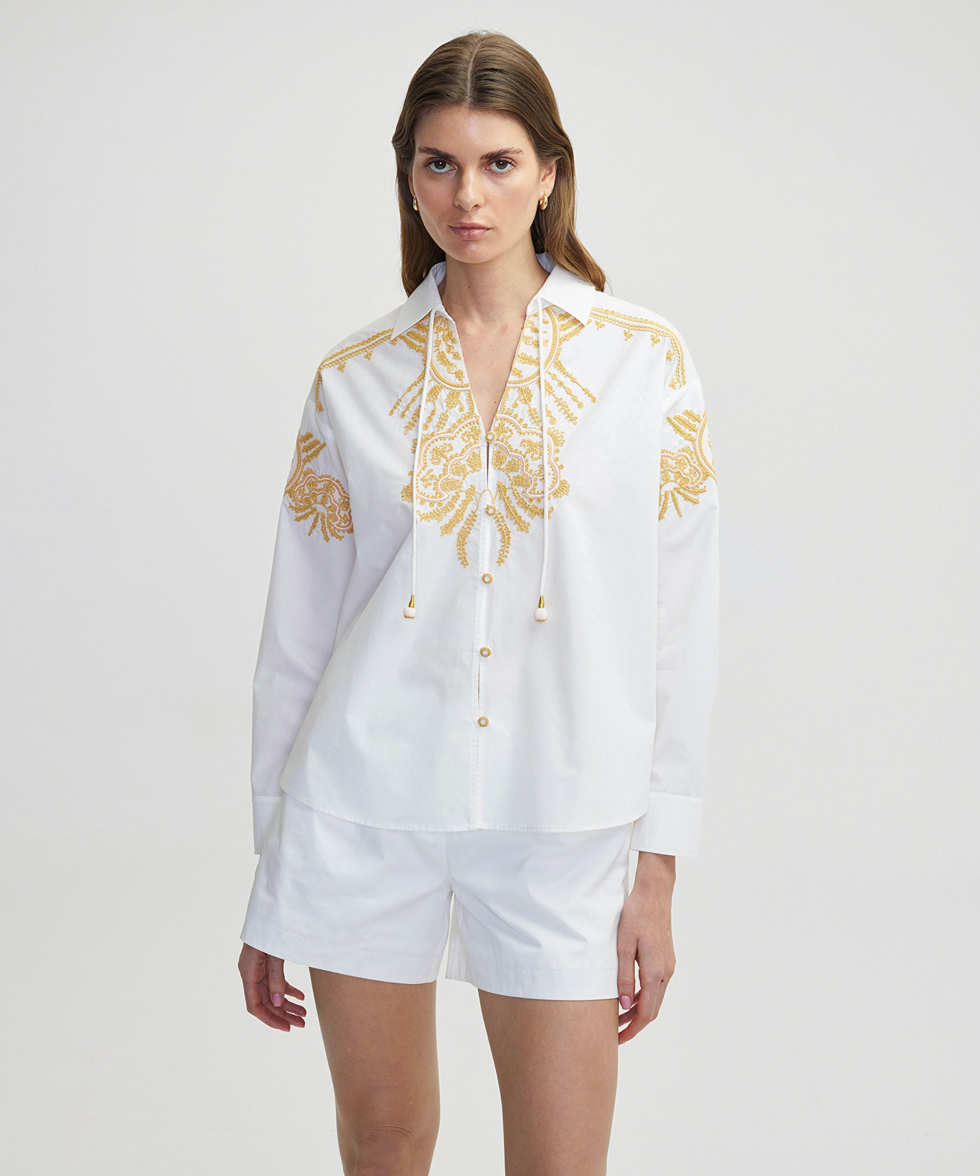 Kontrast Nakışlı Yakası Bağlamalı Gömlek