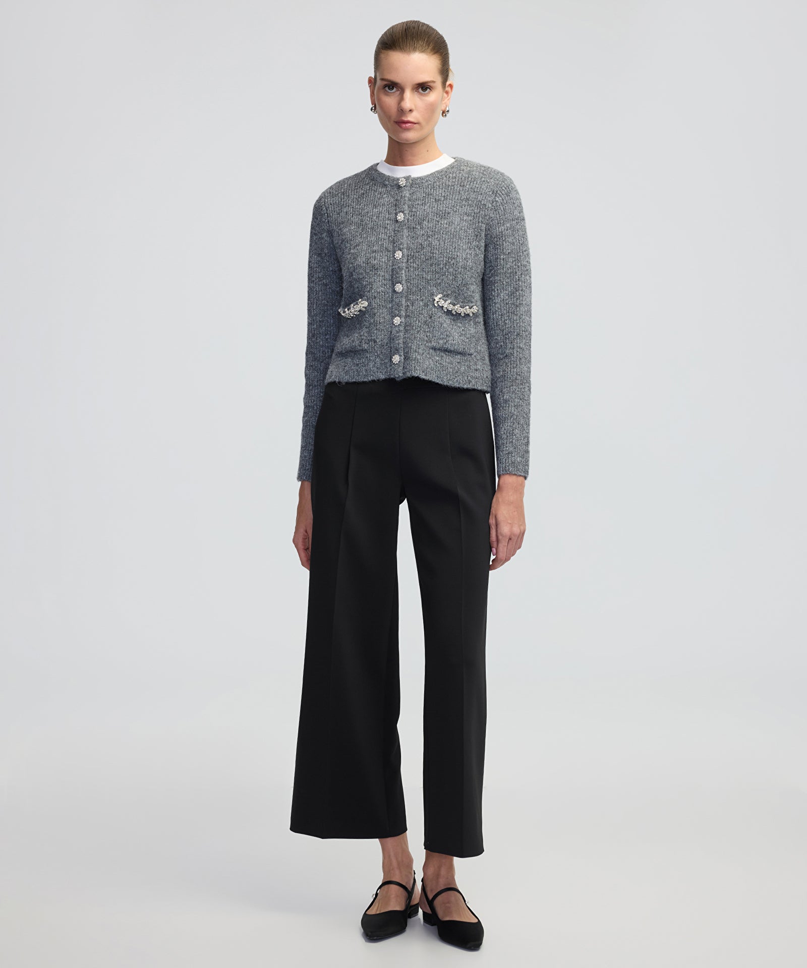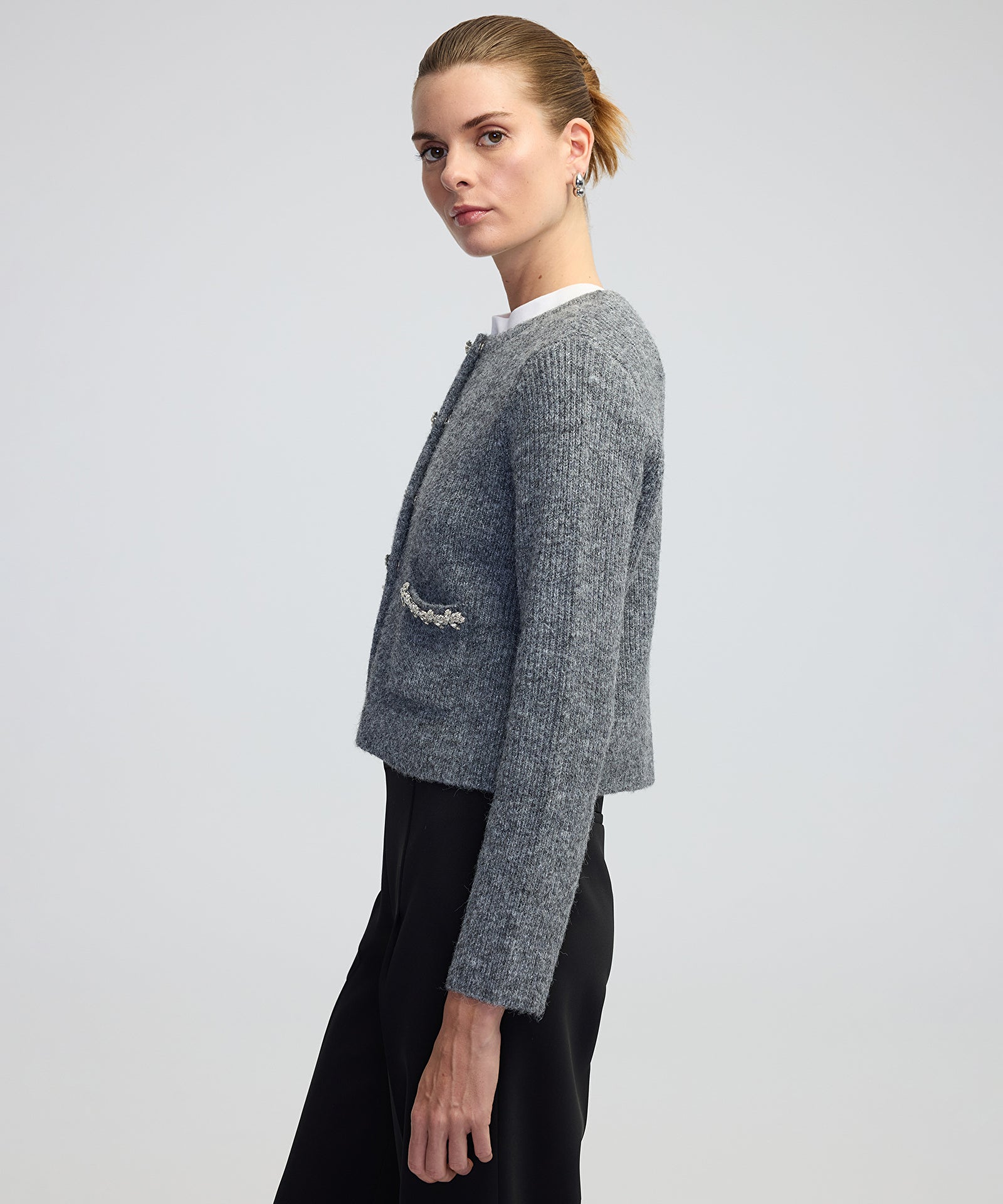 Gri Kristal taş işlemeli triko hırka IW6240050309088 ile tarzınızı tamamlayacaksınız. IPEKYOL tarzına sahip olmak için hemen tıklayın!