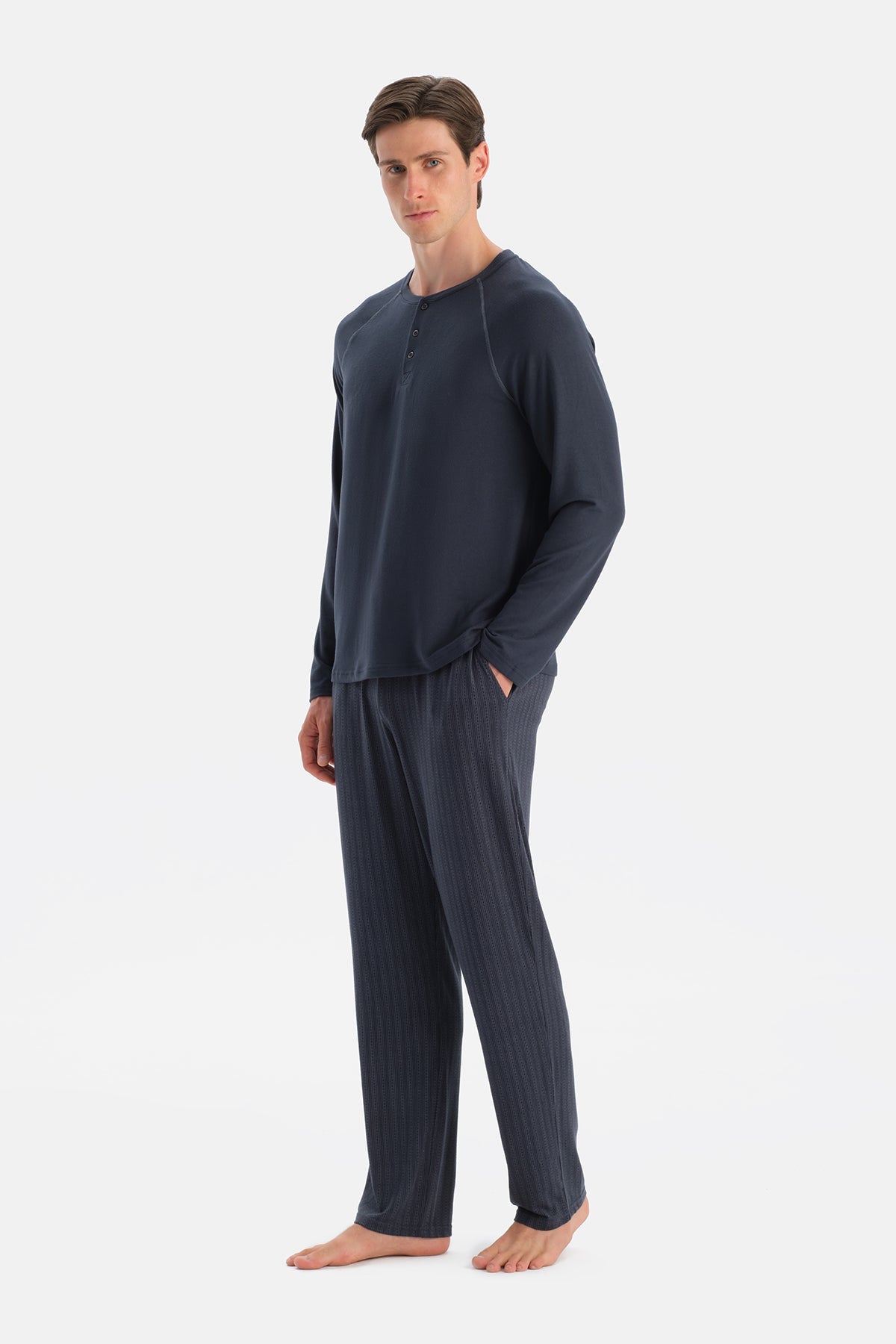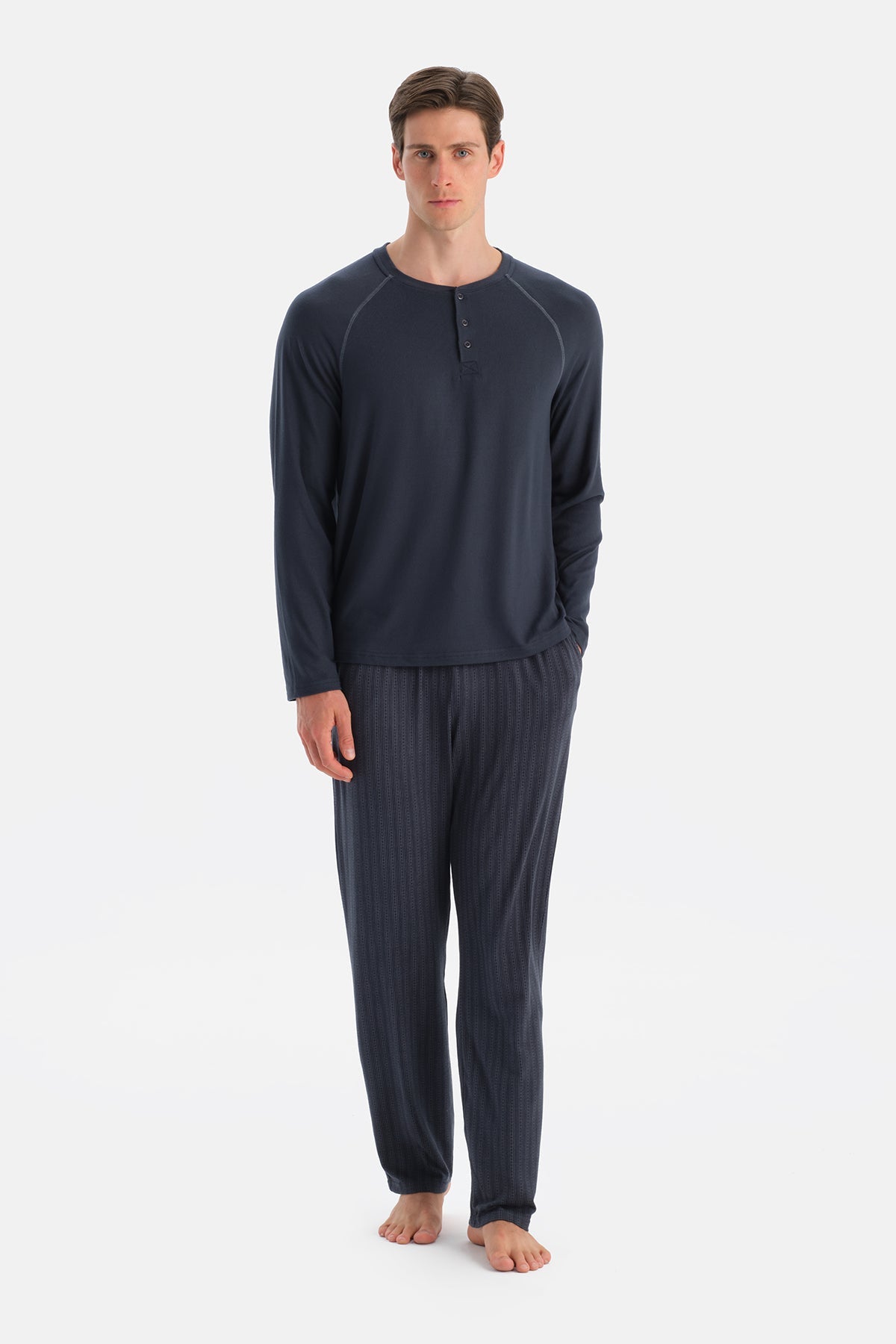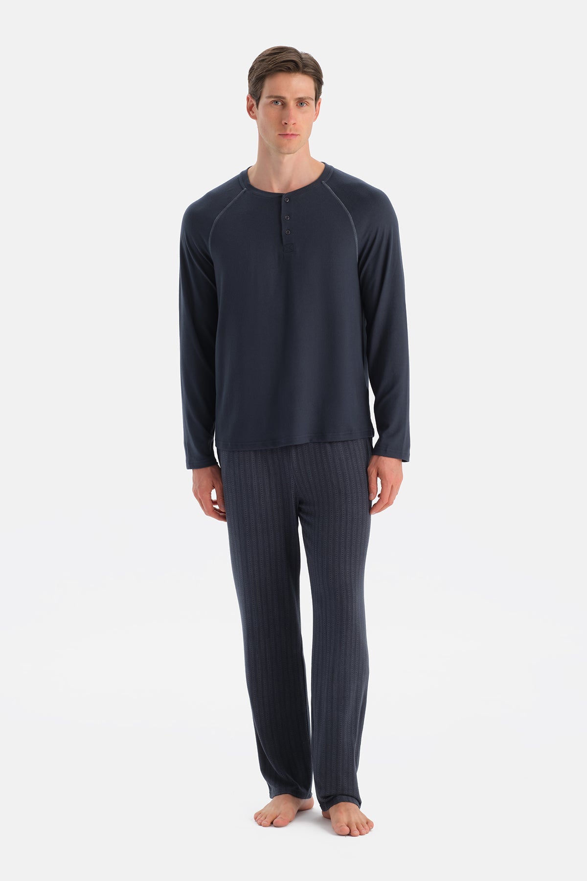 Lacivert Dikiş Detaylı Ve Patlı Termal Tişört Pantolon Pijama Takımı