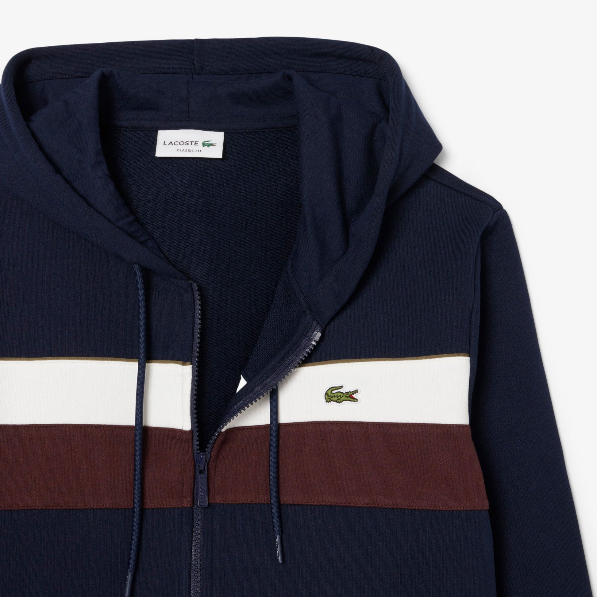 Pamuklu kumaştan üretilen fermuarlı kapüşonlu sweatshirt, göğüs kısmındaki cesur renk bloklarıyla dinamik bir görünüm sunar. Kontrast şerit detayı ve ikonik timsah işlemeli logosuyla dikkat çeken tasarım, klasik kesimiyle gün boyu konfor sağlar. Günlük stilinize modern bir dokunuş katar.