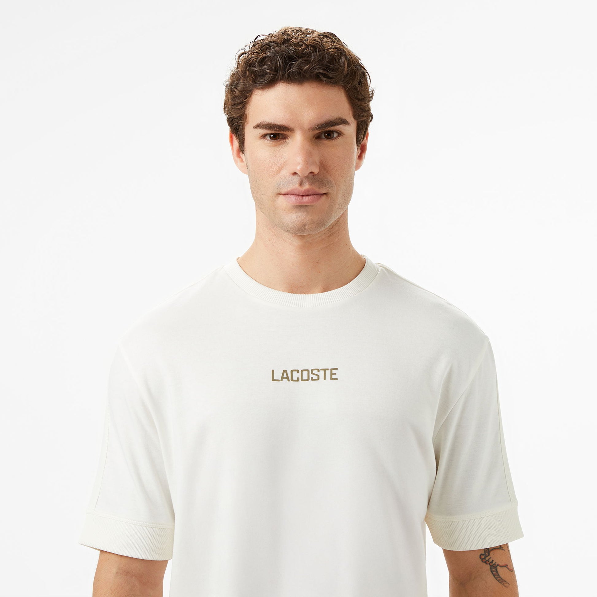 Sportif görünümü rahat kesimle buluşturan t-shirt, göğüs kısmındaki Lacoste yazısı ve kontrast kol detaylarıyla dinamik bir stil sunar. Bisiklet yaka tasarımıyla klasik bir duruş sergilerken, farklı dokulardaki kumaş panelleriyle dikkat çeker. Günlük kombinlere enerjik bir hava katmak isteyenler için şık ve konforlu bir seçenektir.