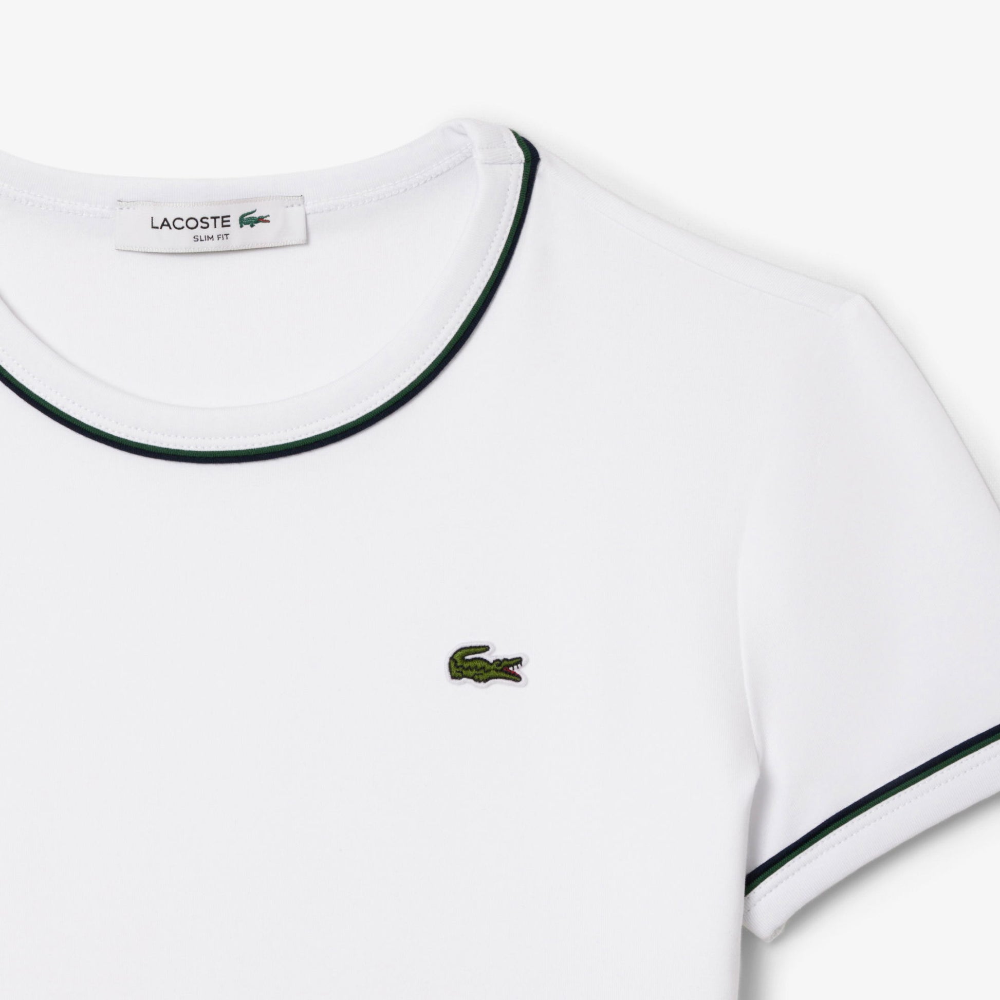 Kontrast renk detaylarıyla öne çıkan slim fit t-shirt, esnek pamuk karışımlı kumaşı sayesinde hem şıklık hem de rahatlık sunar. Yaka ve kol uçlarındaki çizgi detayları zarif bir görünüm kazandırırken, minimal timsah logosu Lacoste?un ikonik tarzını tamamlar.