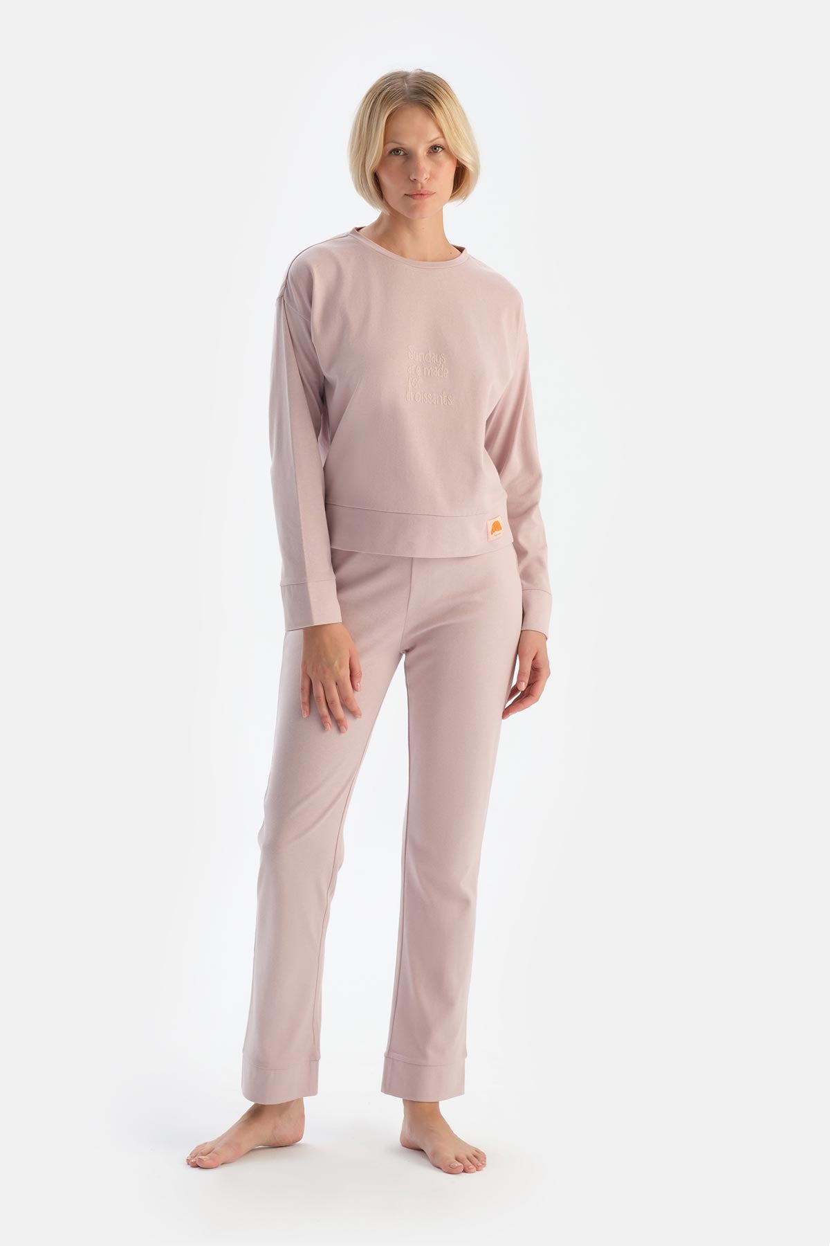 Lila Slogan Baskı Detaylı Uzun Kol Pamuklu Pijama Takımı