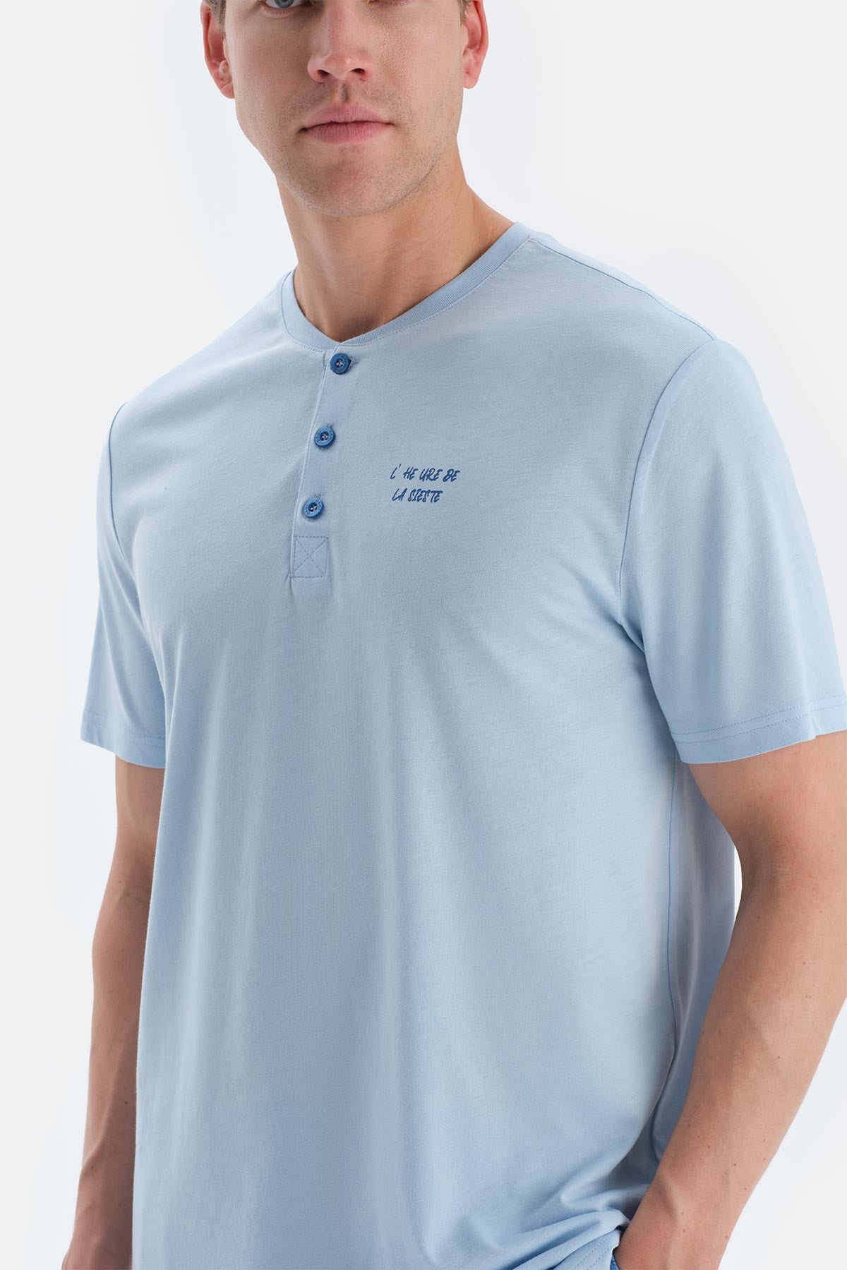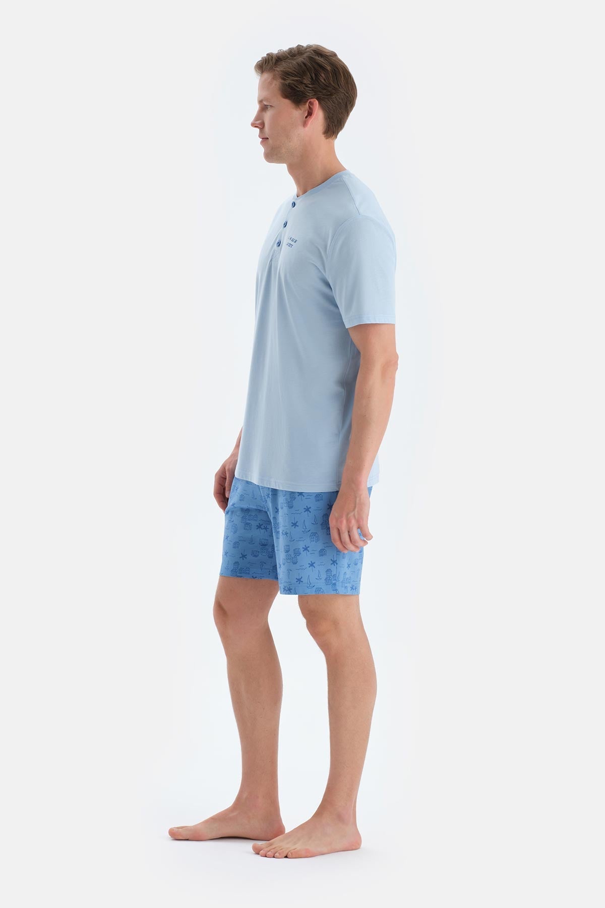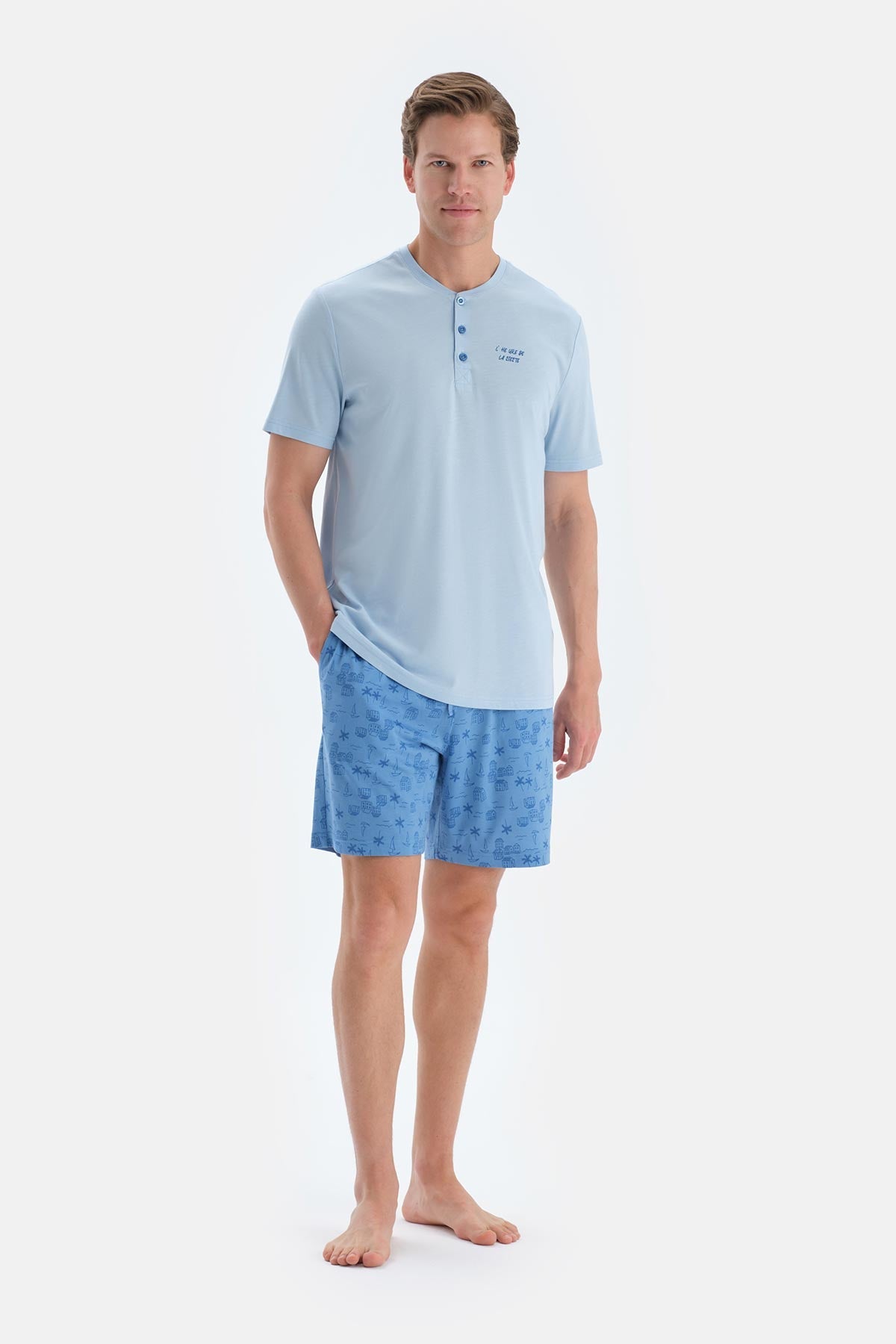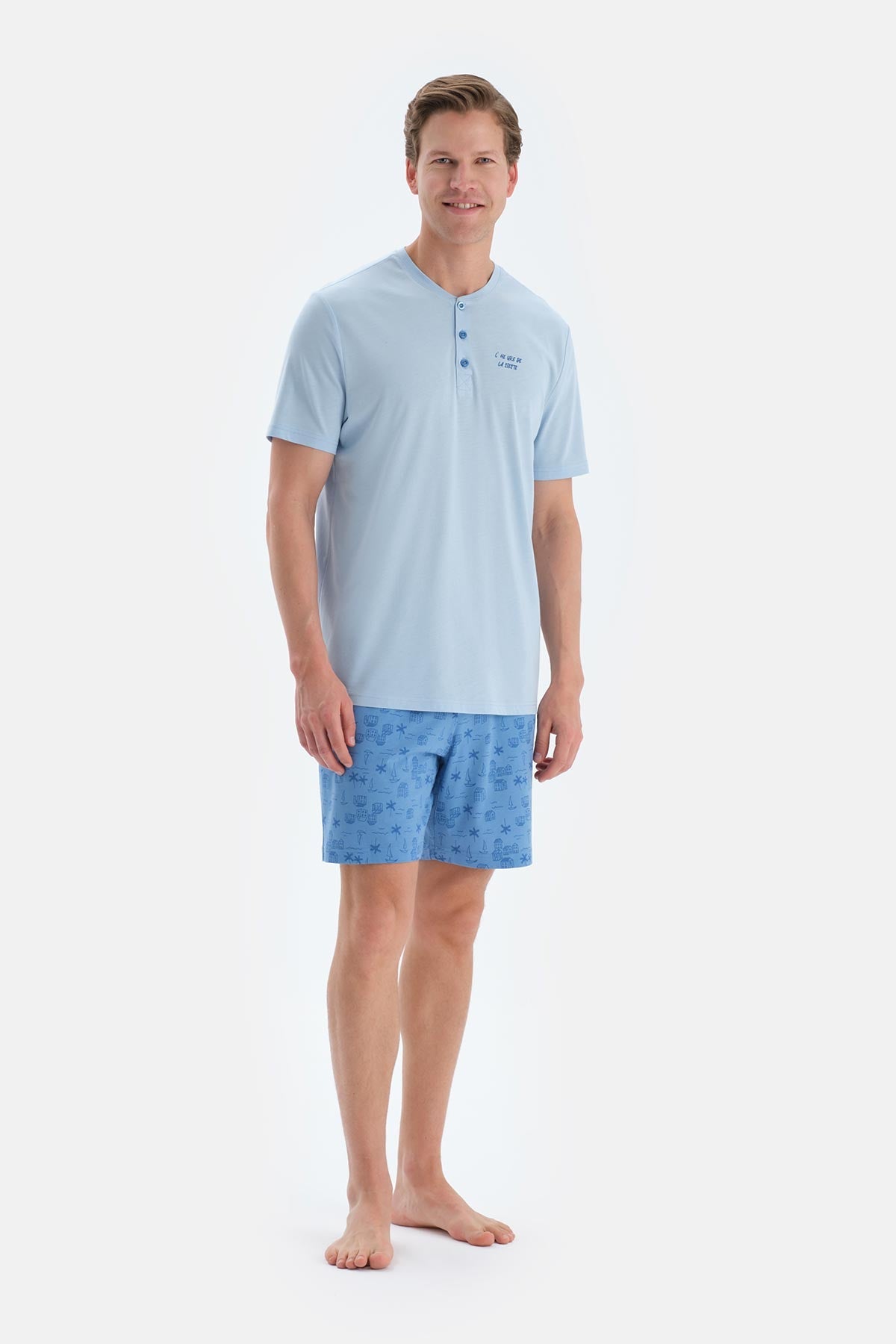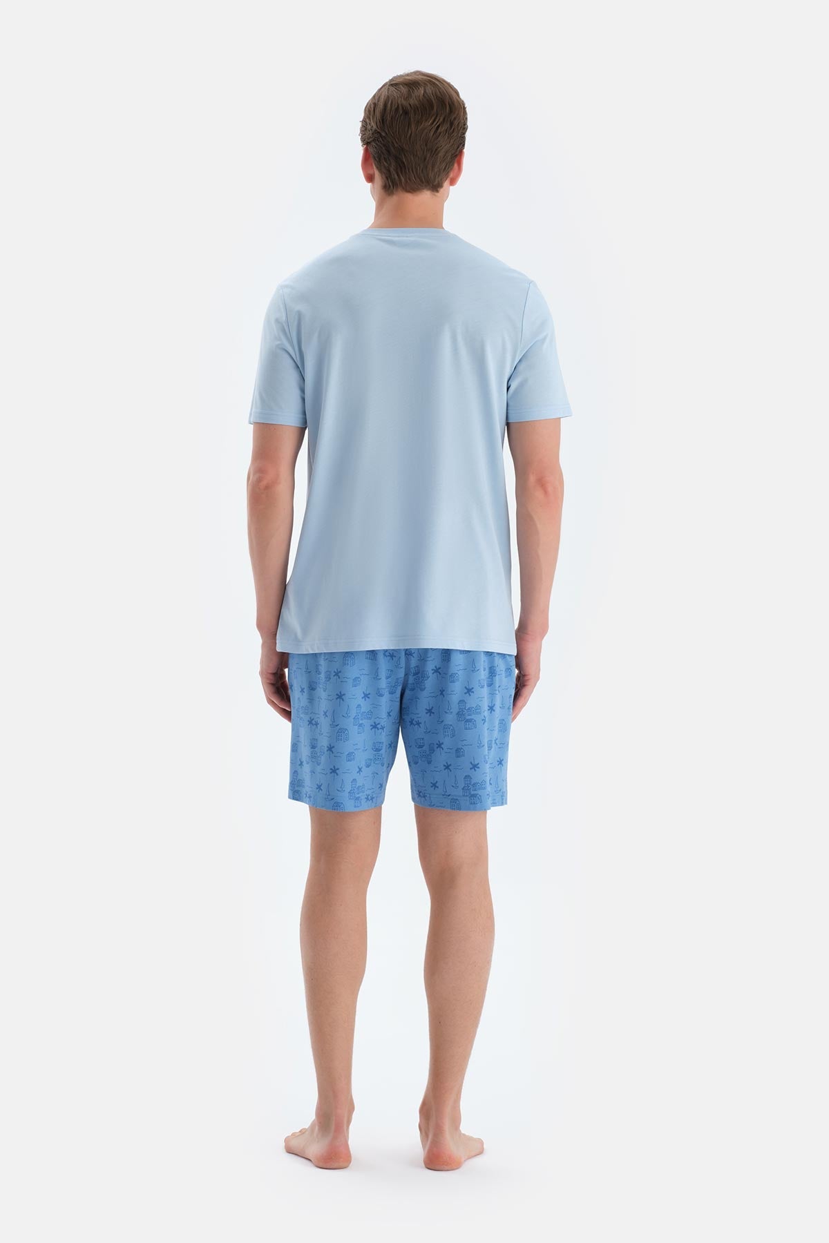 Mavi Baskı Detaylı Kısa Kollu Tişört Şort Pijama Takımı