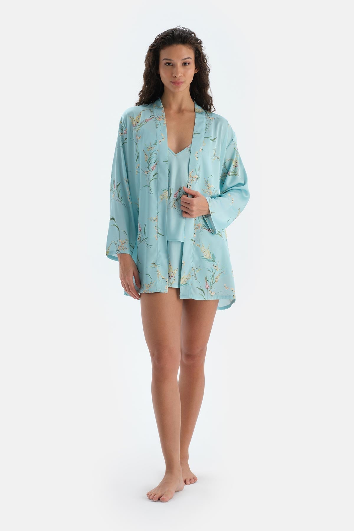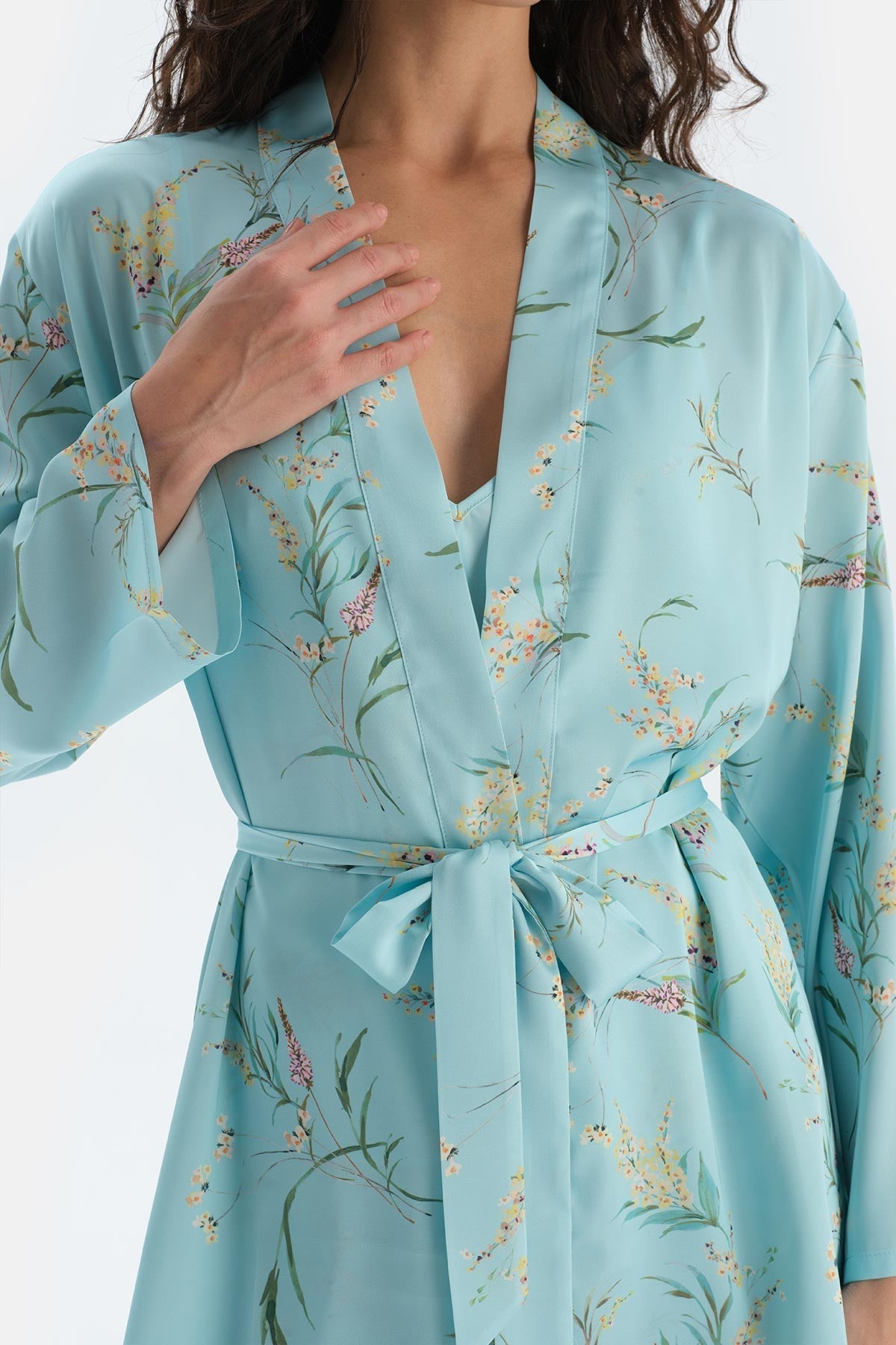 Mavi Baskılı Uzun Kollu Saten Sabahlık