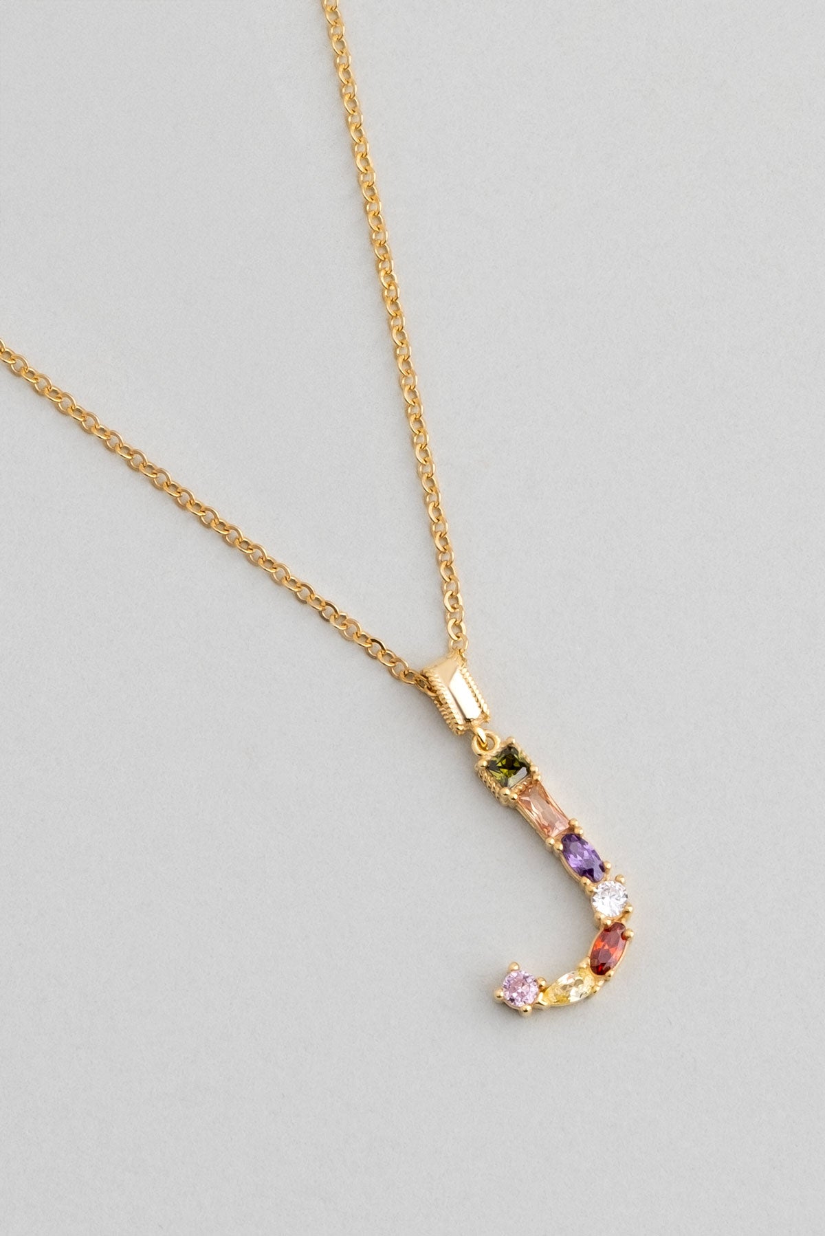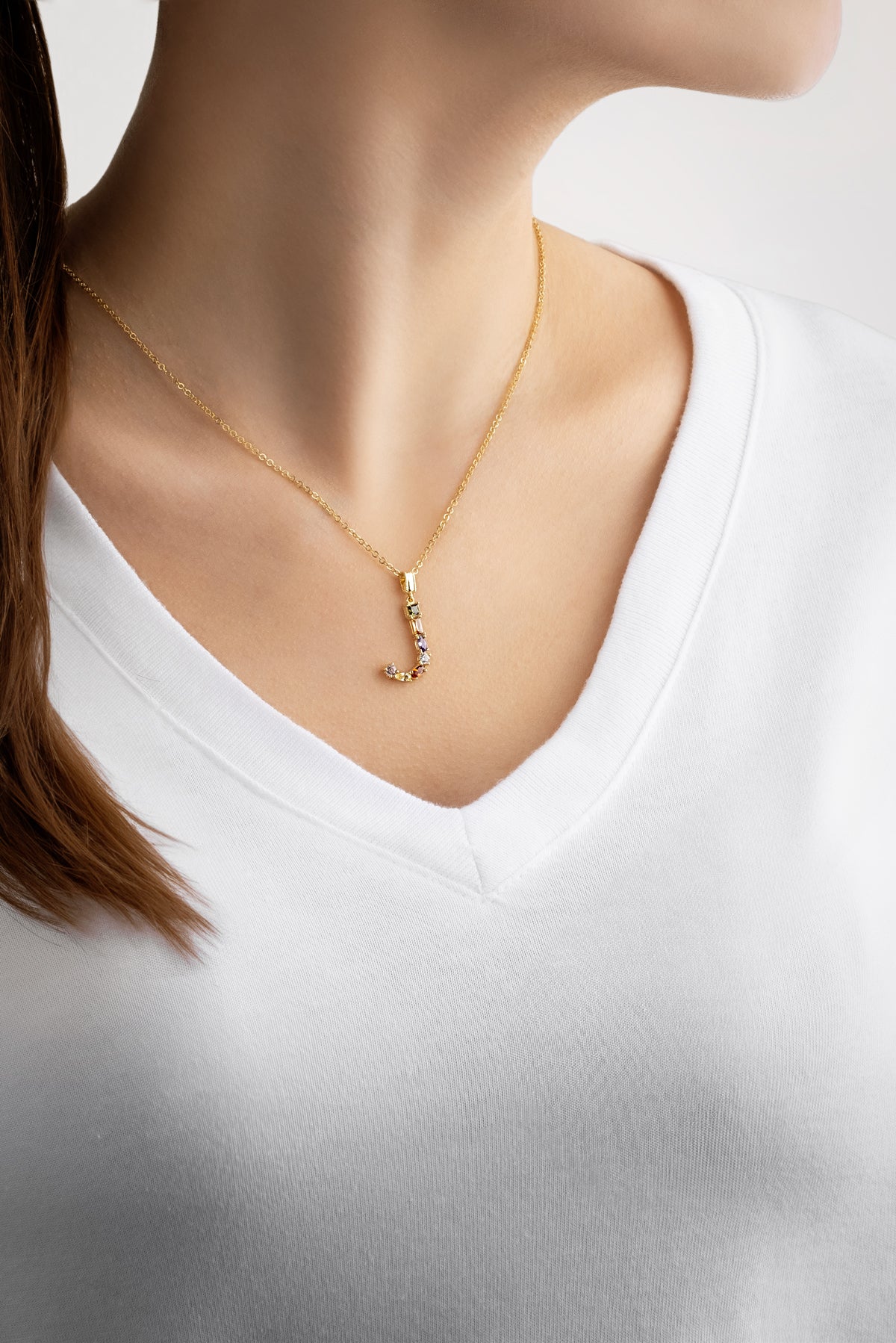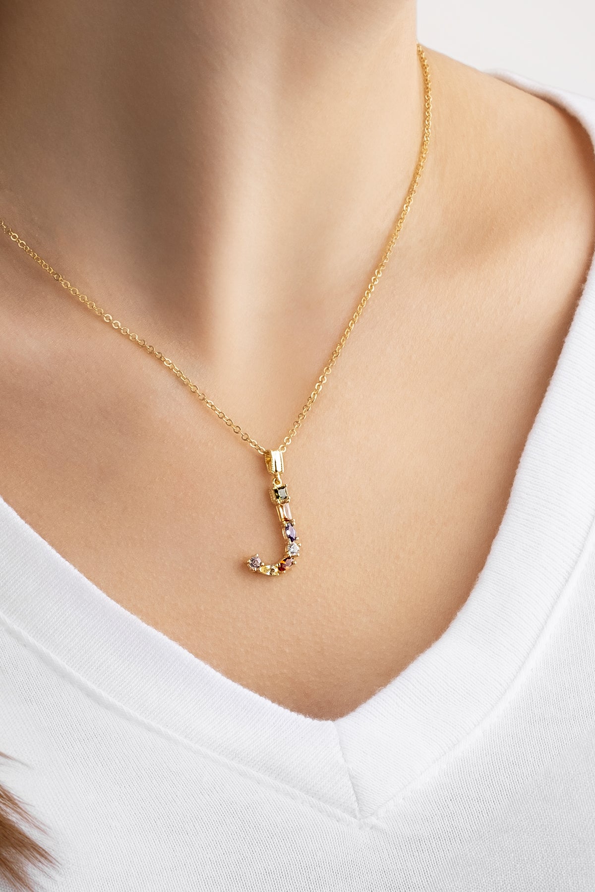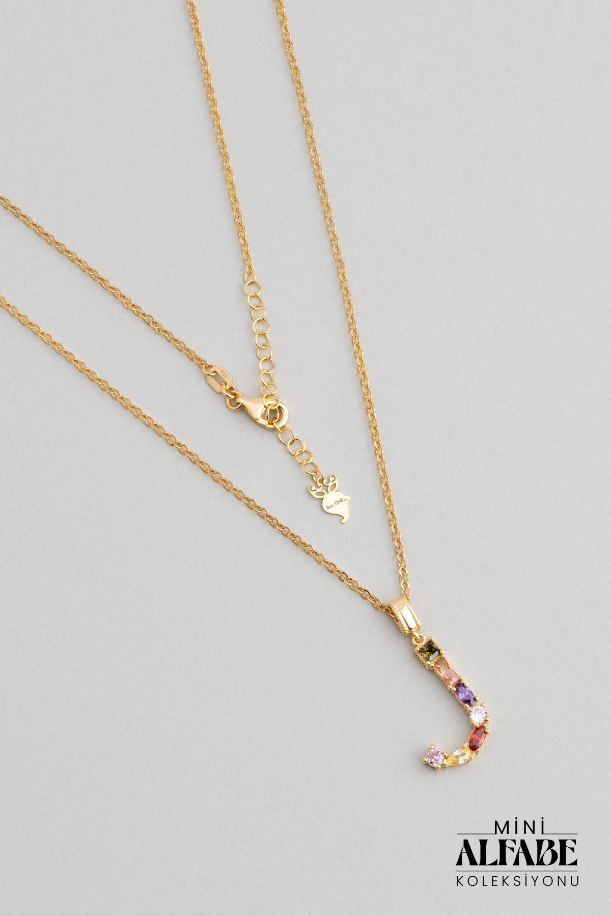Mini J Harfi Günışığı Renkli 18 Ayar Sarı Altın Kaplama Gümüş Kolye 07300111344