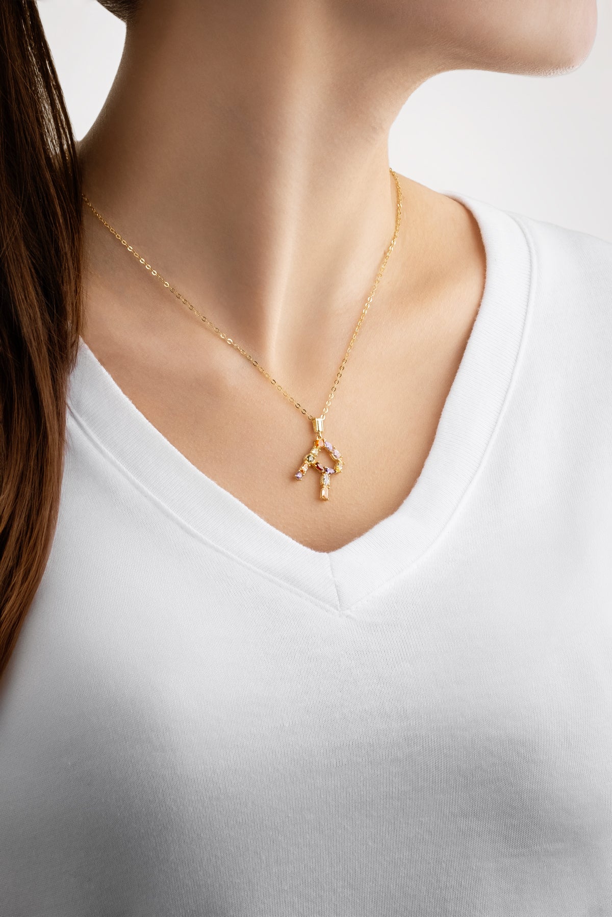 Mini R Harfi Günışığı Renkli 18 Ayar Sarı Altın Kaplama Gümüş Kolye 07300191344