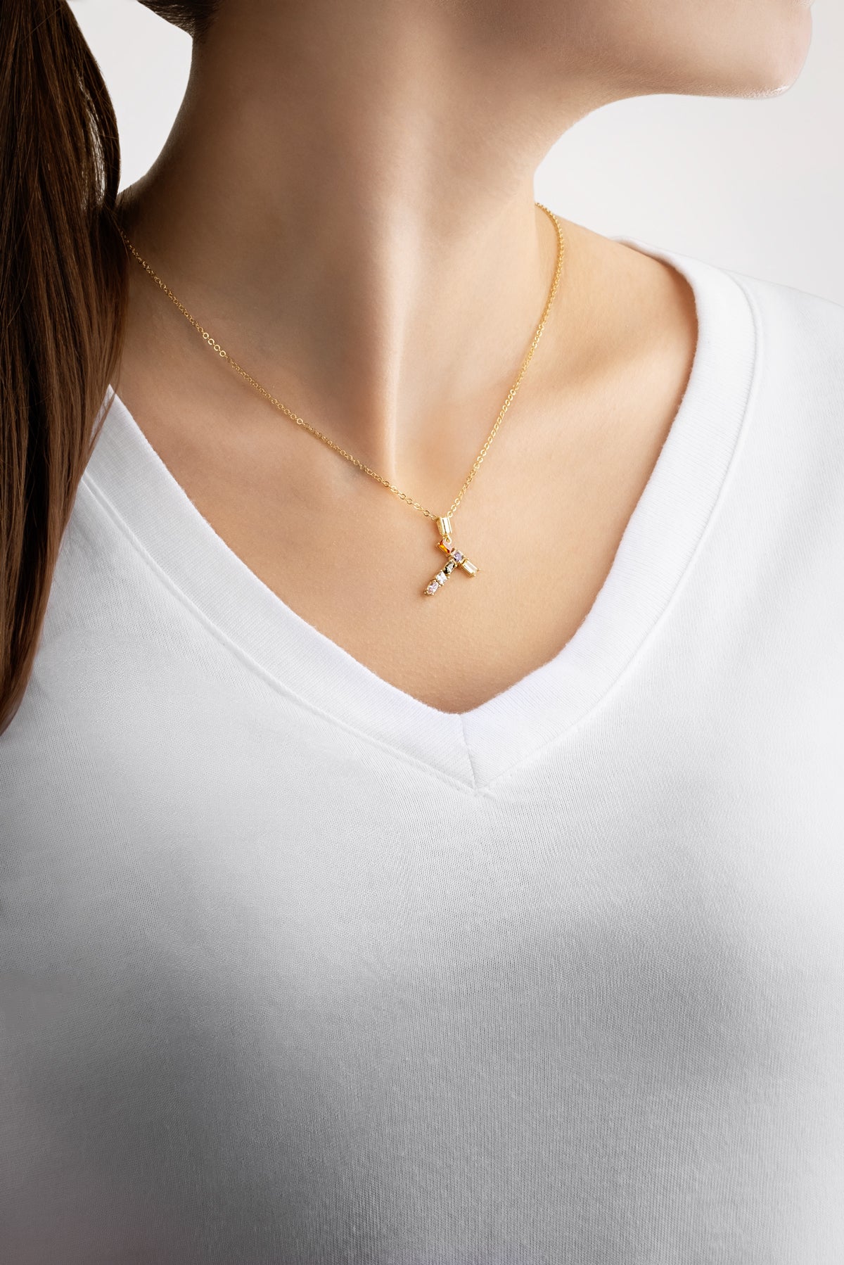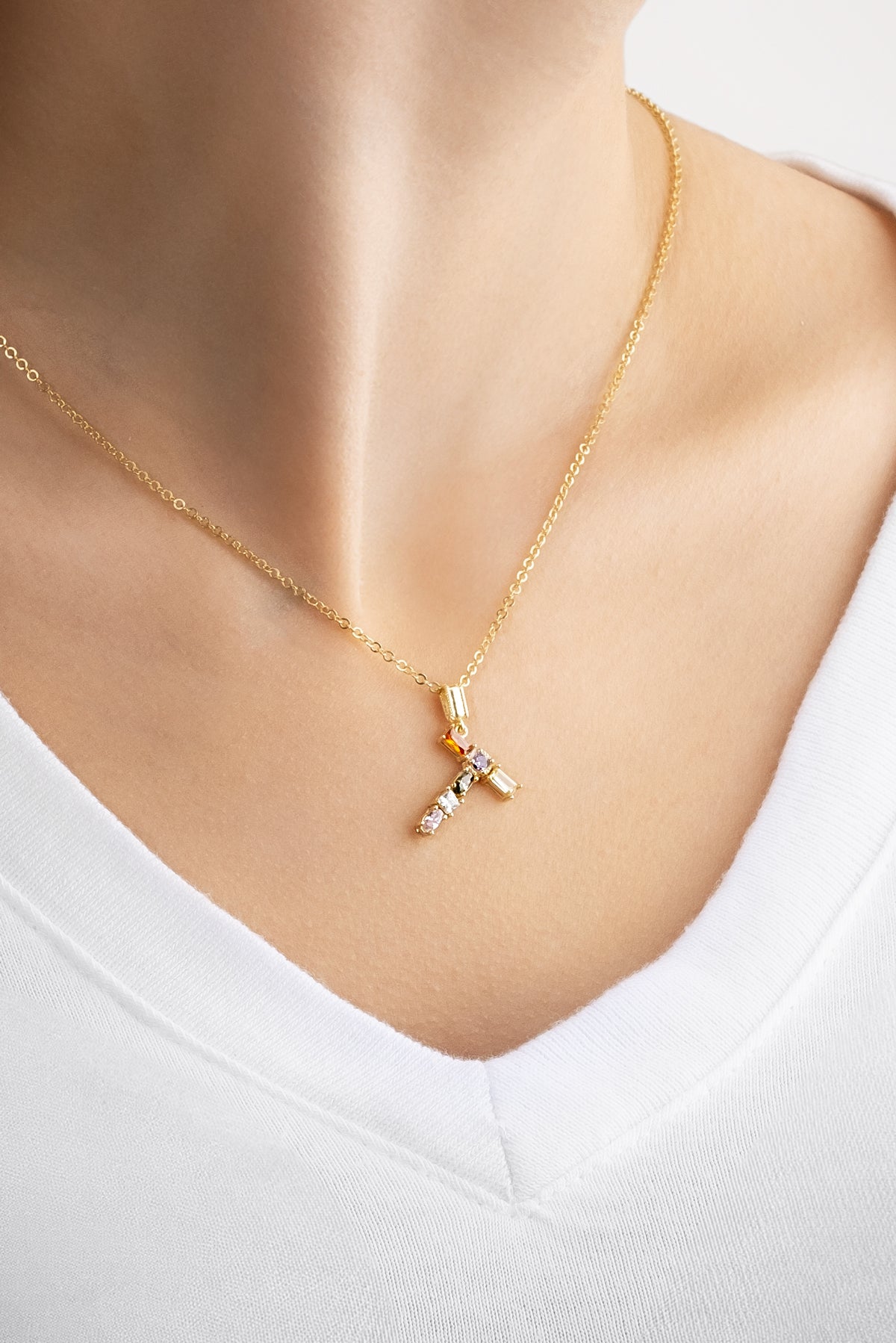 Mini T Harfi Günışığı Renkli 18 Ayar Sarı Altın Kaplama Gümüş Kolye 07300221344