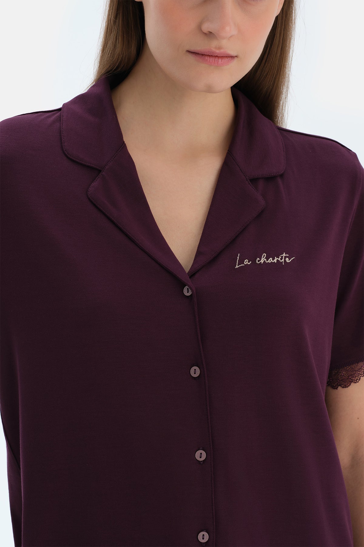 Mürdüm Nakış Ve Dantel Detaylı Gömlek Pantolon Pijama Takımı