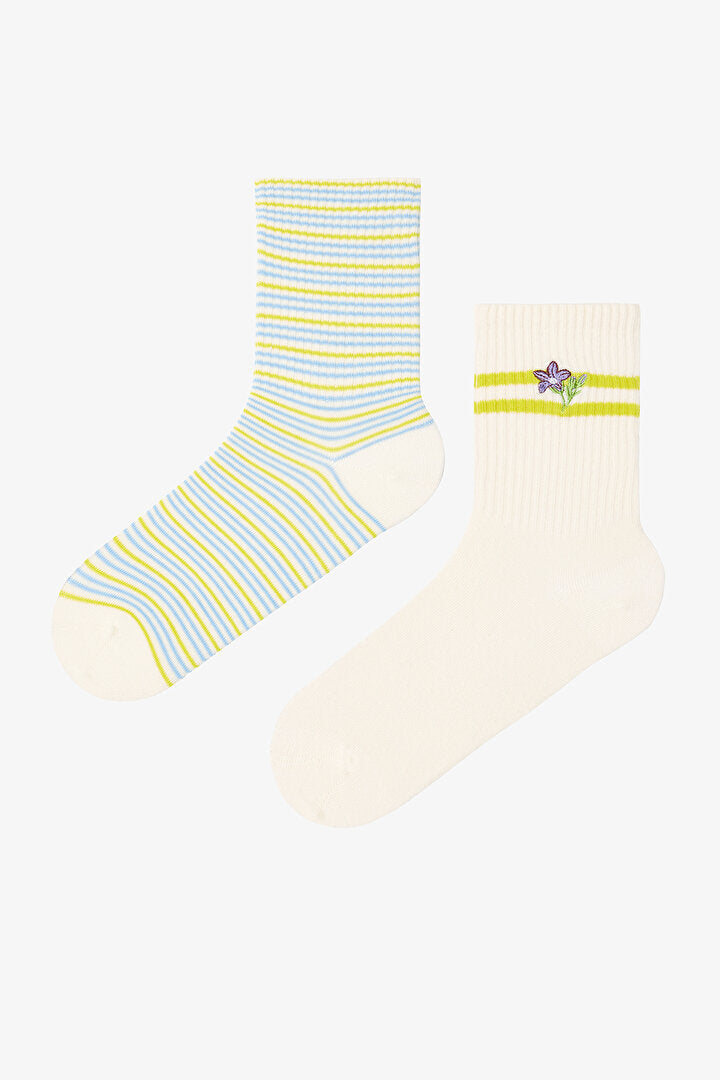 Stripe Flora 2'li Soket Çorap, sarı ve ecru renklere sahiptir. "Inspired by Flora" koleksiyonunun bir parçası olan bu çoraplar, çiçek desenleriyle doğanın zarafetini ayaklarına taşır. Birinci çorap komple çizgili tasarıma sahipken, ikinci çorap bilek kısmındaki çiçek nakışı ve şerit detaylarıyla zarif bir dokunuş katar. Paket içerisinde 2 çift çorap bulunur. Bu şık ve rahat çoraplarla tarzını tamamla!