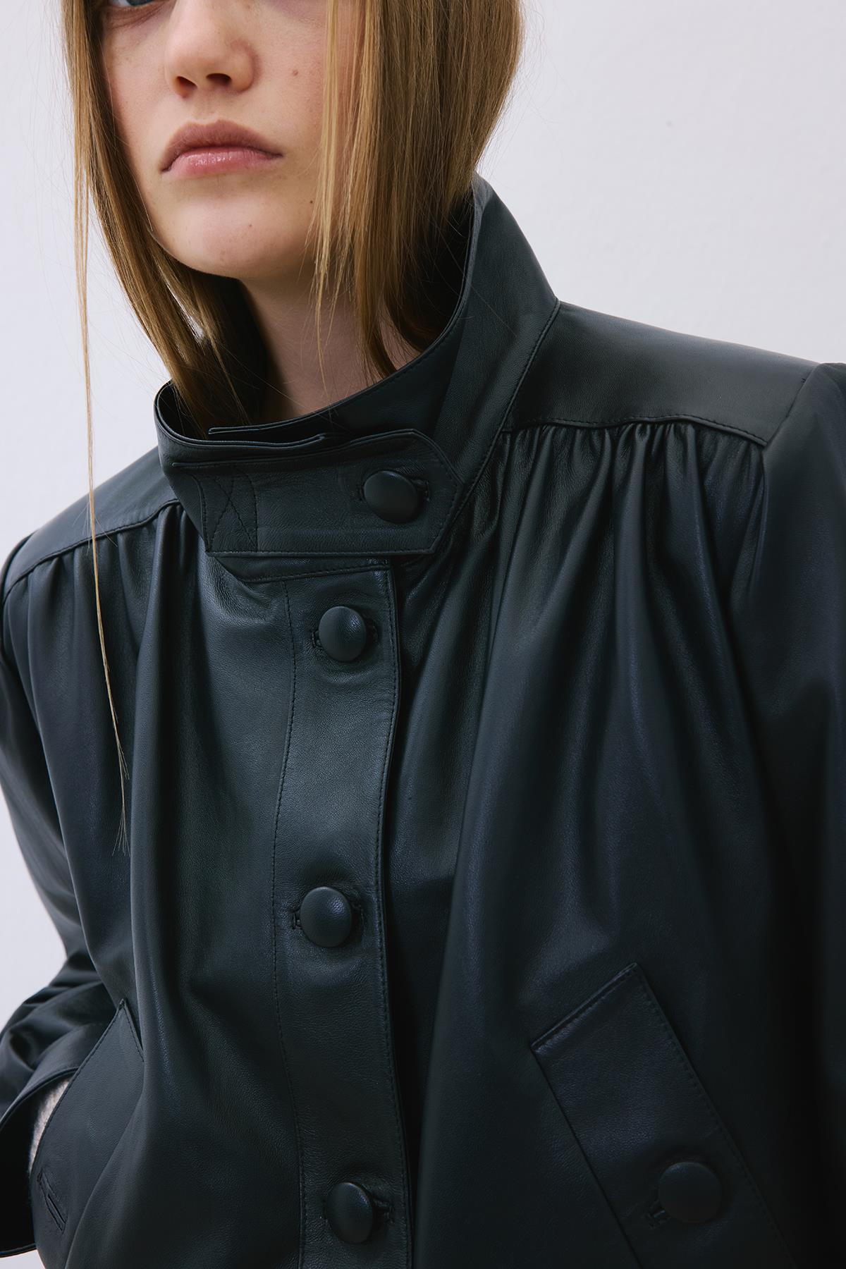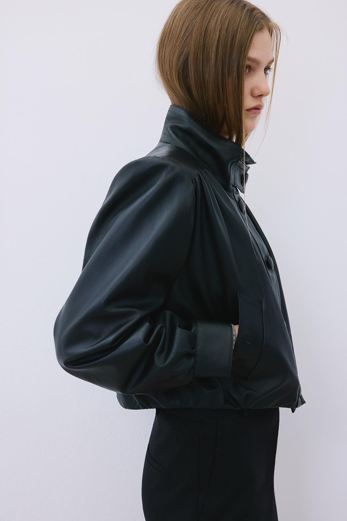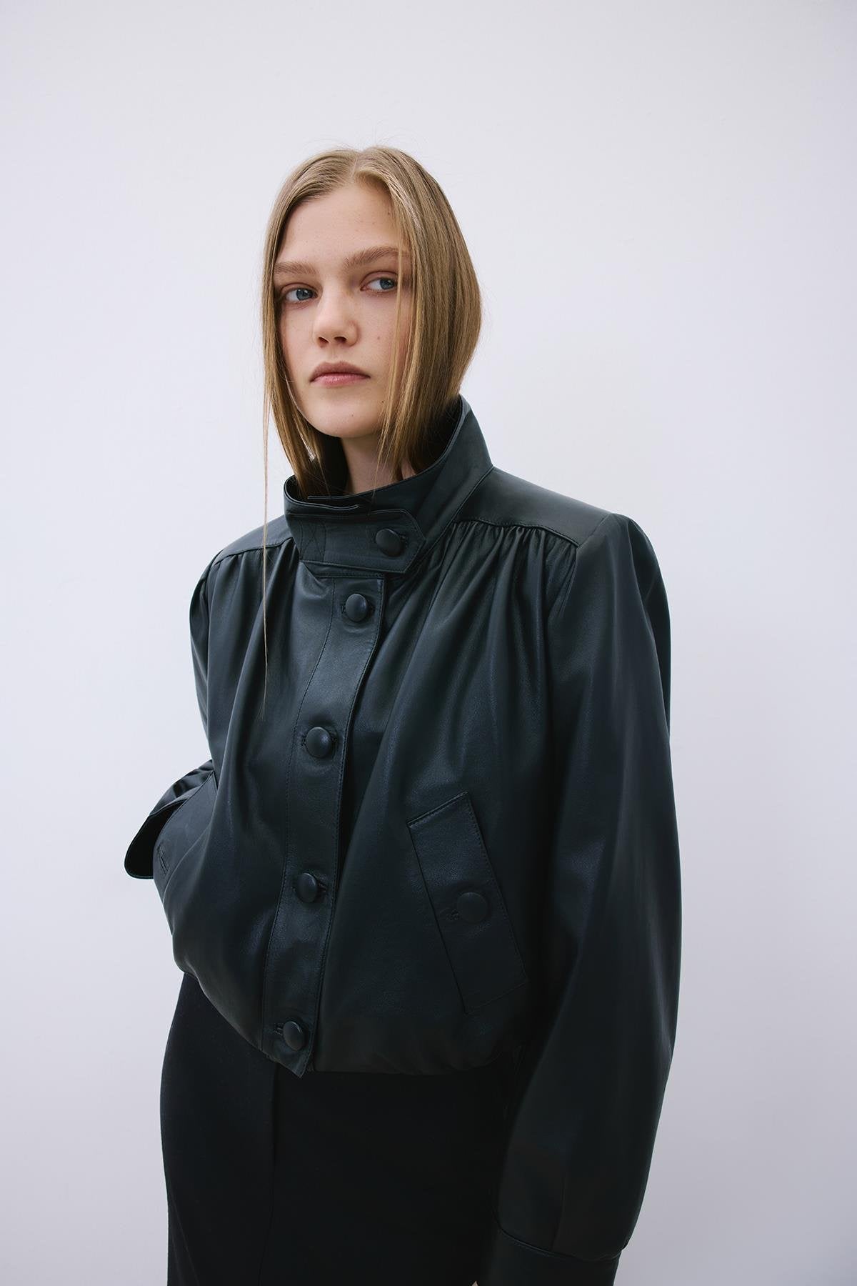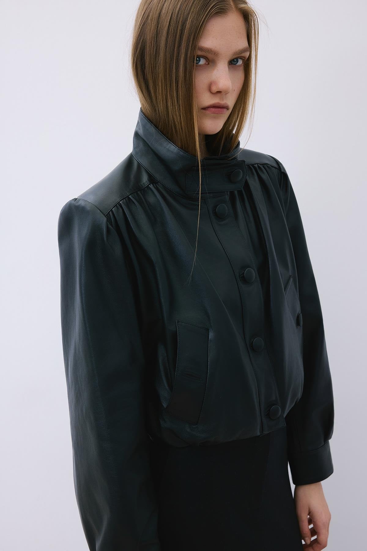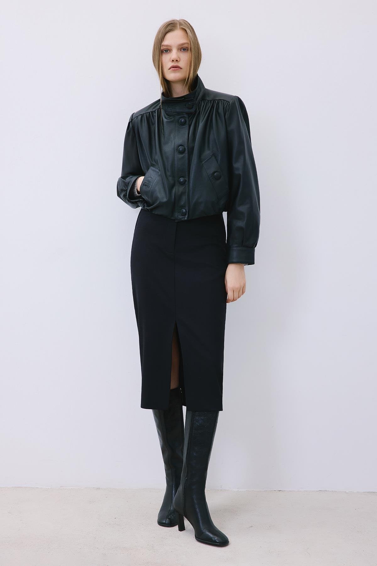 Dik Yaka Hakiki Deri Crop Siyah Ceket