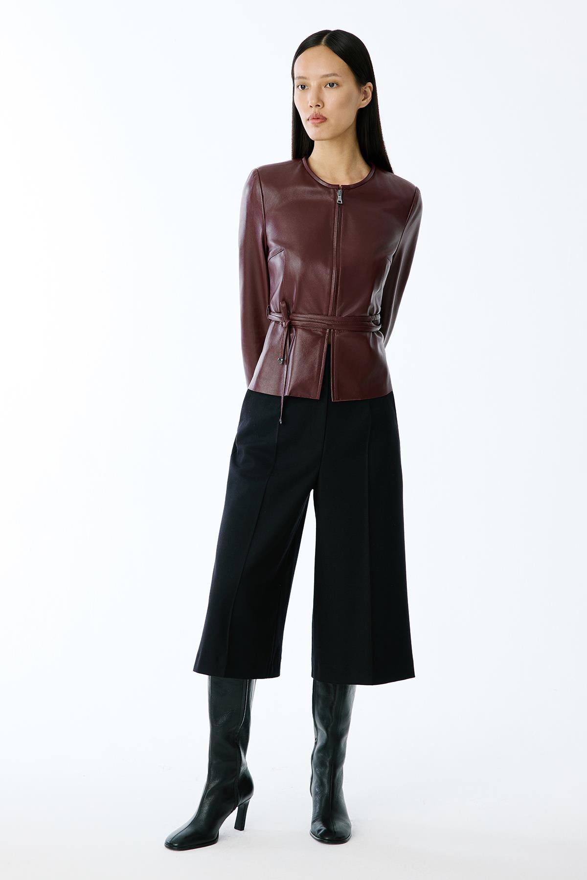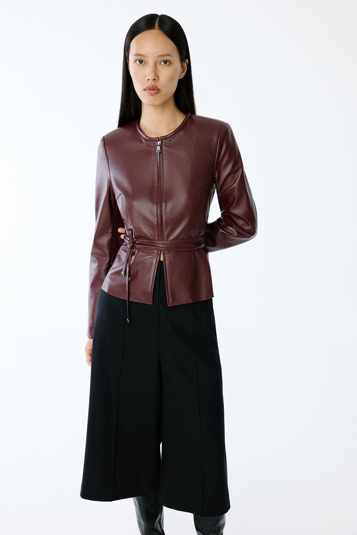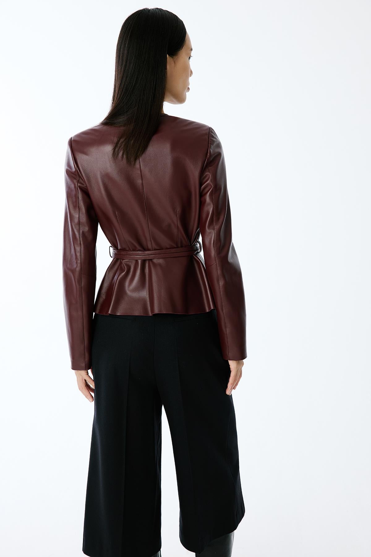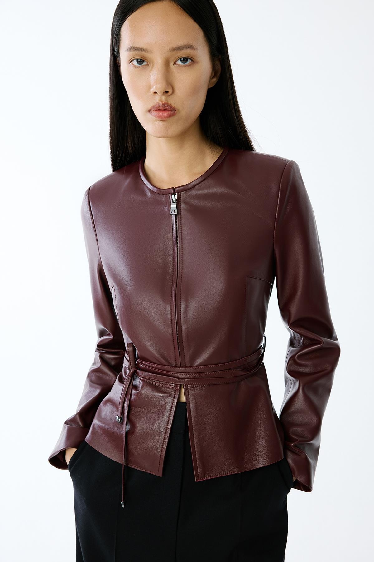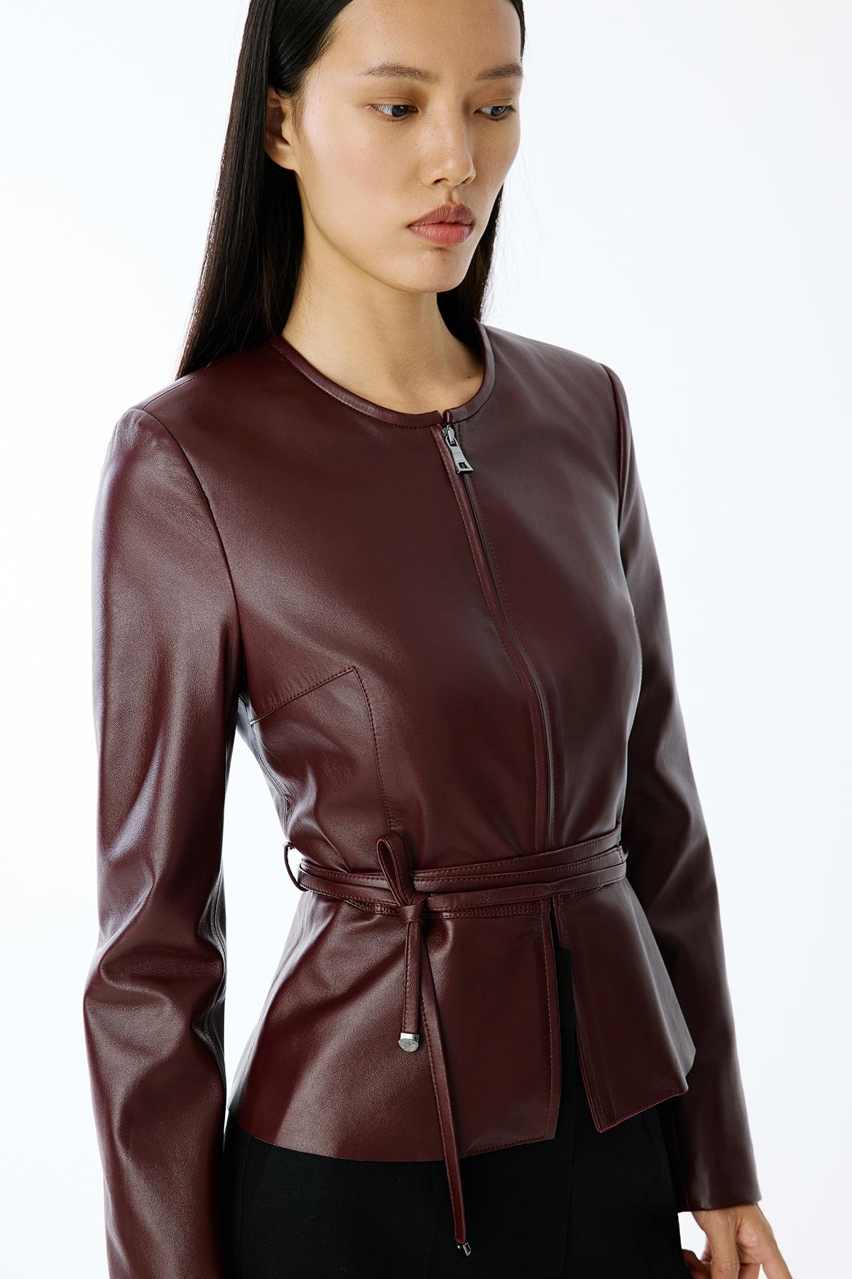 Hakiki Deri Sıfır Yaka Bordo Ceket