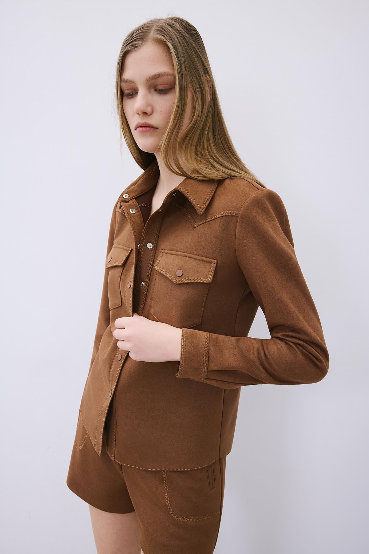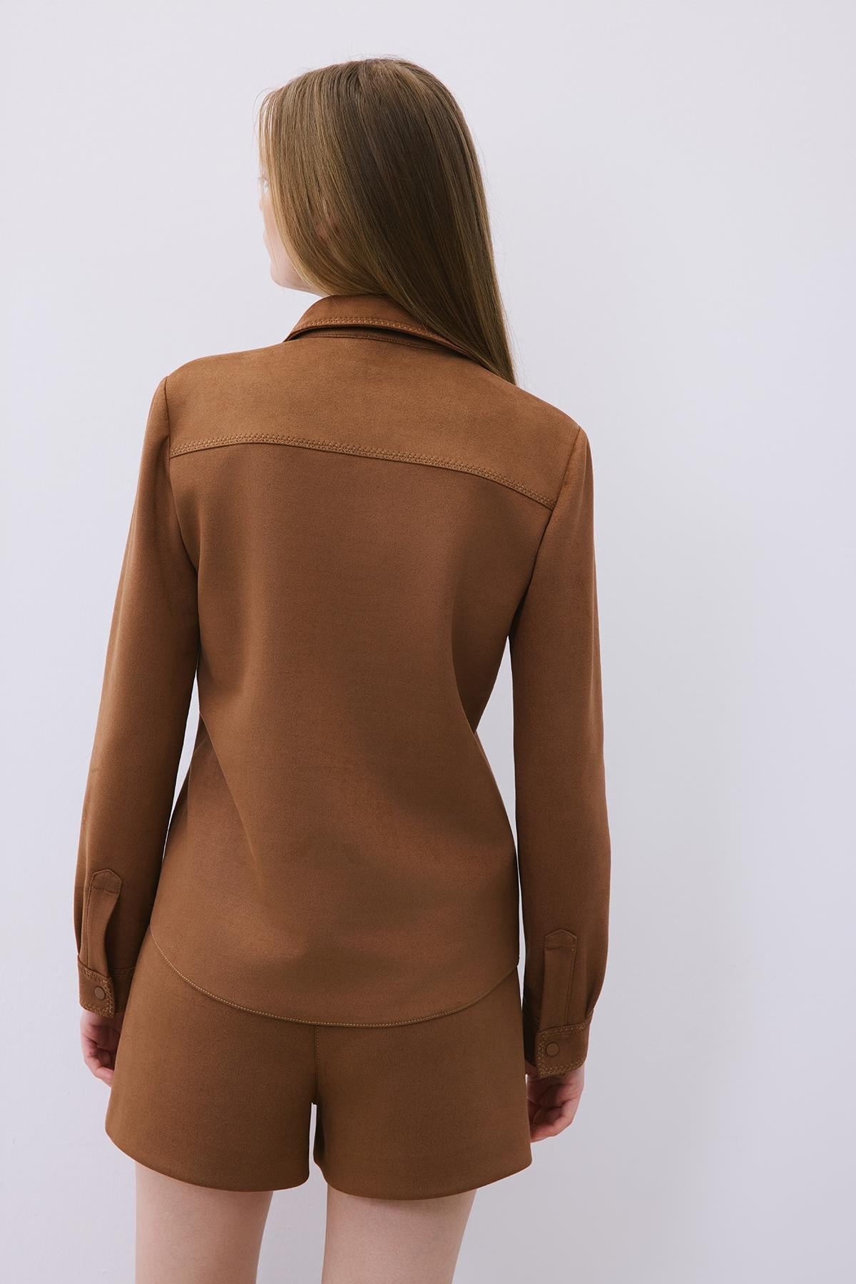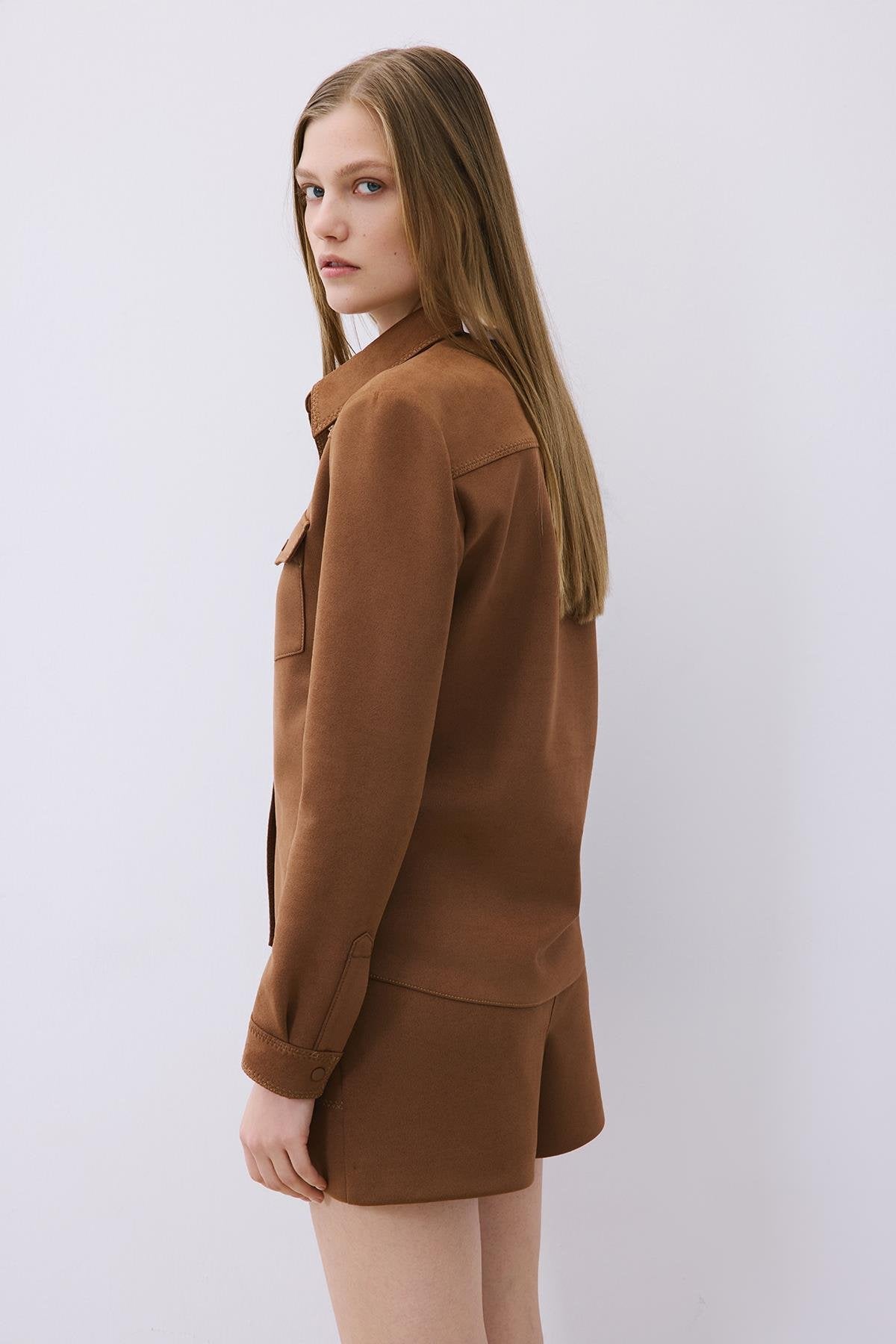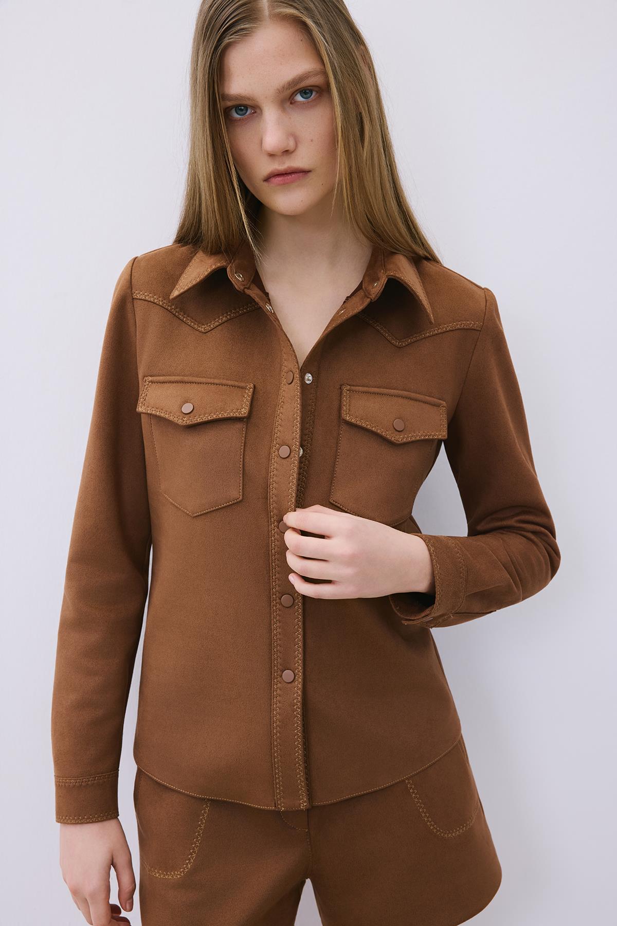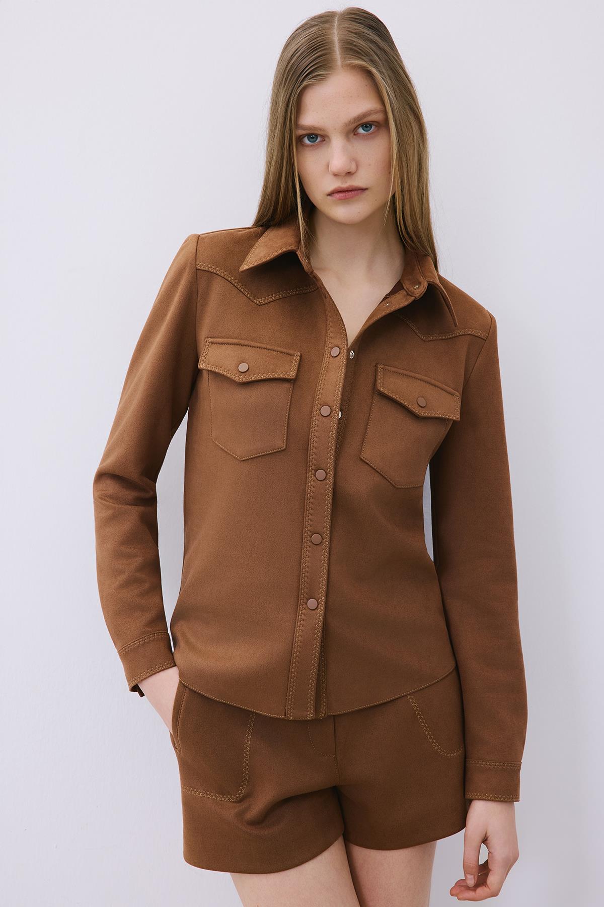 Kontrast Dikişli Süet Kahve Gömlek