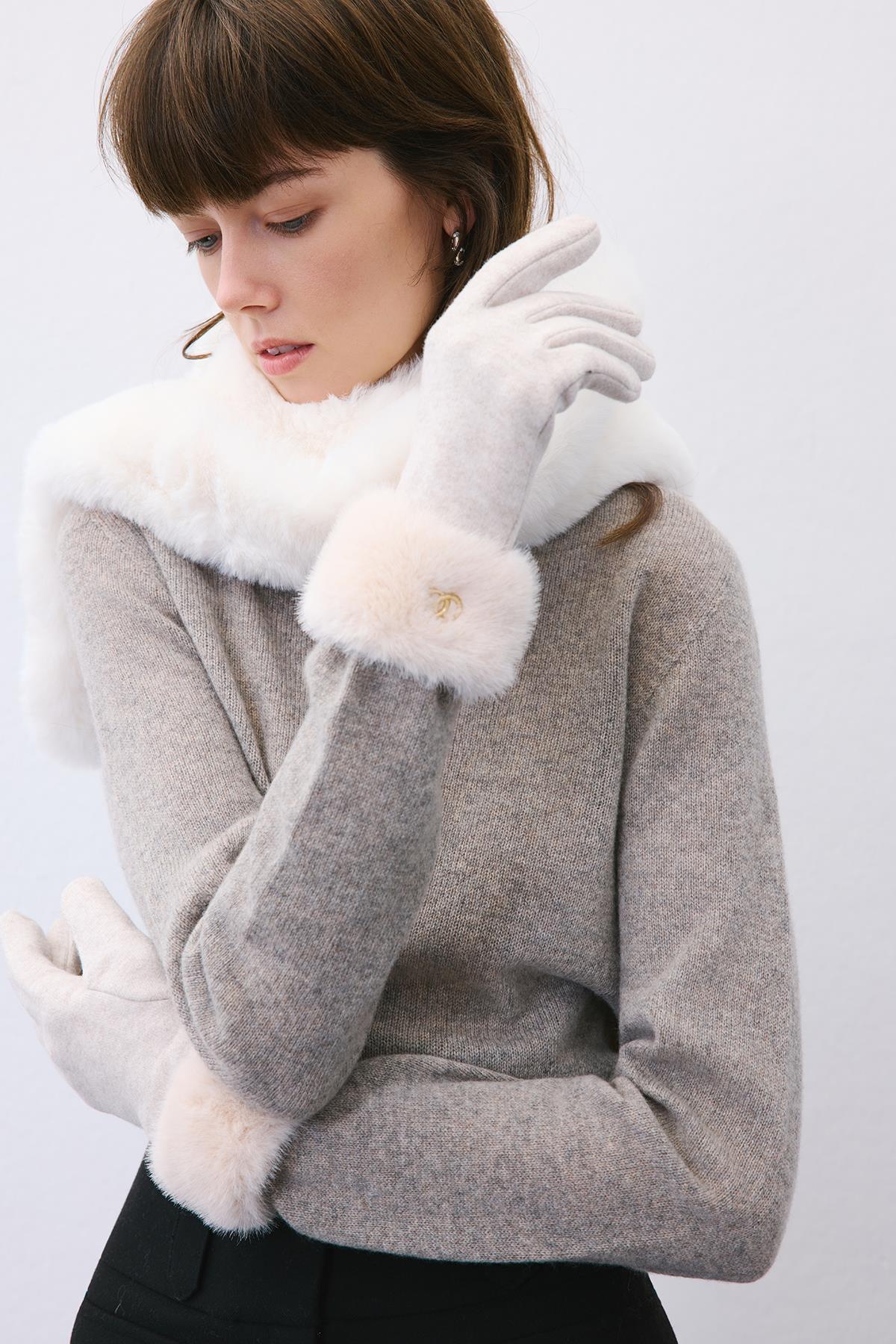 Kürk Detaylı Bej Dokunmatik Eldiven