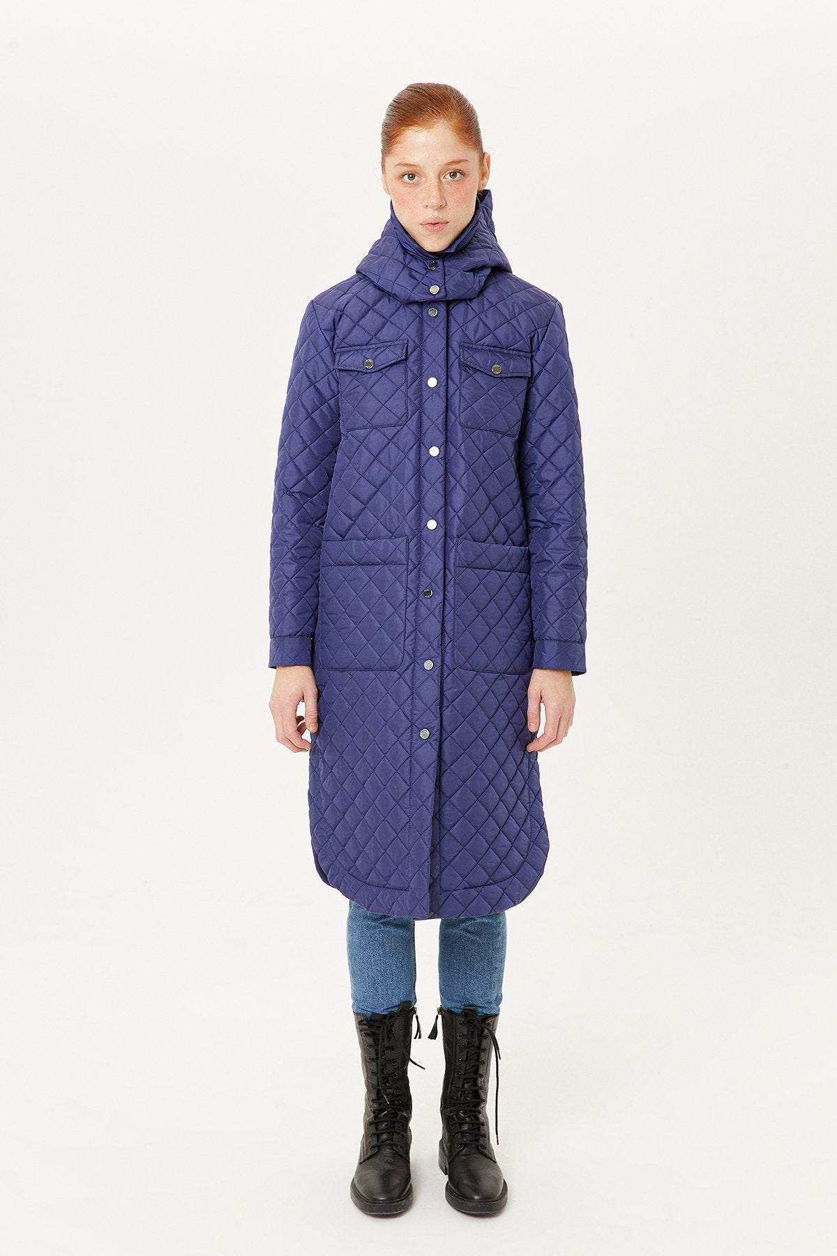 Lacivert Kapüşonlu Kapitone Uzun Mont