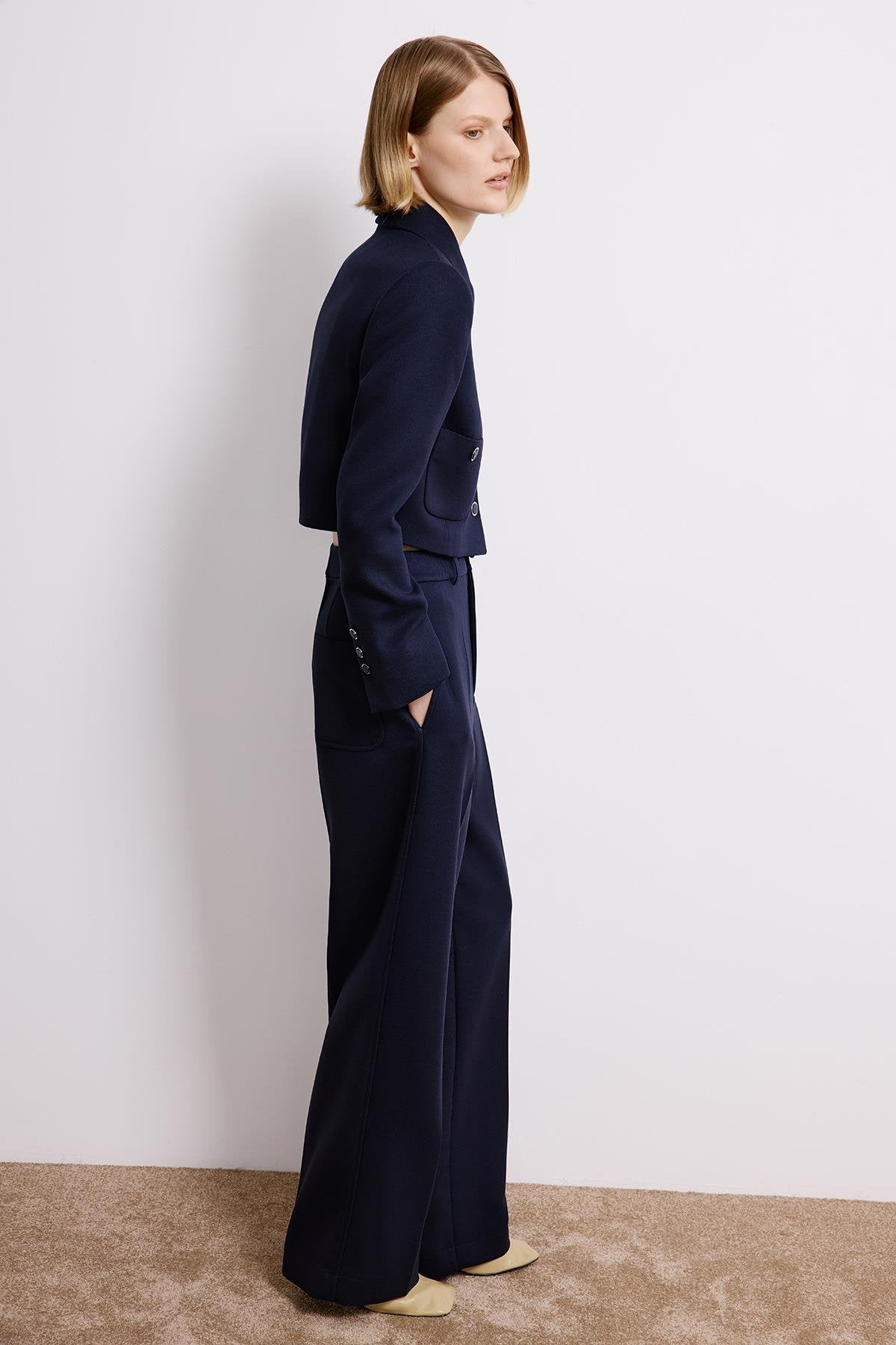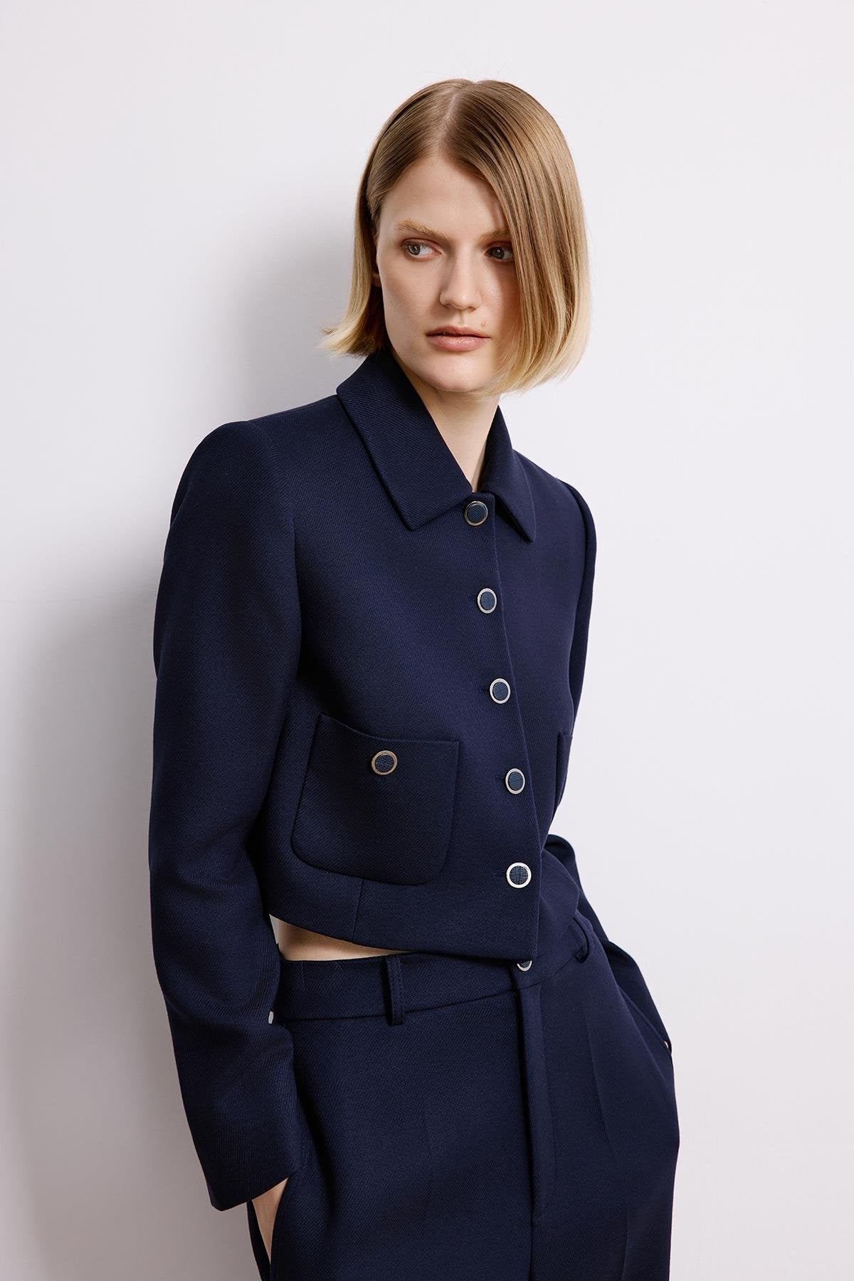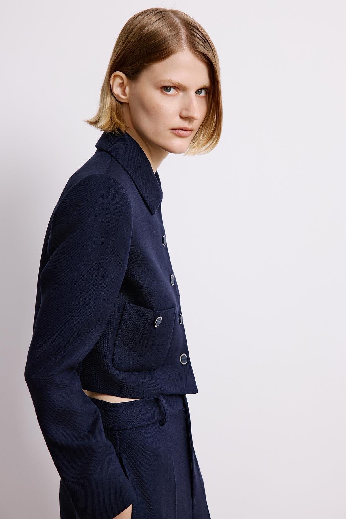 Metal Düğmeli Lacivert Crop Ceket