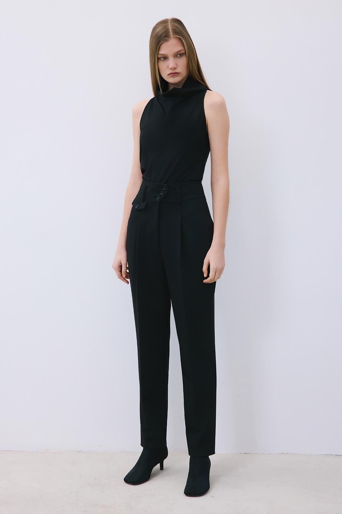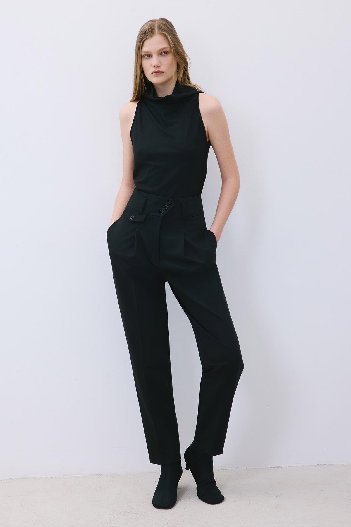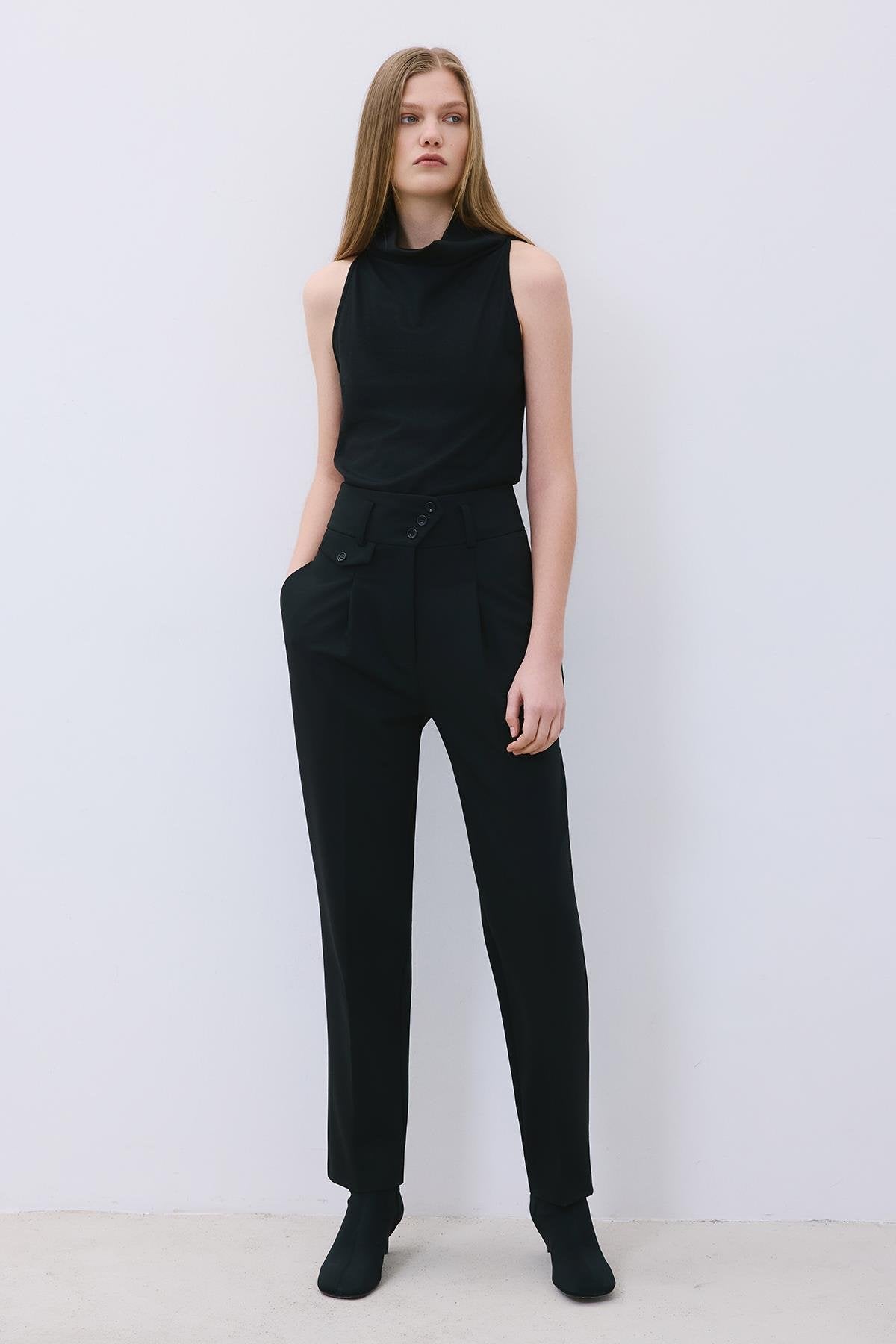 Pileli Dar Paça Yüksek Bel Siyah Pantolon