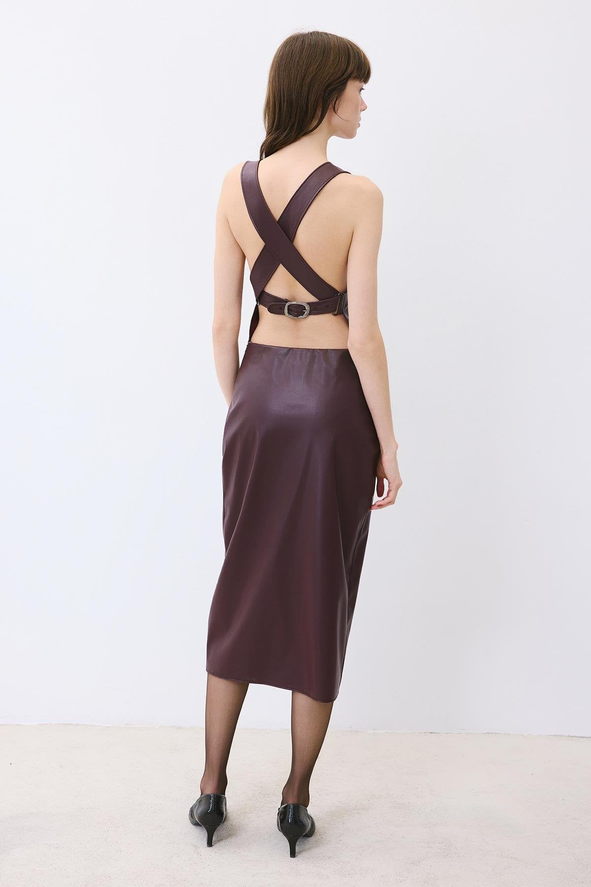 Sırt Dekolteli Mürdüm Midi Deri Elbise
