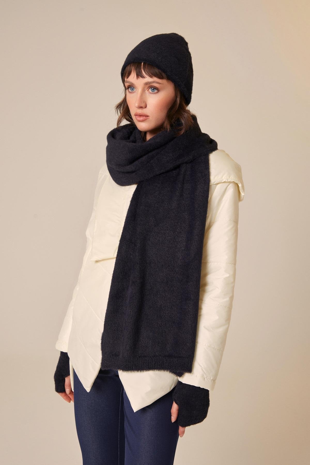 Tüylü Siyah Yumuşak Atkı