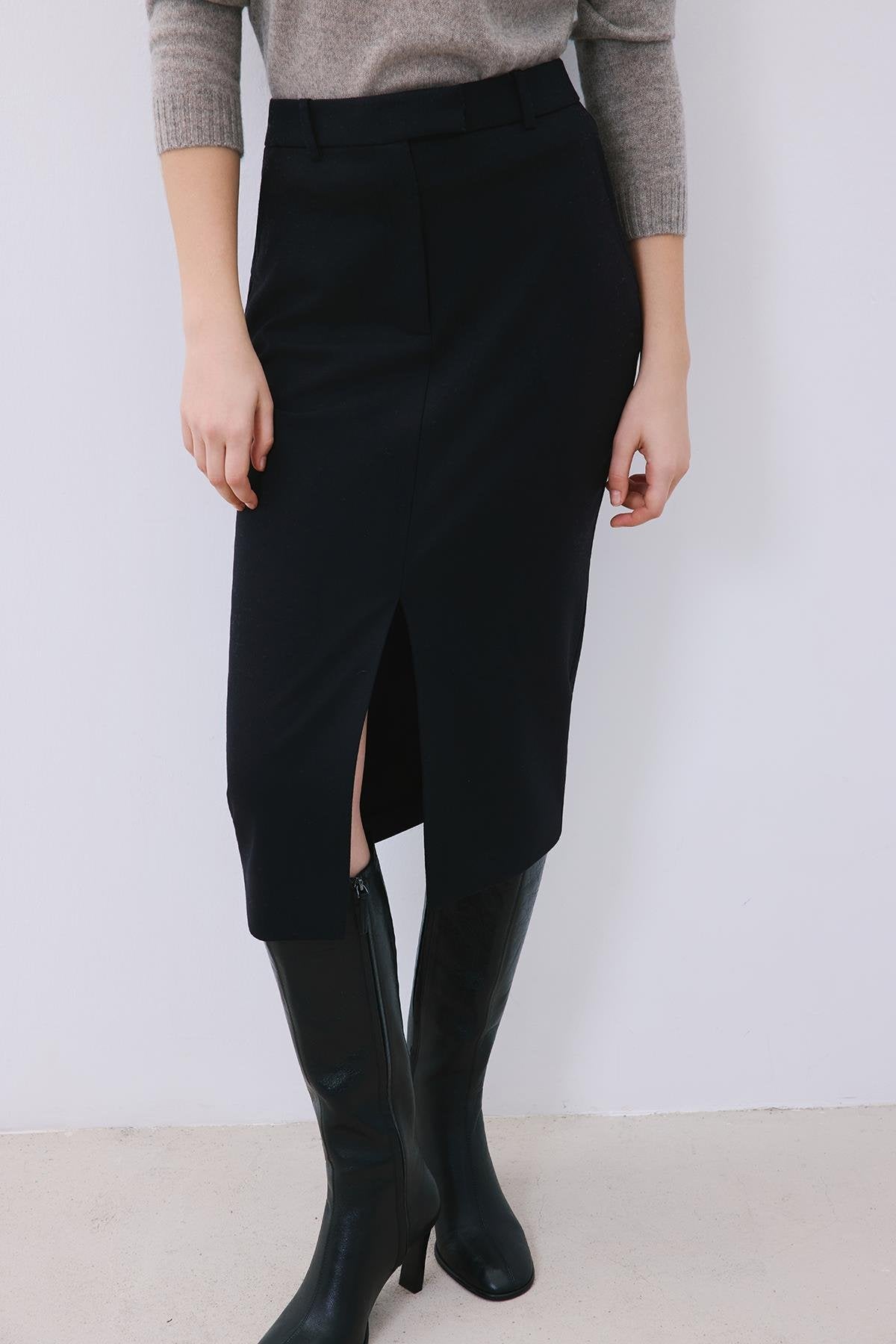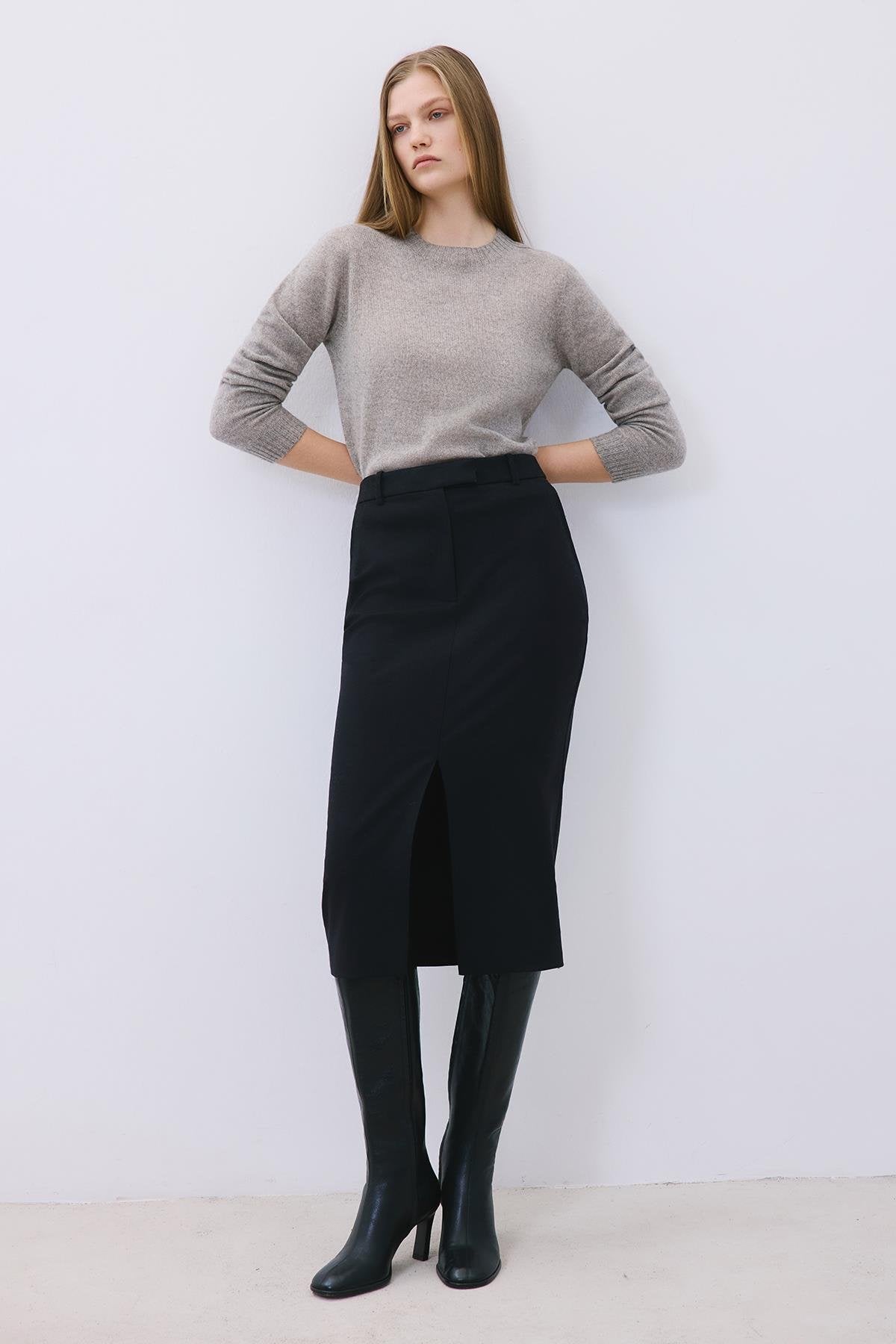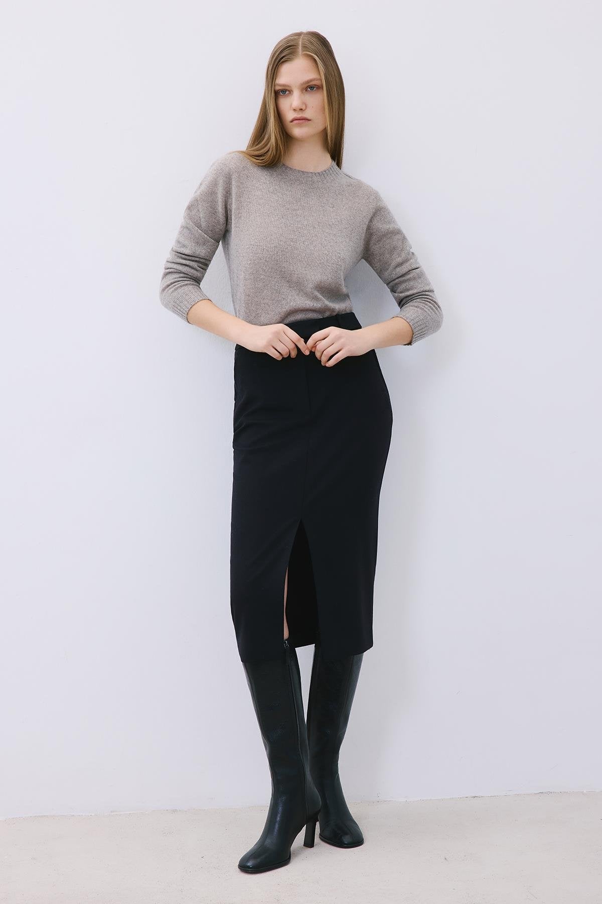 Yırtmaç Detaylı Yün Dokulu Siyah Midi Etek