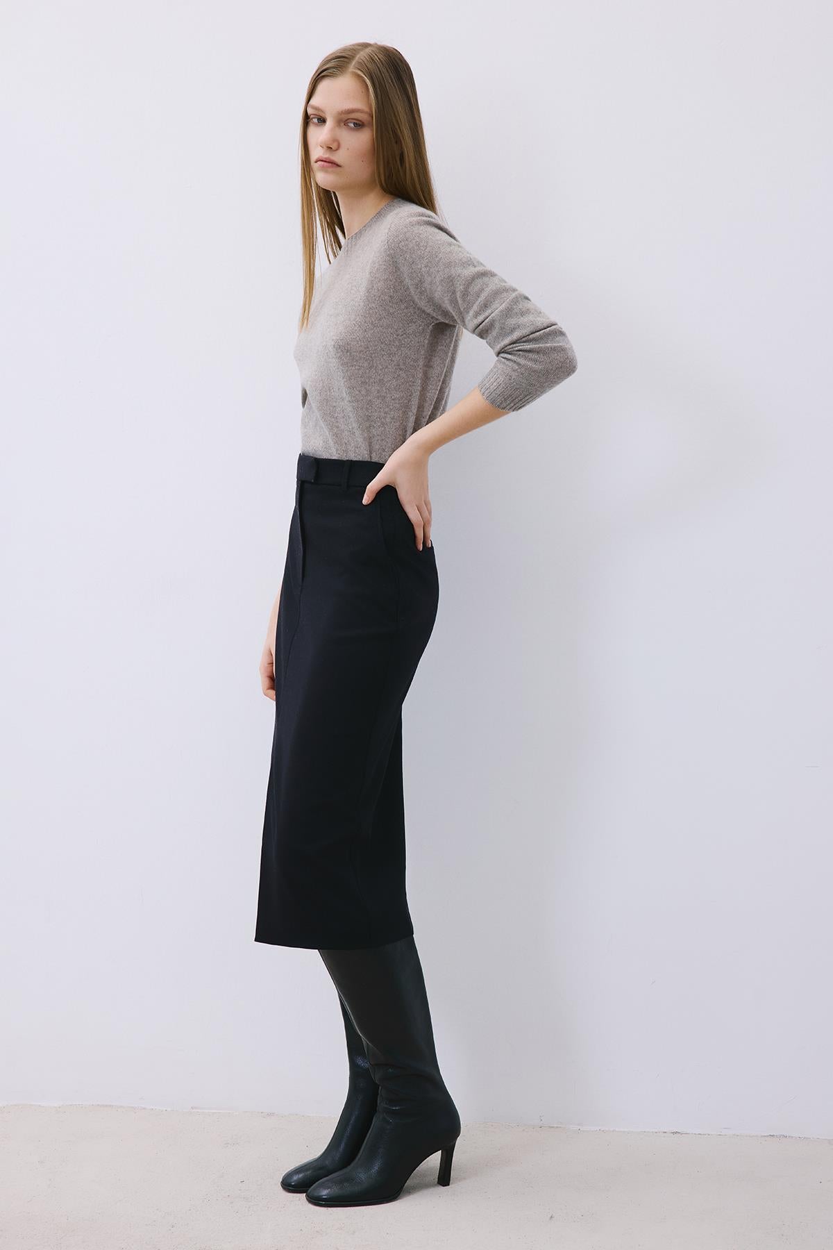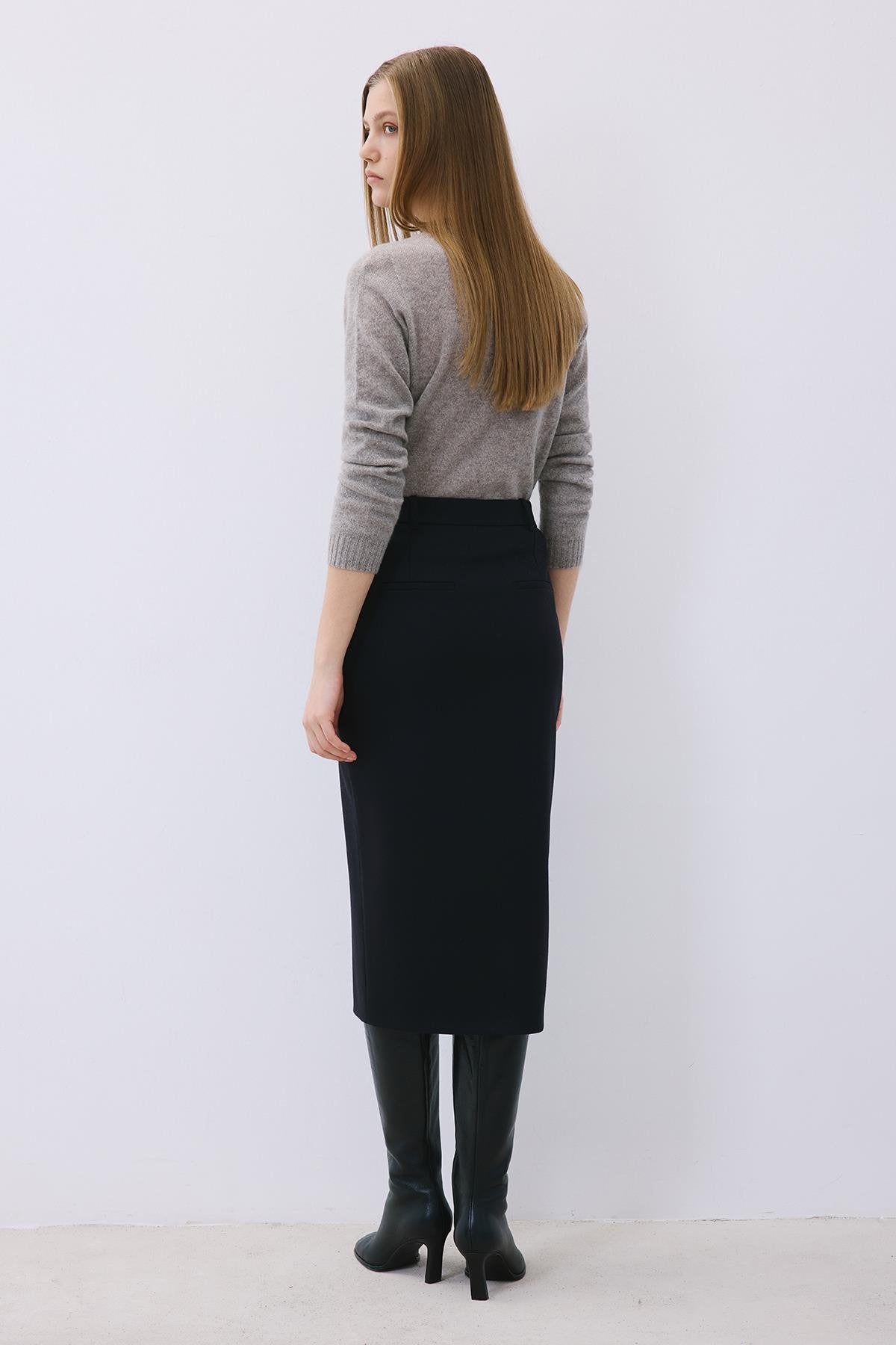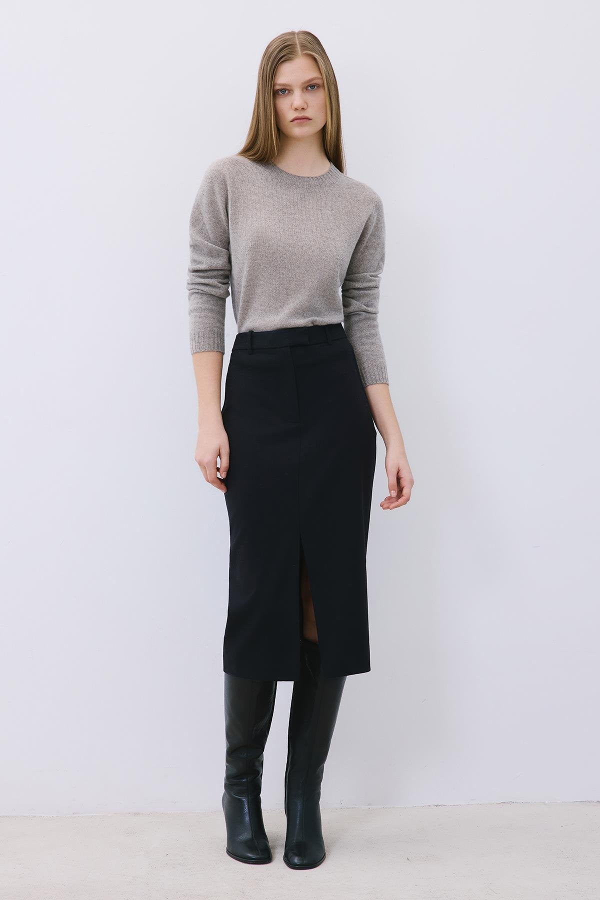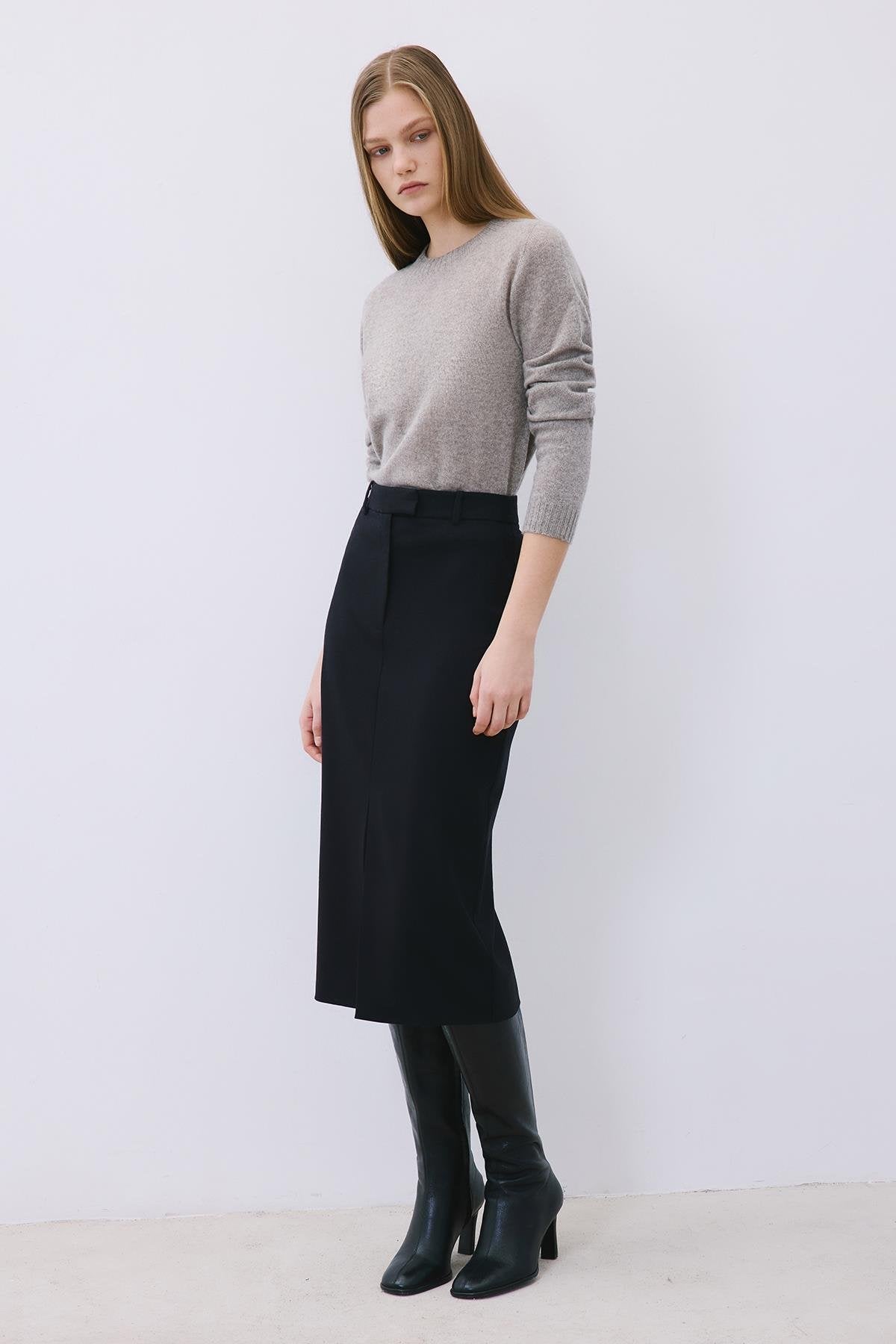 Yırtmaç Detaylı Yün Dokulu Siyah Midi Etek