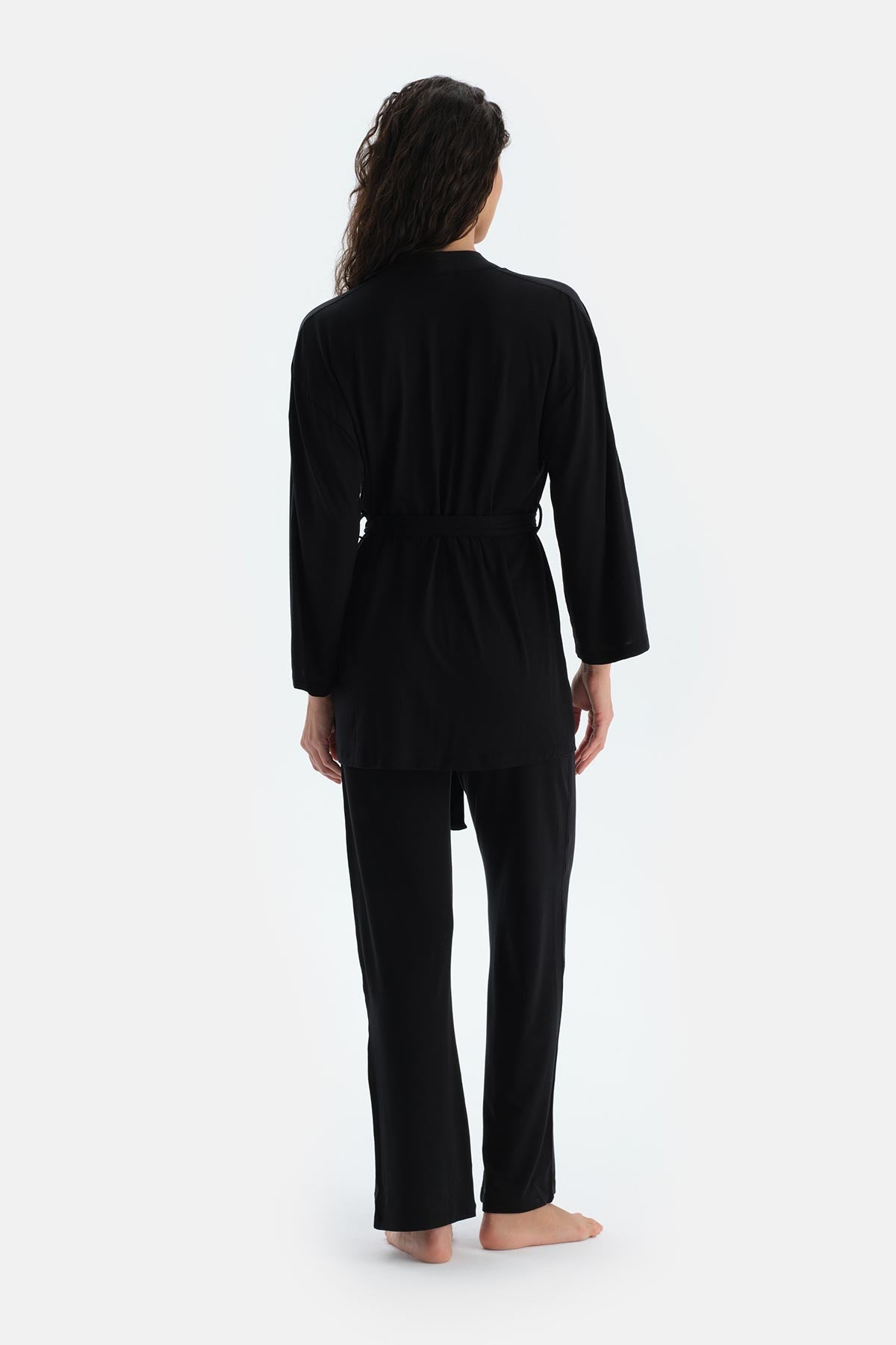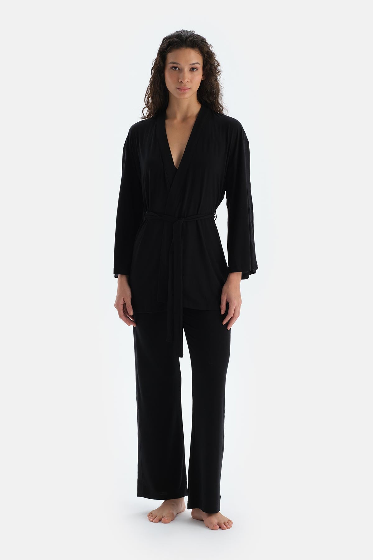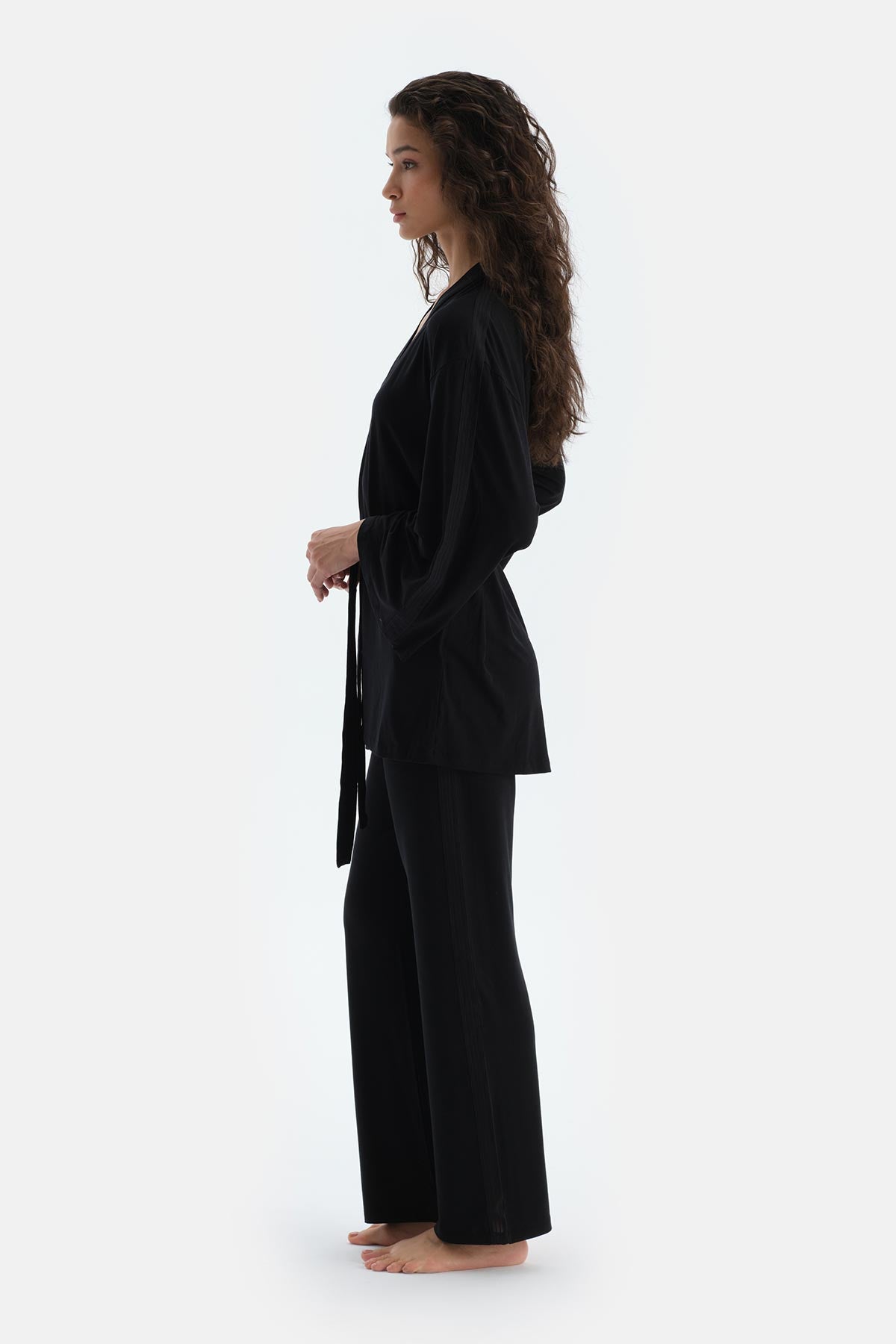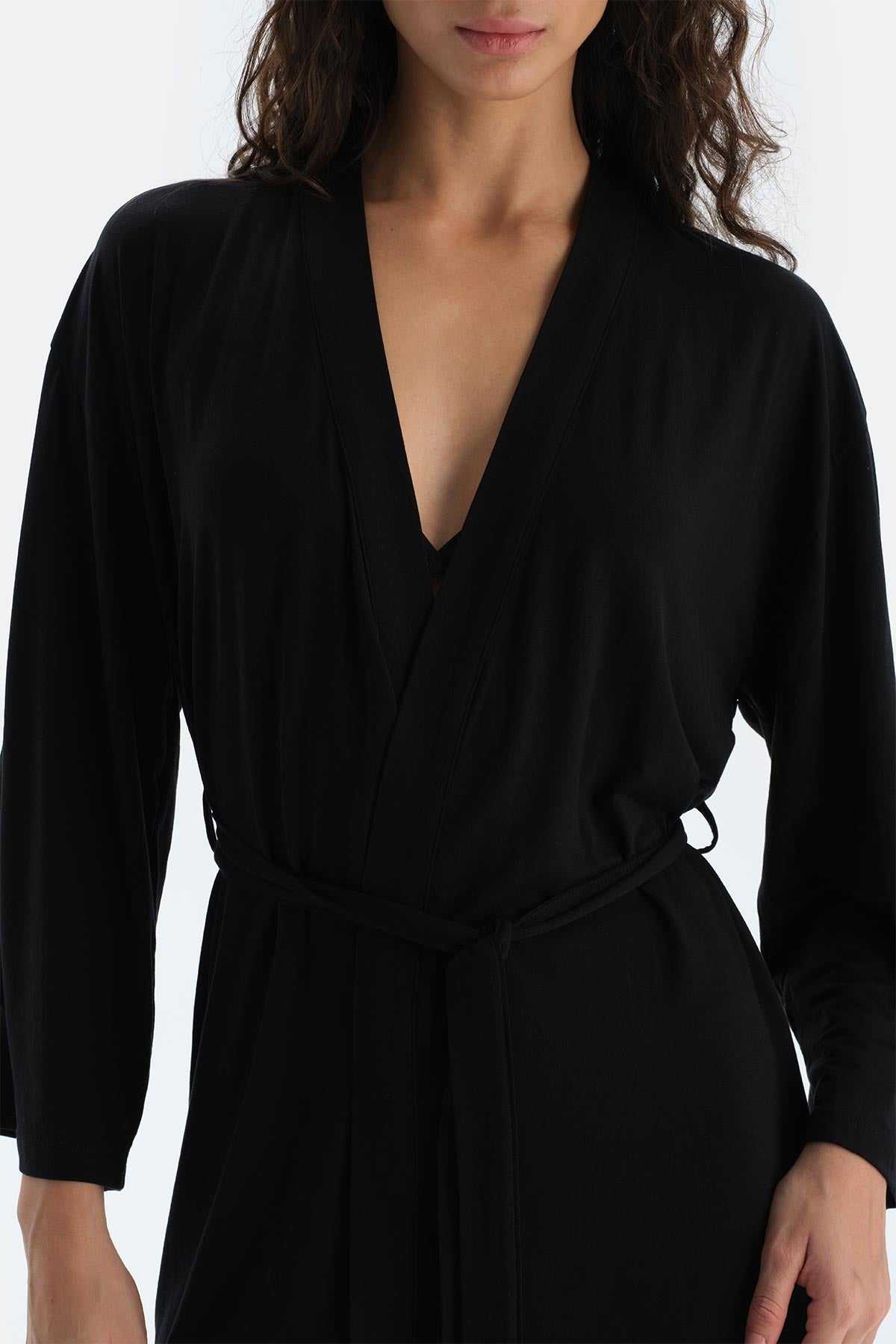 Siyah Bağlama Ve Kol Şerit Dantel Detaylı Basıc Sabahlık 25SW19100MA_366 şimdi Dagi'de. Kaliteli, konforlu ve özel fiyatlarla sizleri bekliyor.